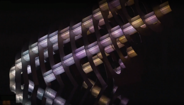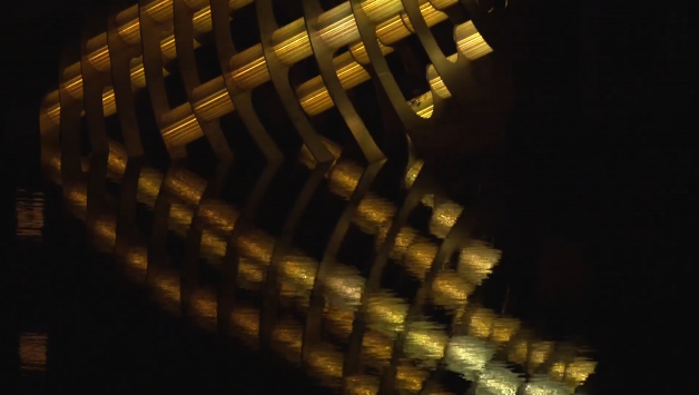 The design concerns a rabbit-shaped outer shape, divided into steel smooth discs of stainless steel with printed 'vertebrae' of recycled 3D printed polycarbonate. These intervertebral are transparent tubes in which LED is incorporated. Film recordings of waves, shot at various locations, including the sea nearby, alternate with each other, rippling, rough or with a reflection in the water.