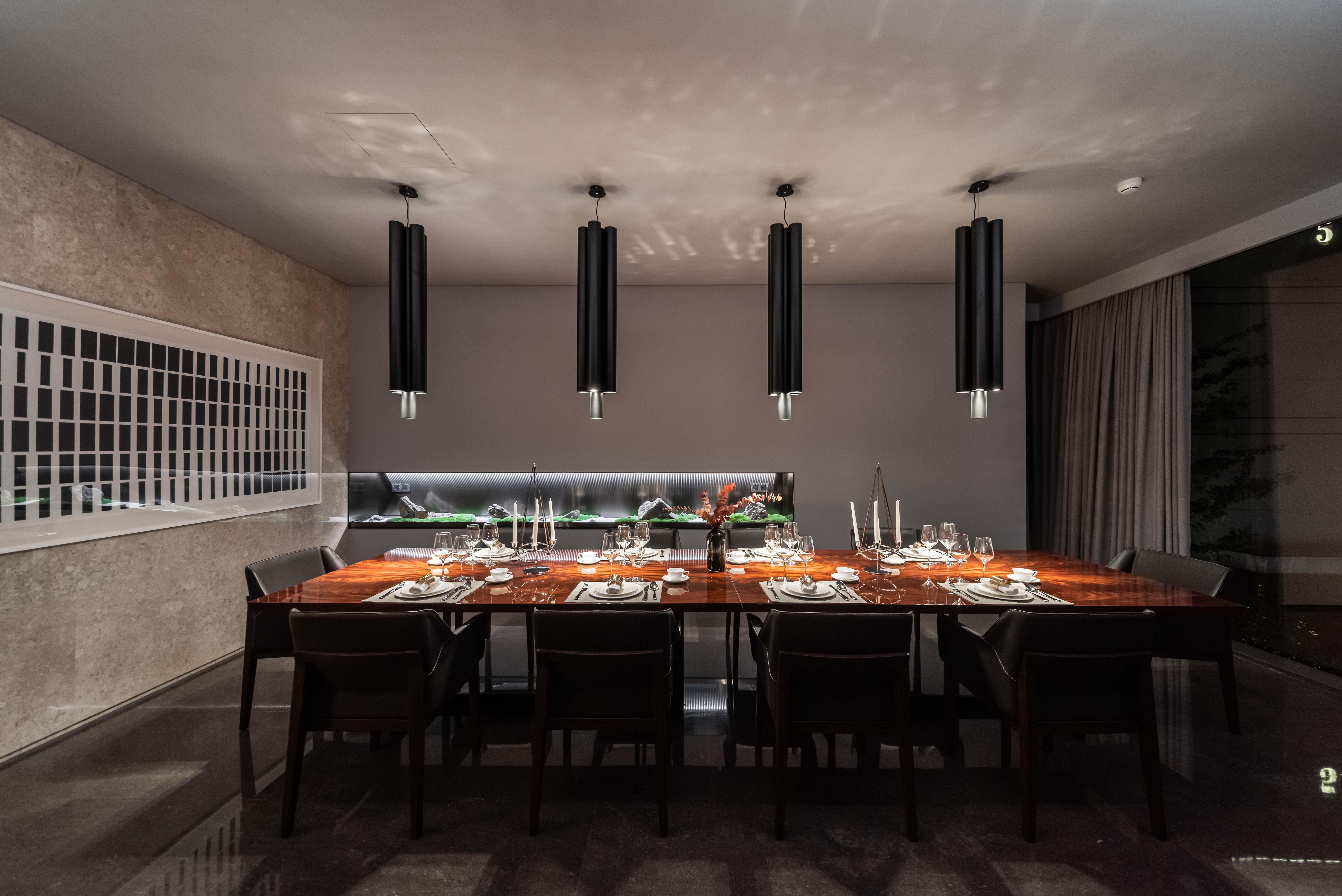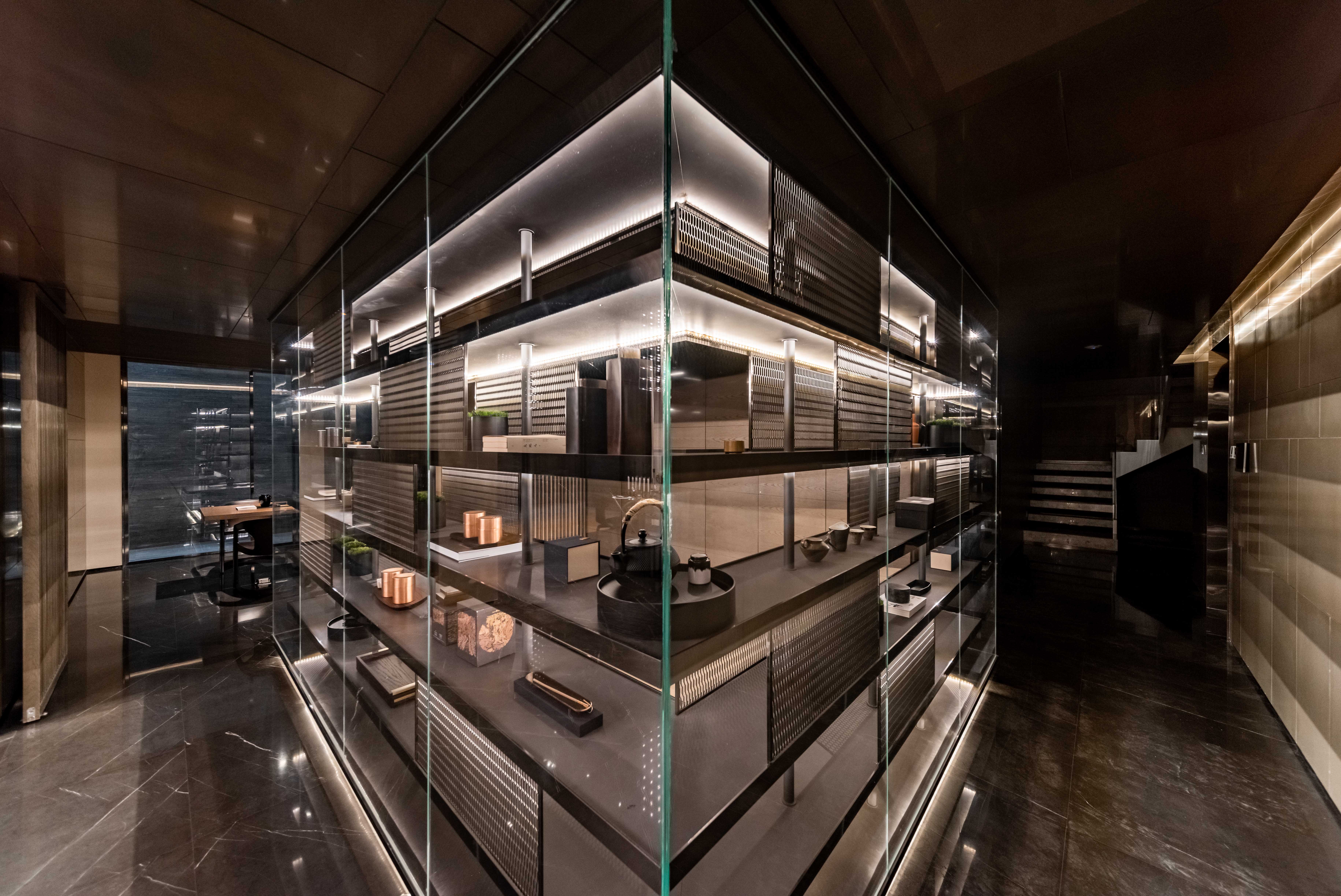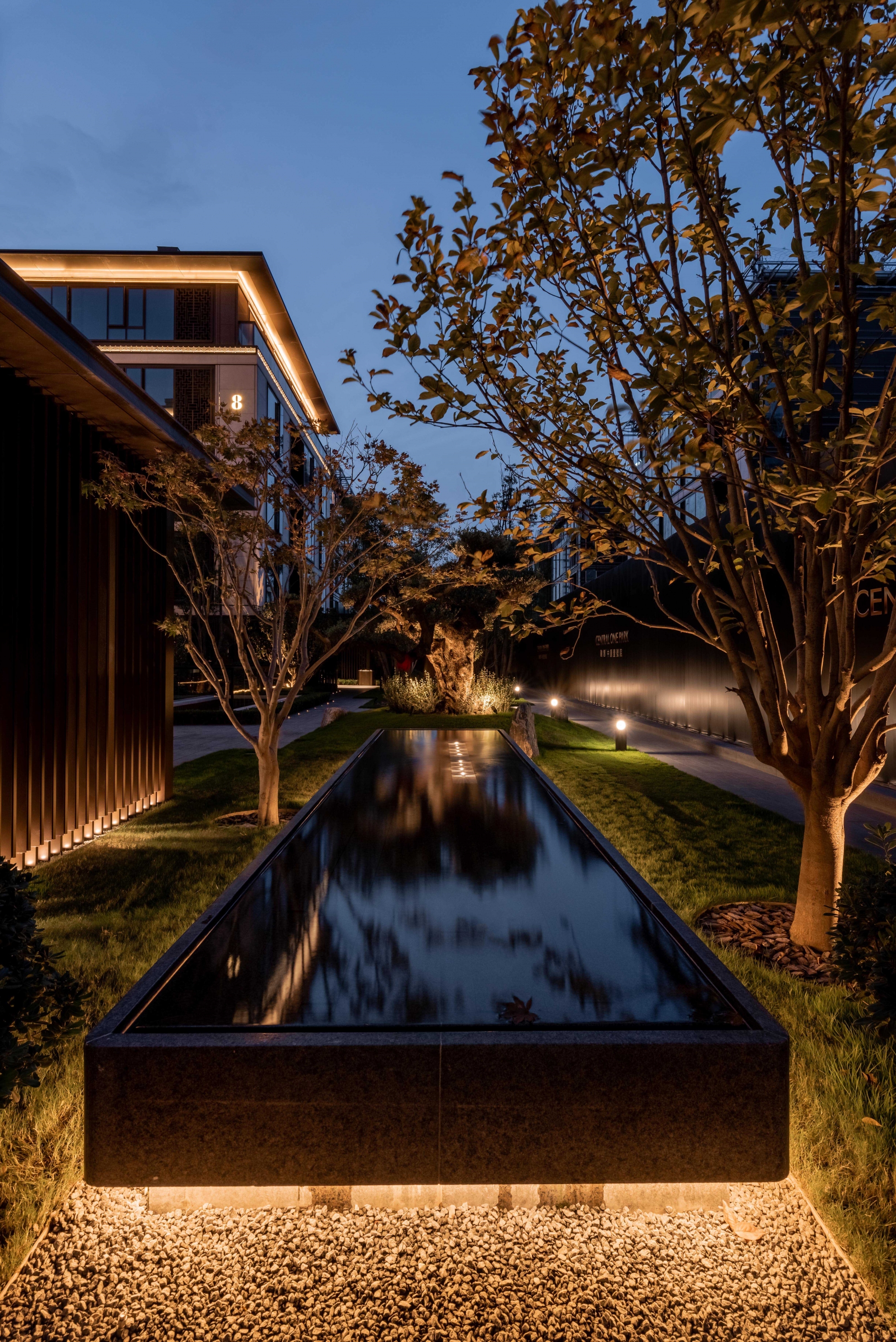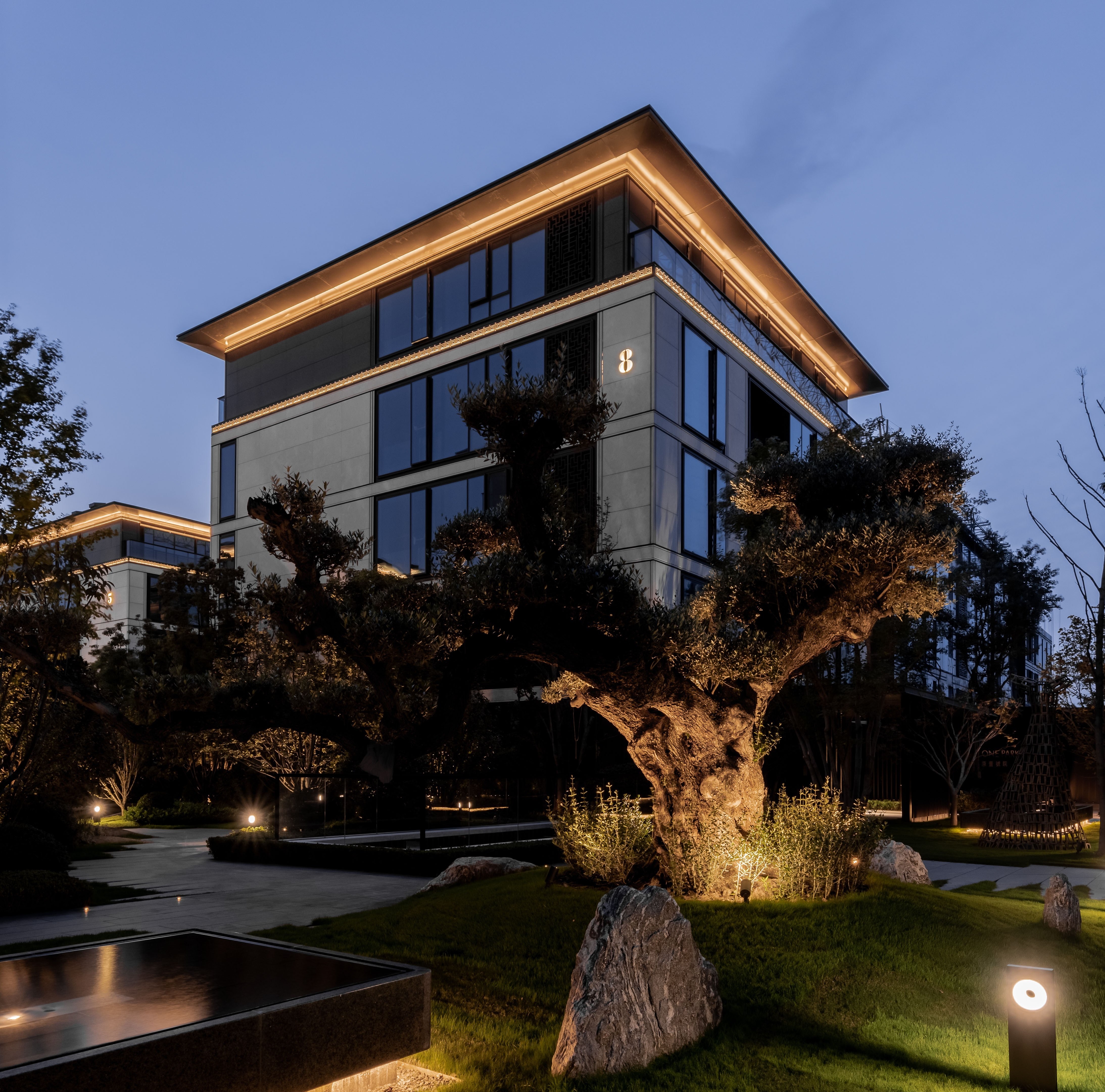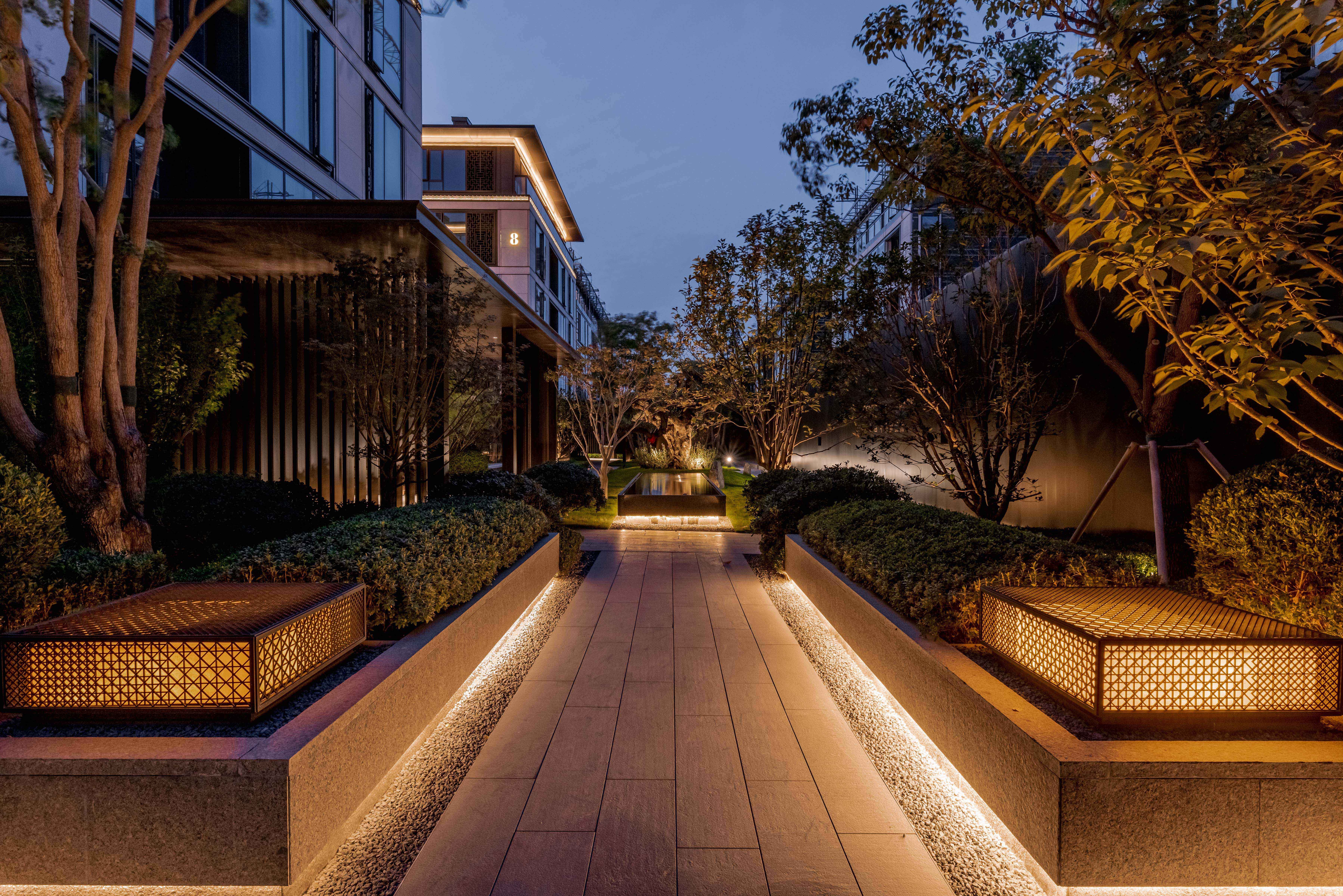 The lighting design naturally reveal the details of "Rites of Zhou" with its square and rectangular grid lines that have been merged into the architectural and landscape design of this high-end residence, thus creating a choreography between light and shadow that divulge the elegance of Chinese architecture.