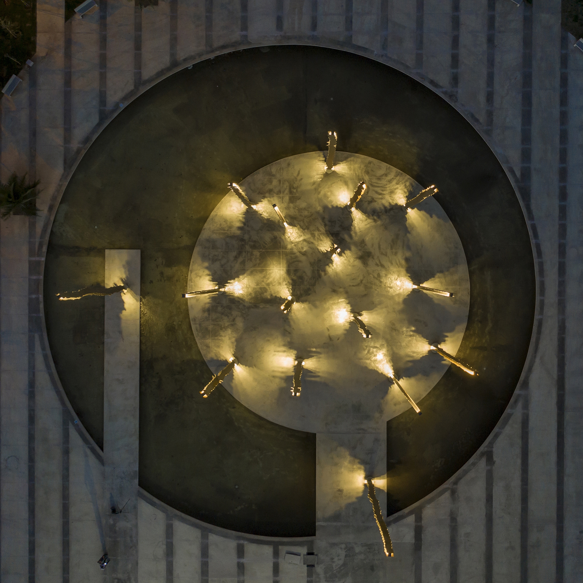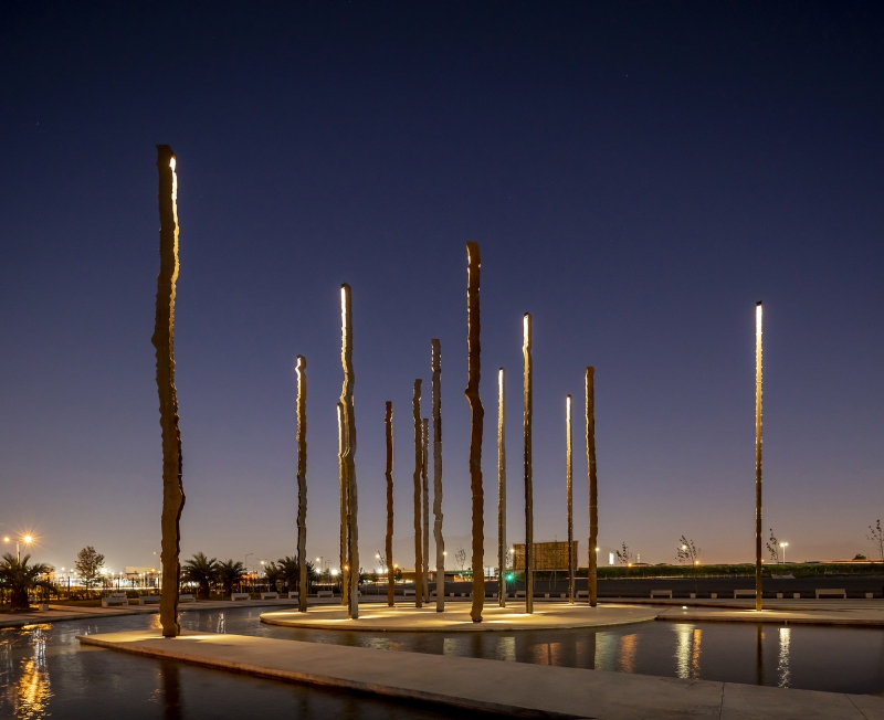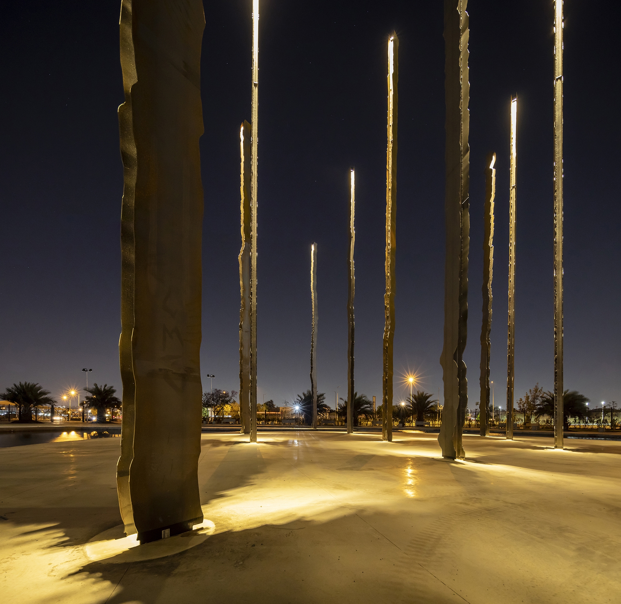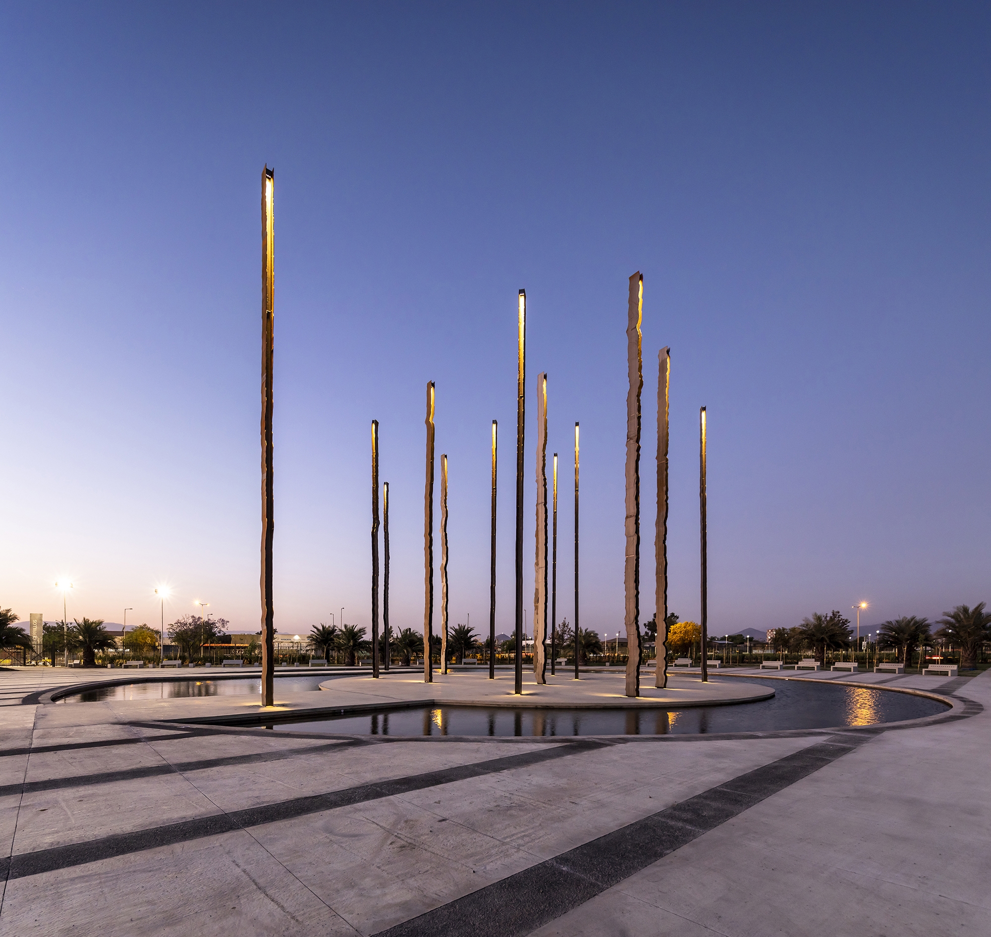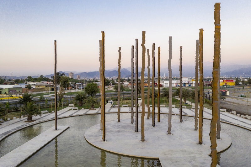 The artist Fernando Prats designed 16 iron columns and distribute them on a circular concrete surface surrounded by a water mirror that establish a real and symbolic connection between the vertical and the horizontal of the skyline of Andes Mountain