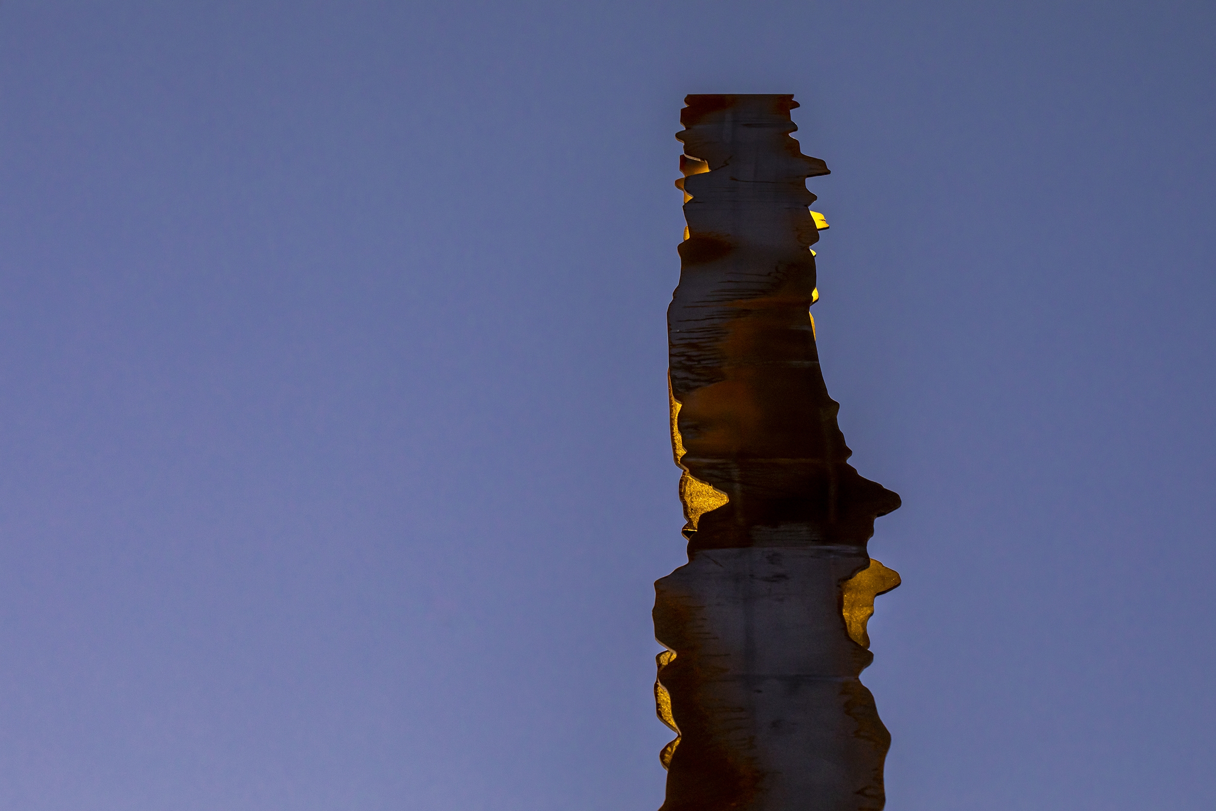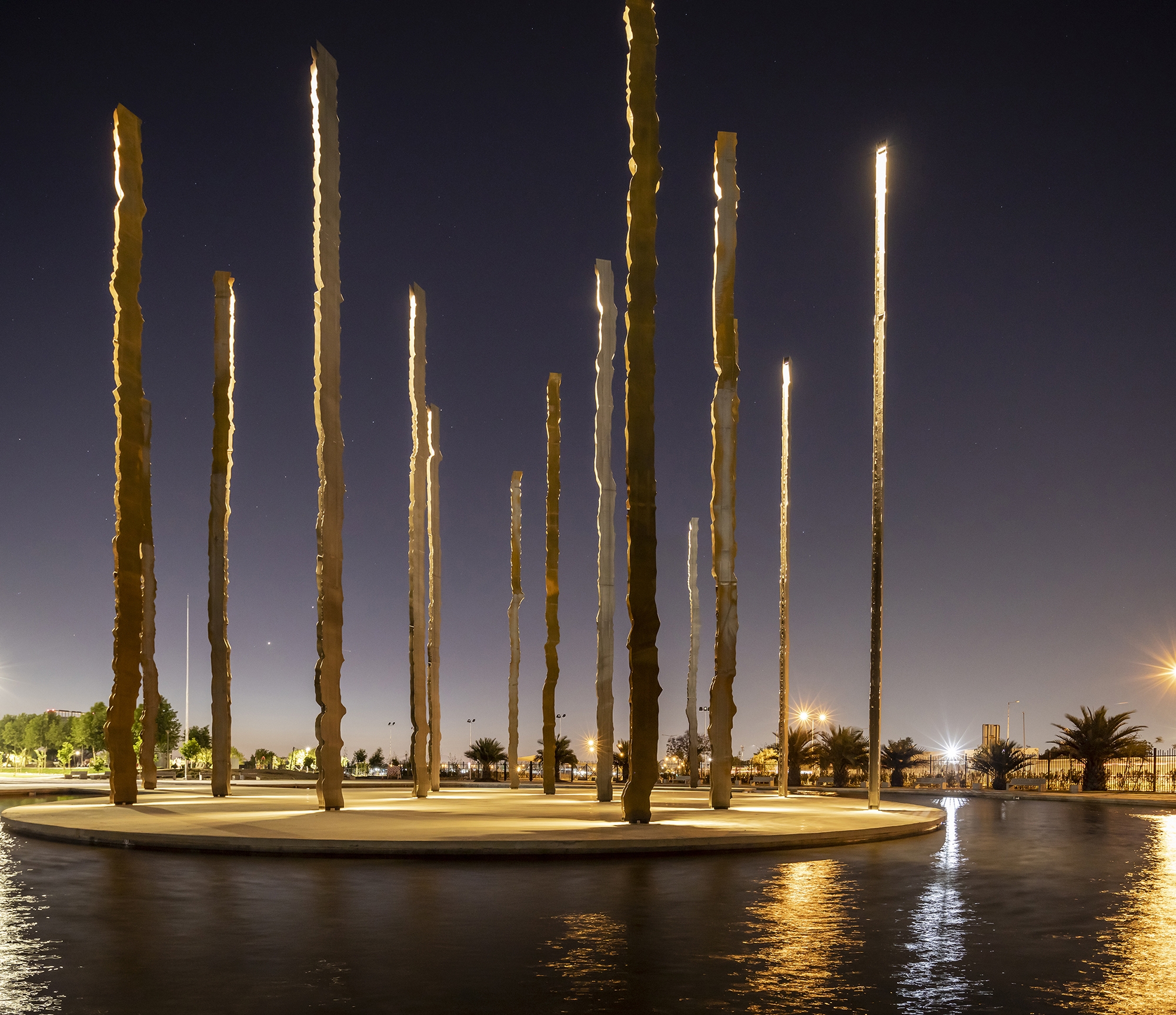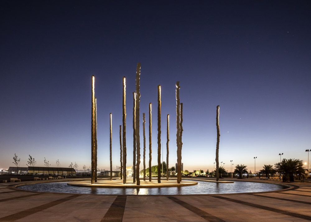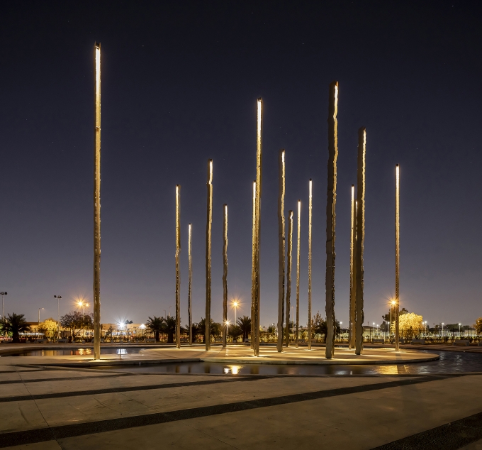 The artist Fernando Prats designed 16 iron columns and distribute them on a circular concrete surface surrounded by a water mirror that establish a real and symbolic connection between the vertical and the horizontal of the skyline of Andes Mountain