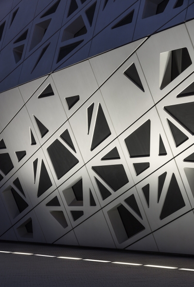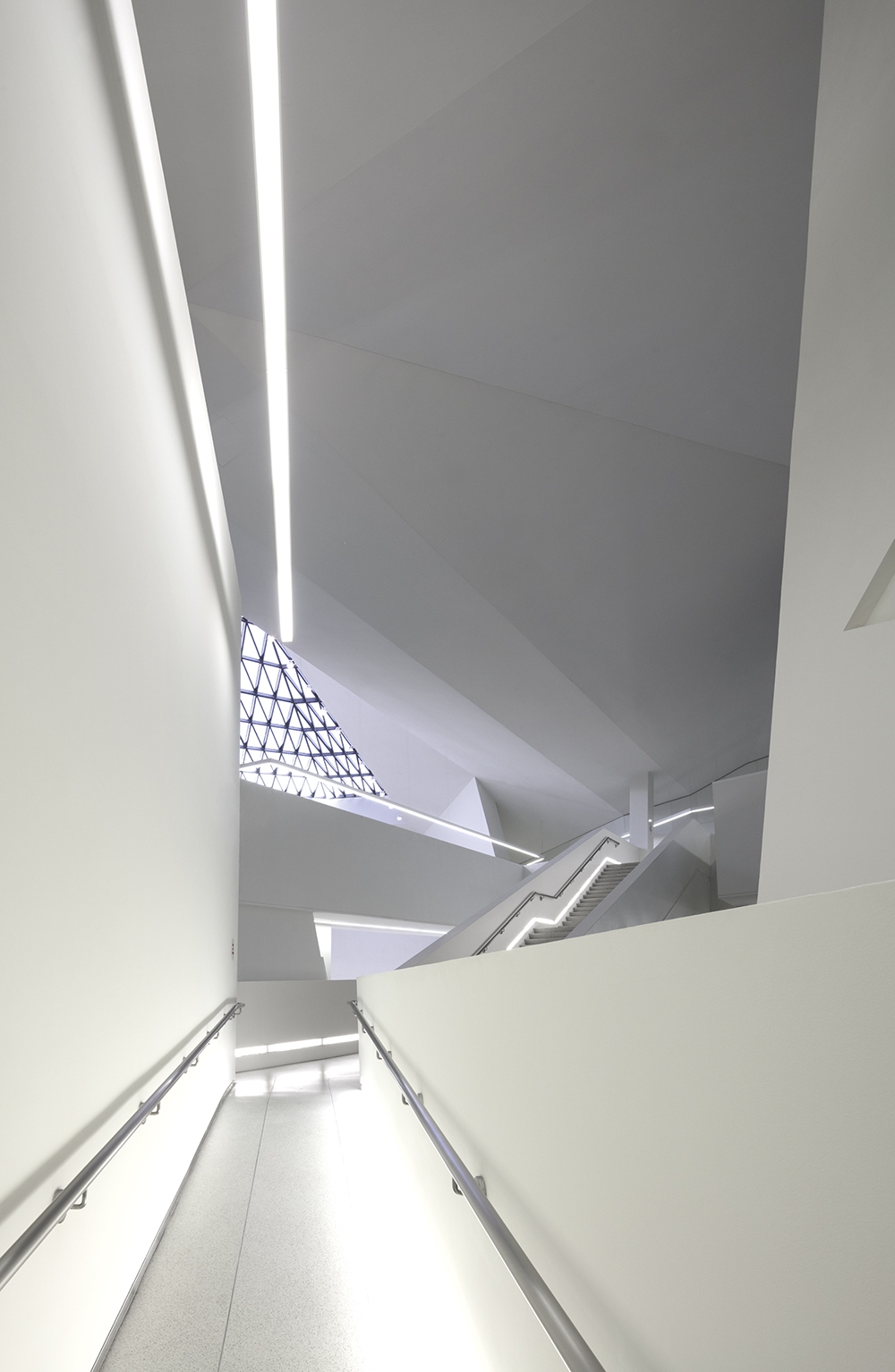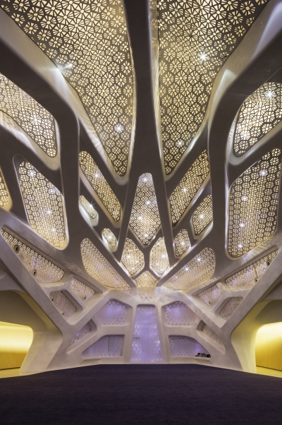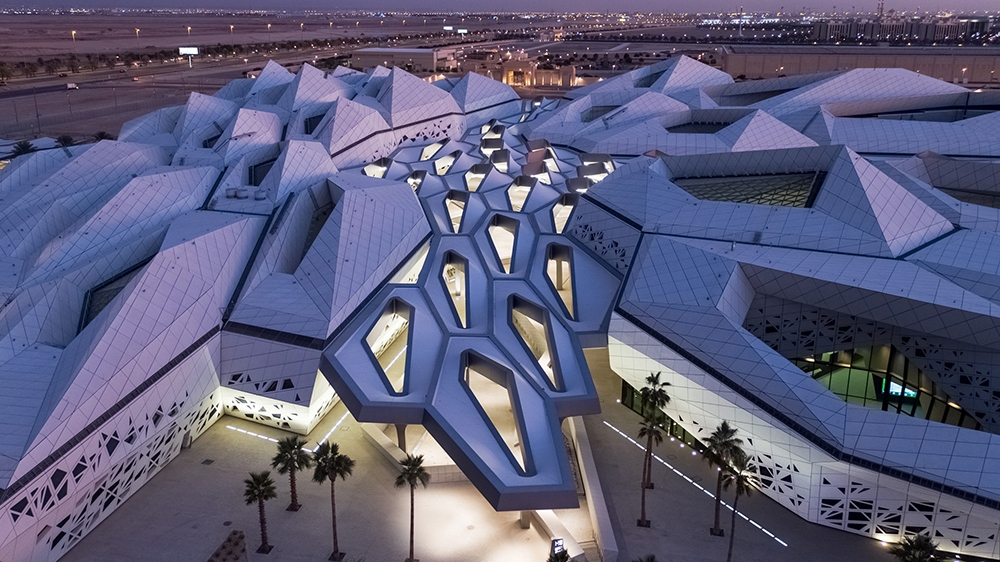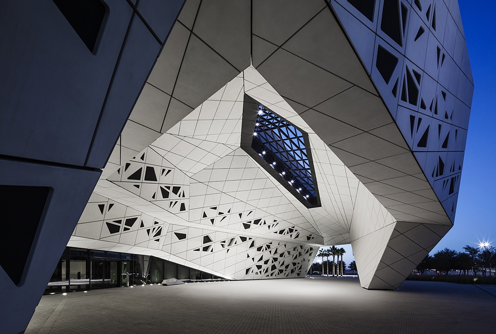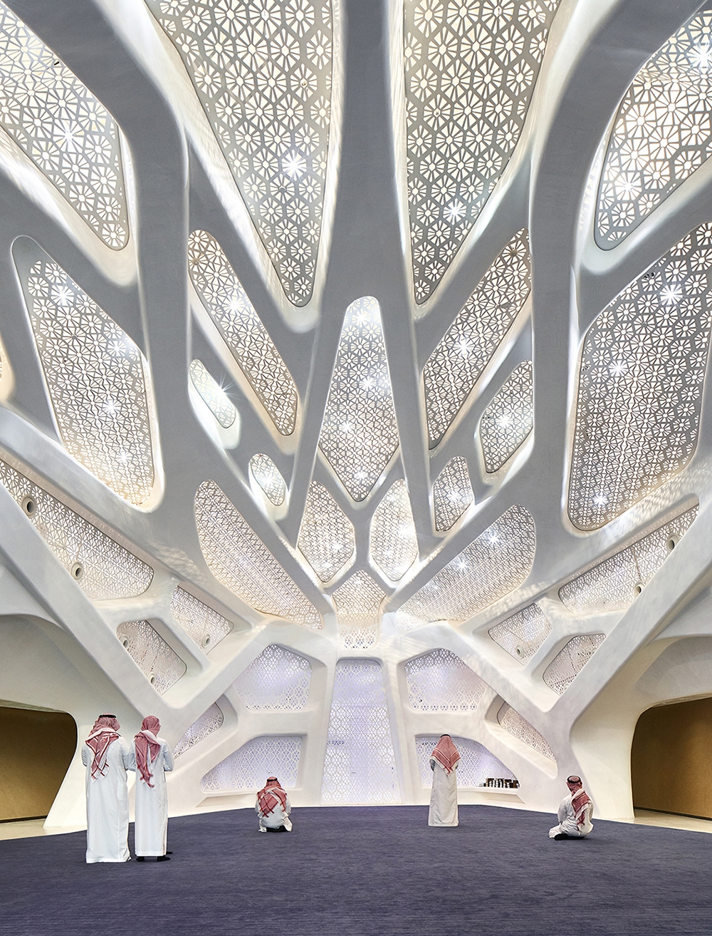 Intricate in detail and vast in scope, this design journeyed from competition to construction documents in just nine short months. And light is not simply part of this space–it is the space. It blooms and flows within atria, meeting rooms, a research library, and IT center, emanating from triangular niches and from behind pure, sculpted ceilings free of downlights. Luminous bands, integrated and hidden into handrails and reception desks, reinforce the cellular structure and provide intuitive wayfinding. In the windowless Musalla, color-changing ambient lighting mimics the daylight colors. As night falls, the grounds continue to radiate. These faceted buildings grow and glow from the sand like sculpted crystals.
