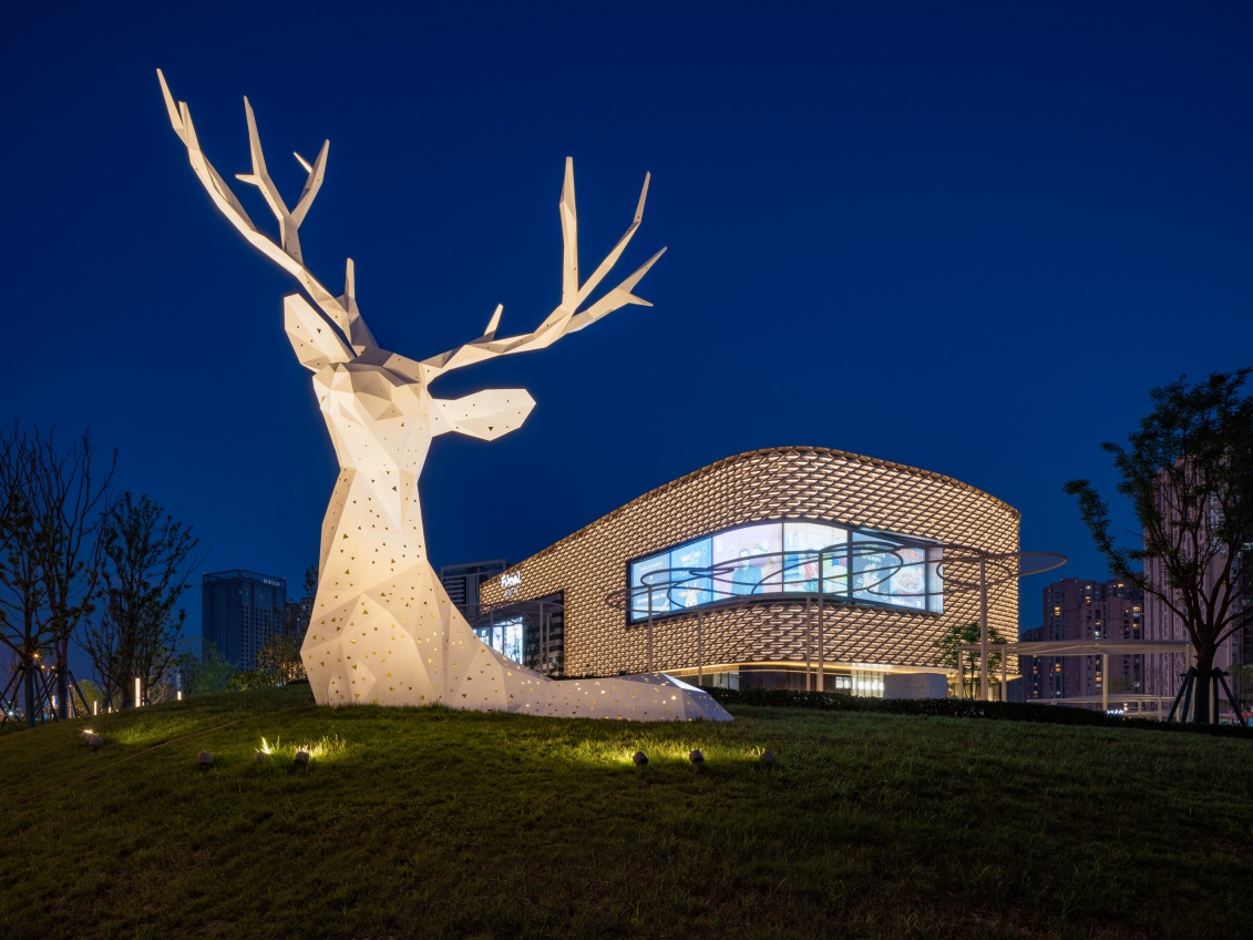 Firefly lantern lighting is a warm light emitted from the gap of the curtain wall by three layers of indirect light of different weaving languages. The lamps are carefully integrated with the curtain wall design. Among them, some dot light are hidden to simulate the faint light of fireflies in the breathing gap. The highlight of Pandora's magic box lighting is that various changes and details inside the space are revealed from the cylindrical glass body, including the life tree, the structural lighting, the sky window light, indirect light lighting and other elements, which are combined together, making the transparent glass entrance infinitely.