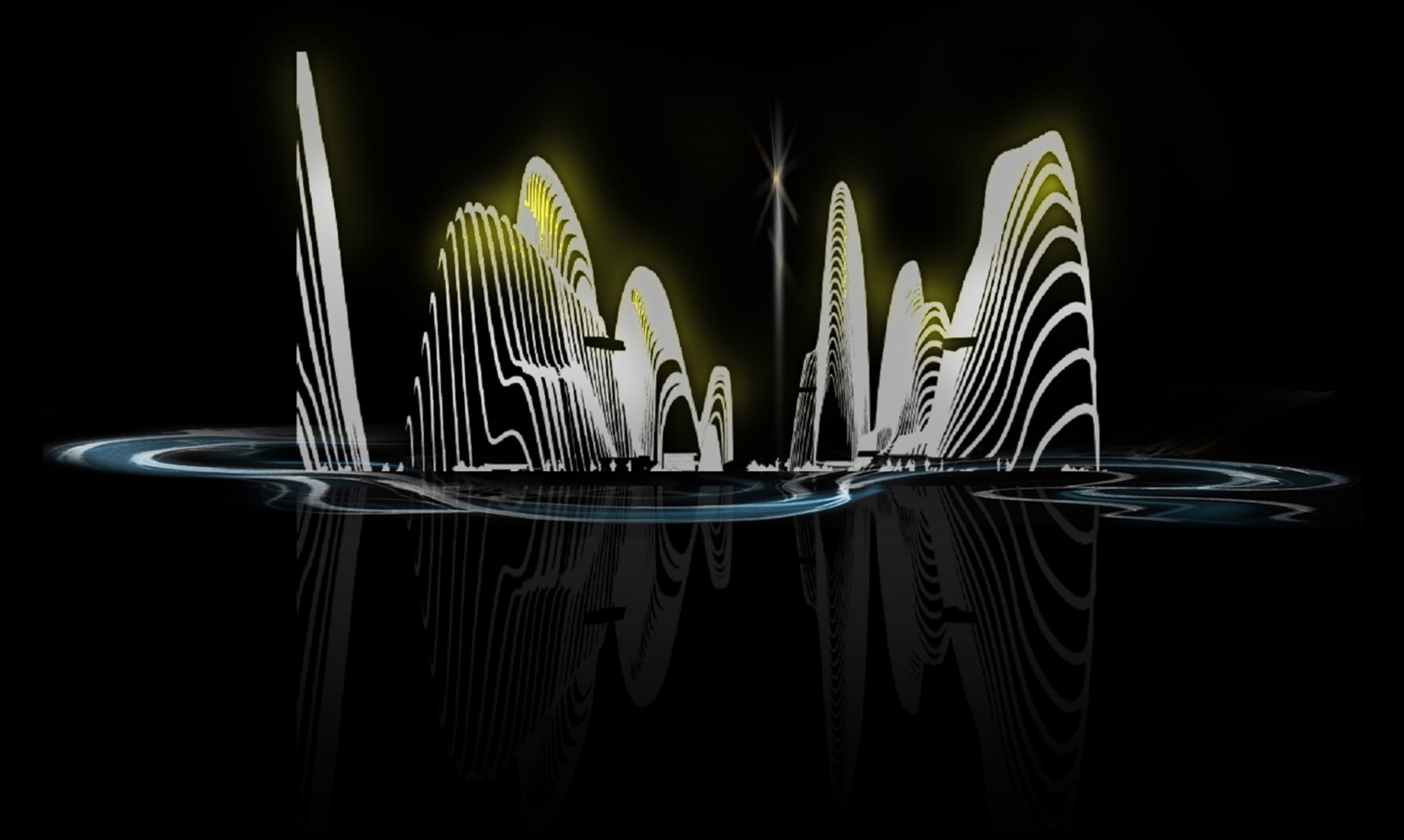 At night, the glare of the multimedia facade is strictly controlled. Lights flowing on the "mountain" like a waterfall, making the building complex aesthetically pleasing.
