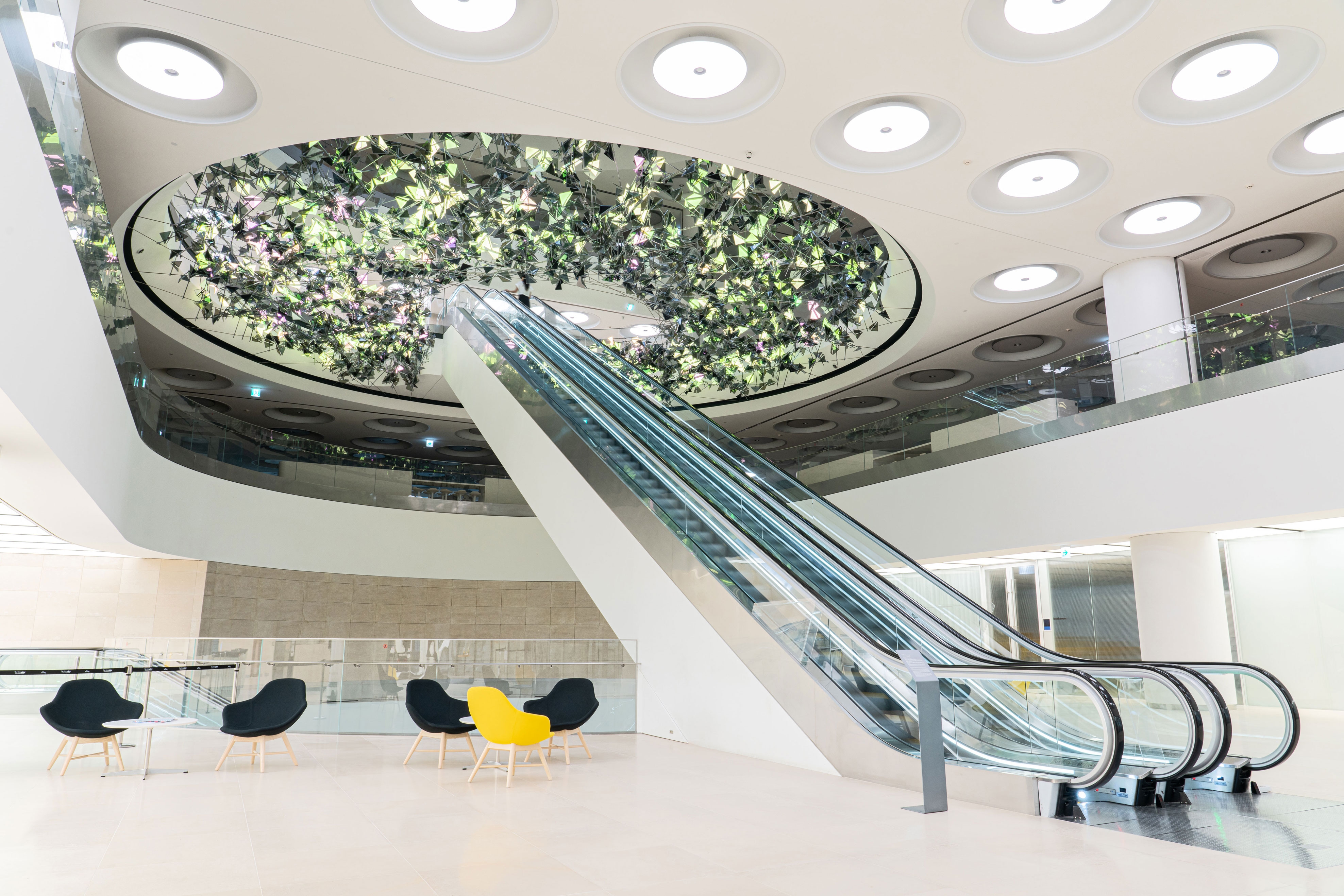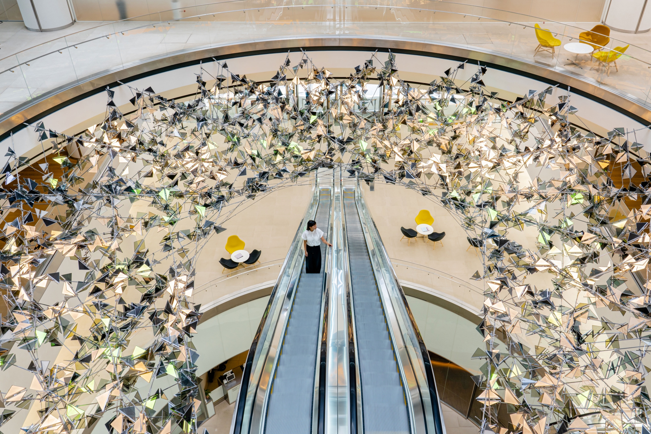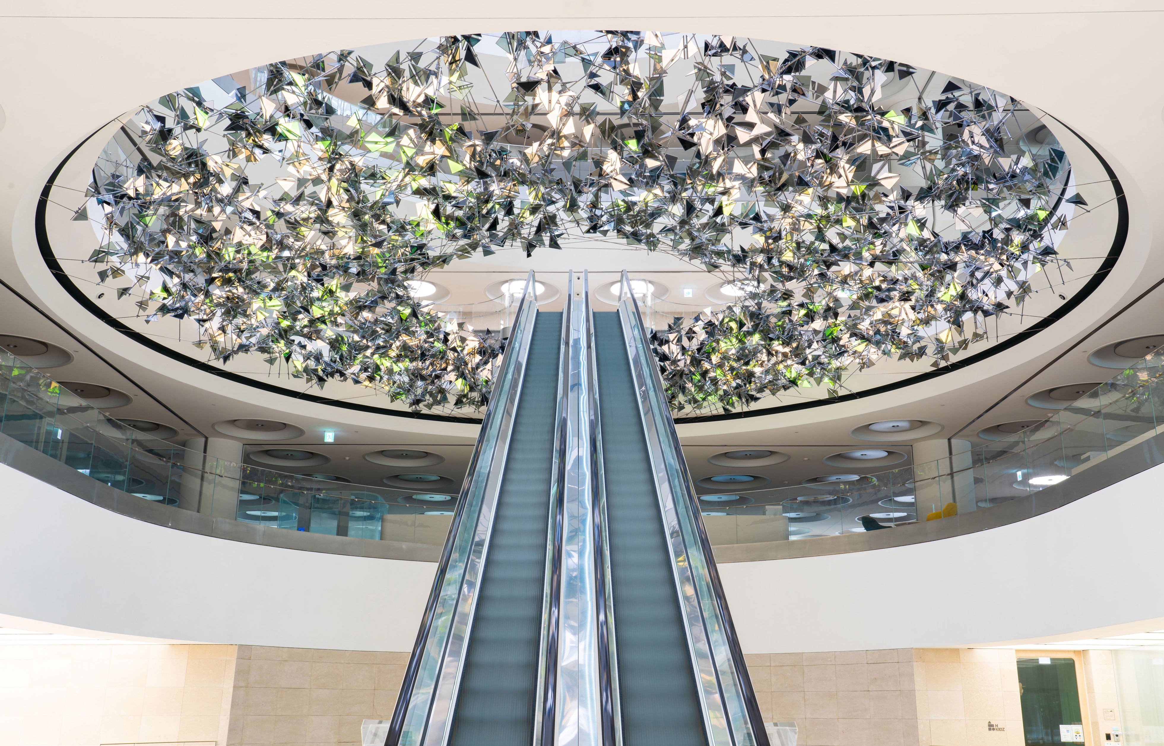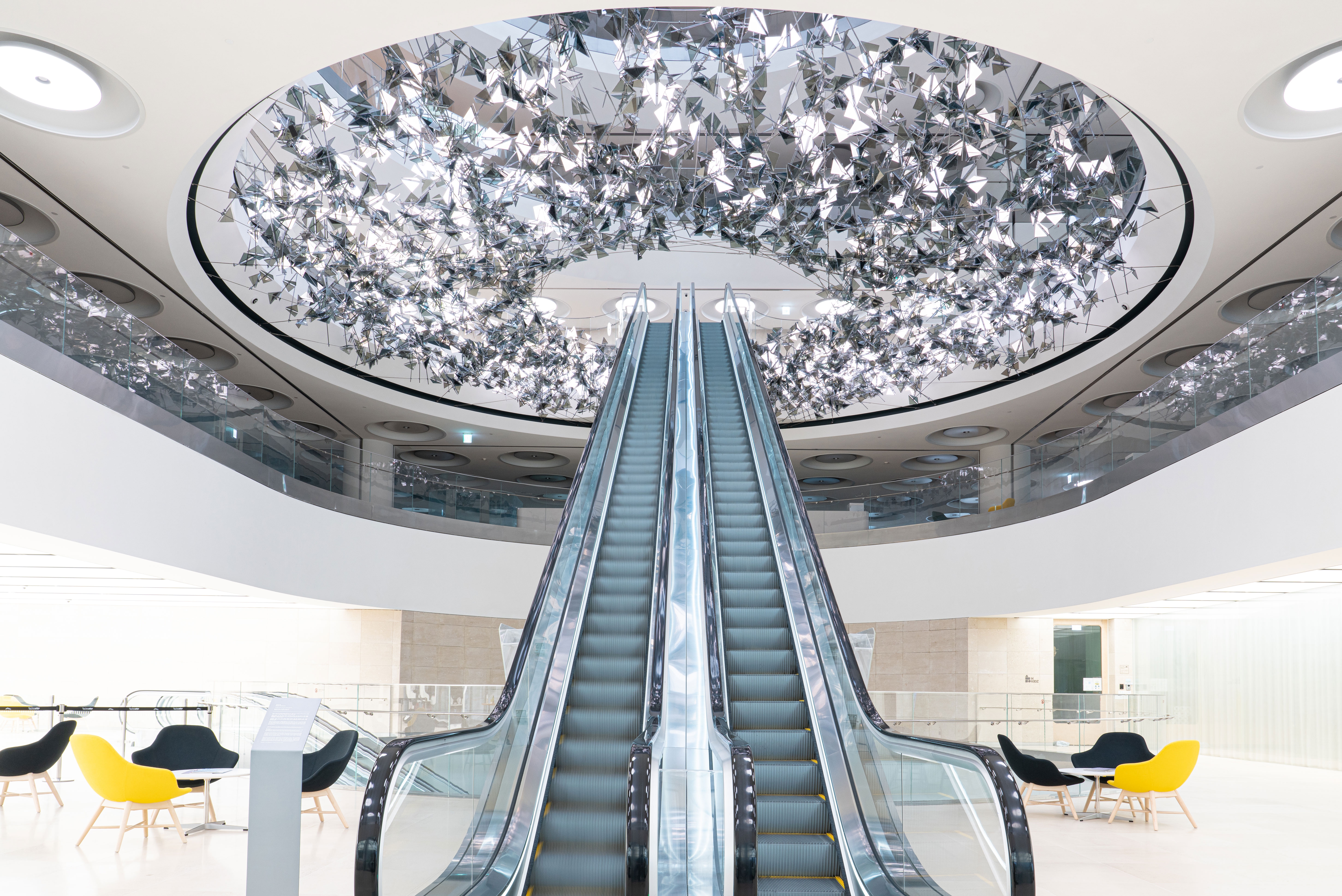 Deriving its name from the arrangement of leaves on a stem, Digital Phyllotaxy is a vast media artwork located within the architectural ‘oculus’ of the new Hankook Tire Technoplex in Pangyo, Seoul. Inspired by the vertical journey through the building, the artwork explores the idea of split-level experiences. As people ascend into the office, they witness the interplay of dappled light below, within and above a tree canopy. Leaves digitally rustle and change colour with the seasons transforming the journey on the escalator into an encounter with nature.