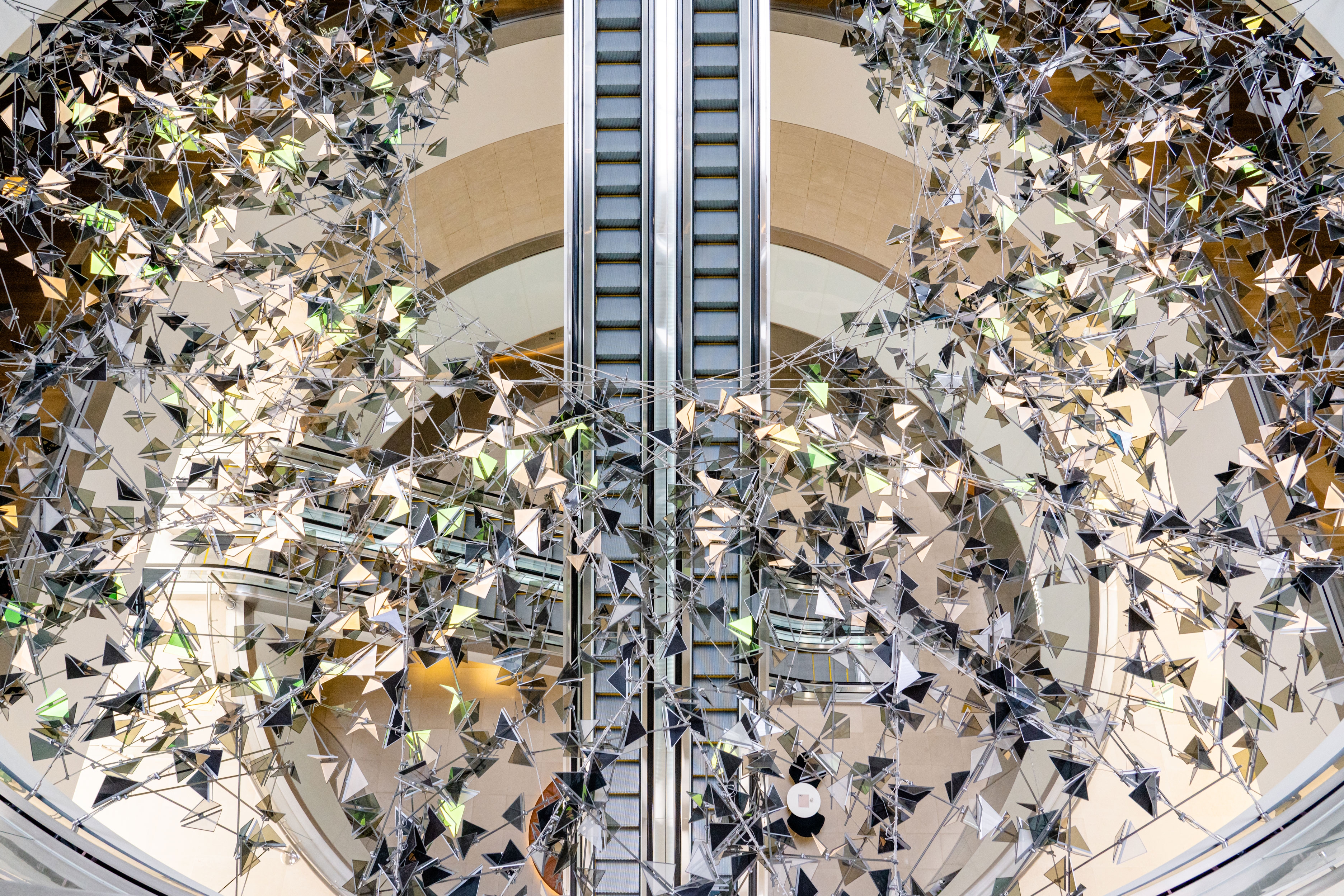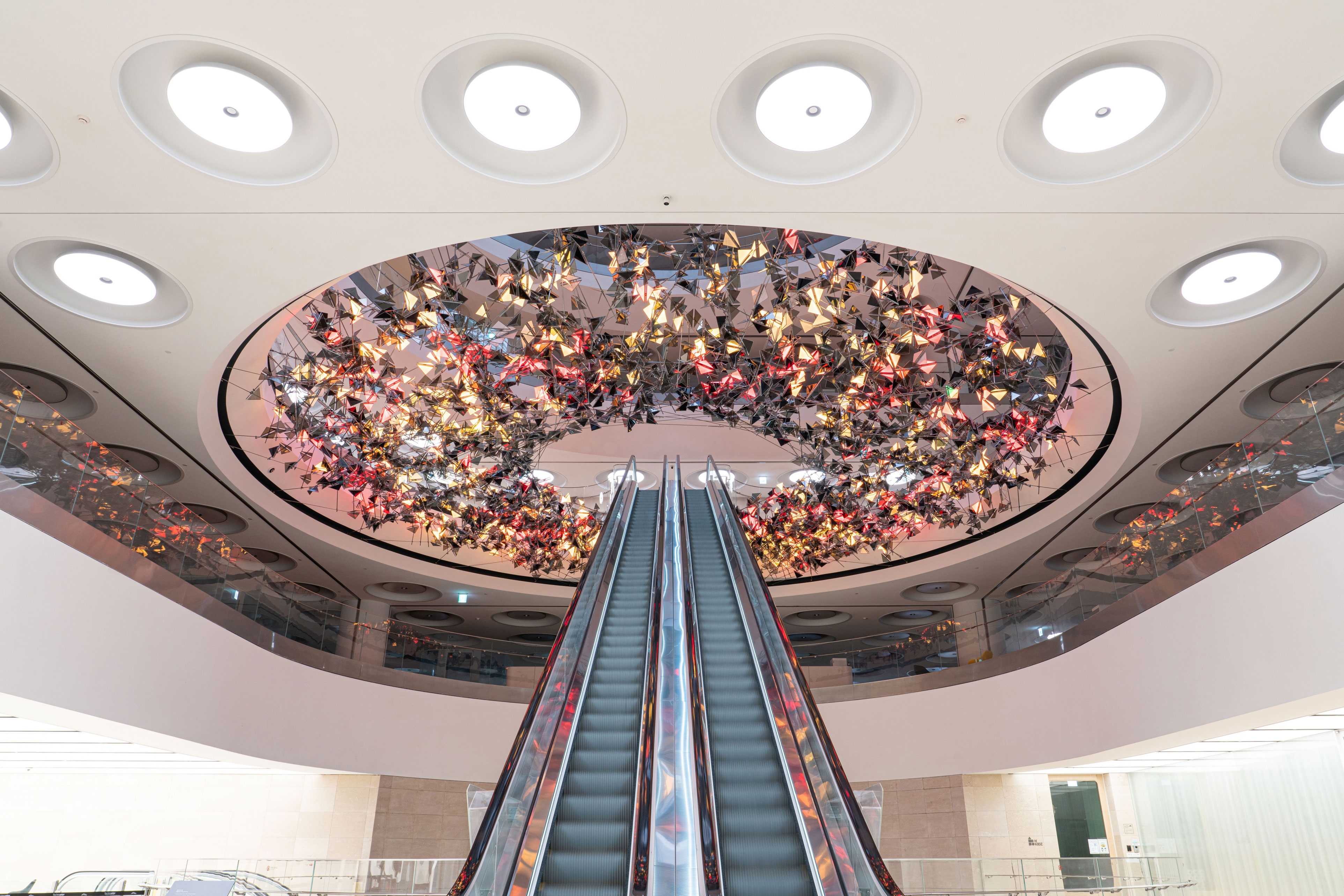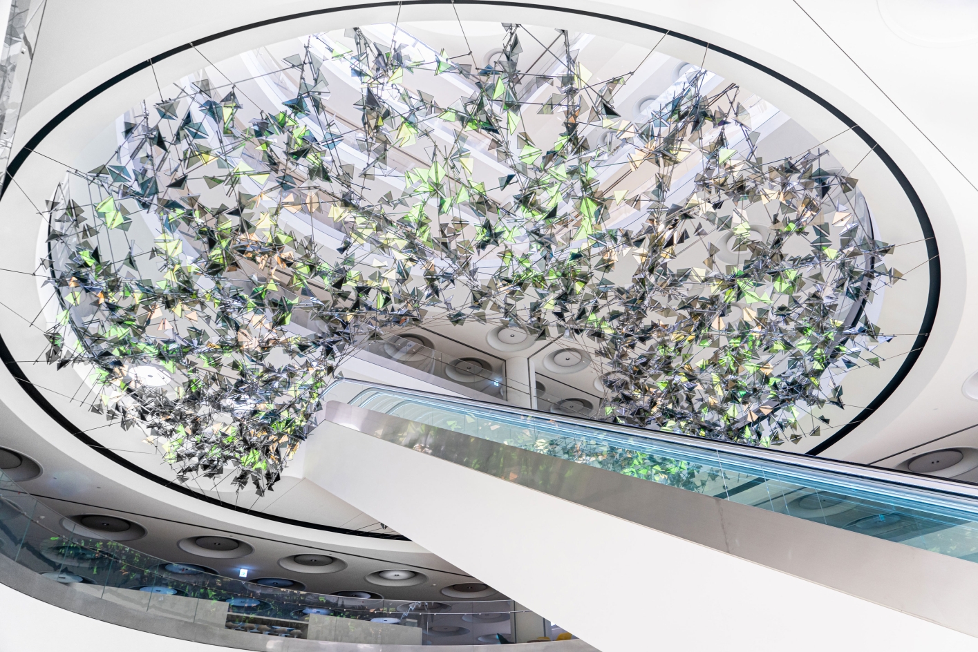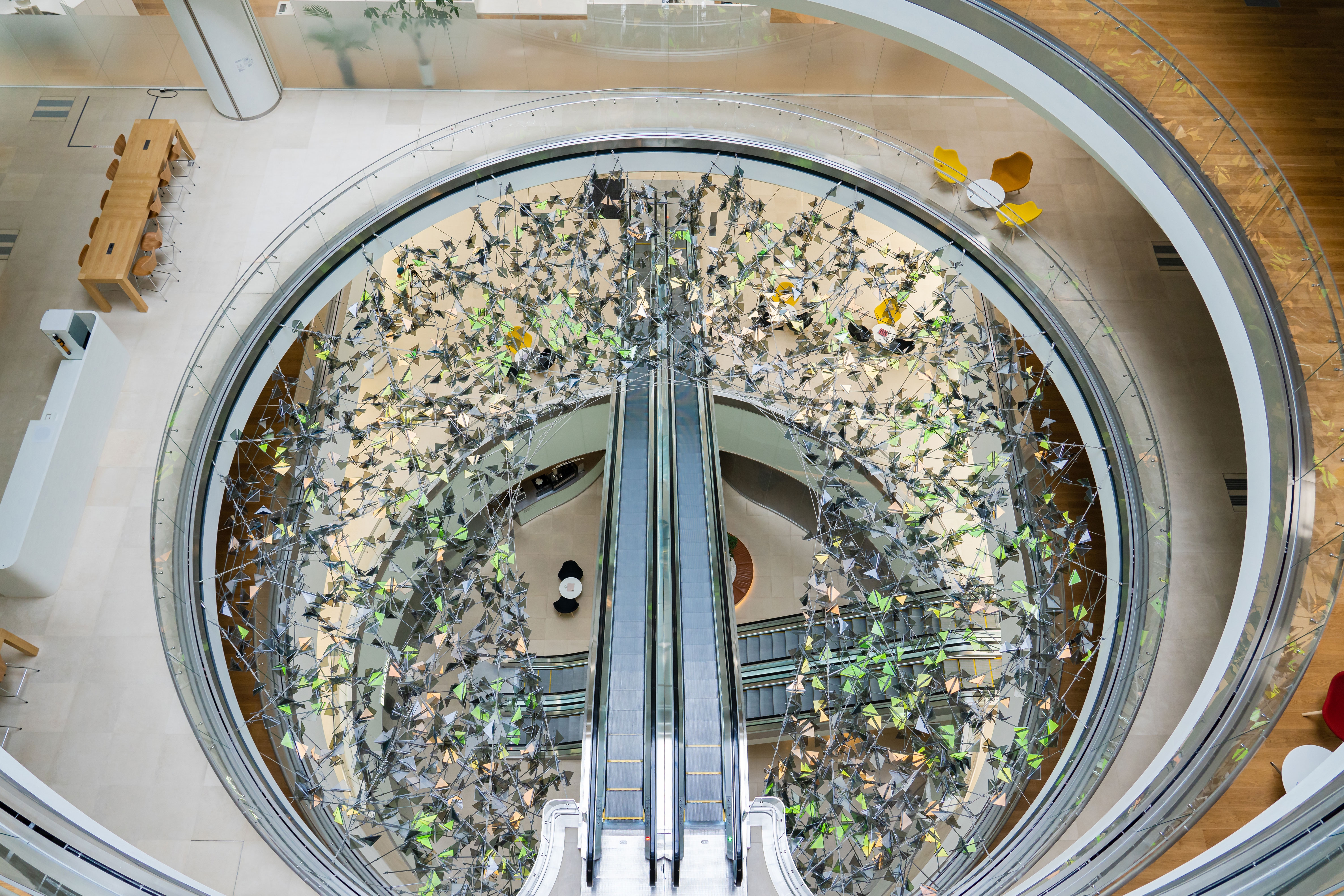 Deriving its name from the arrangement of leaves on a stem, Digital Phyllotaxy is a vast media artwork located within the architectural ‘oculus’ of the new Hankook Tire Technoplex in Pangyo, Seoul. Inspired by the vertical journey through the building, the artwork explores the idea of split-level experiences. As people ascend into the office, they witness the interplay of dappled light below, within and above a tree canopy. Leaves digitally rustle and change colour with the seasons transforming the journey on the escalator into an encounter with nature.