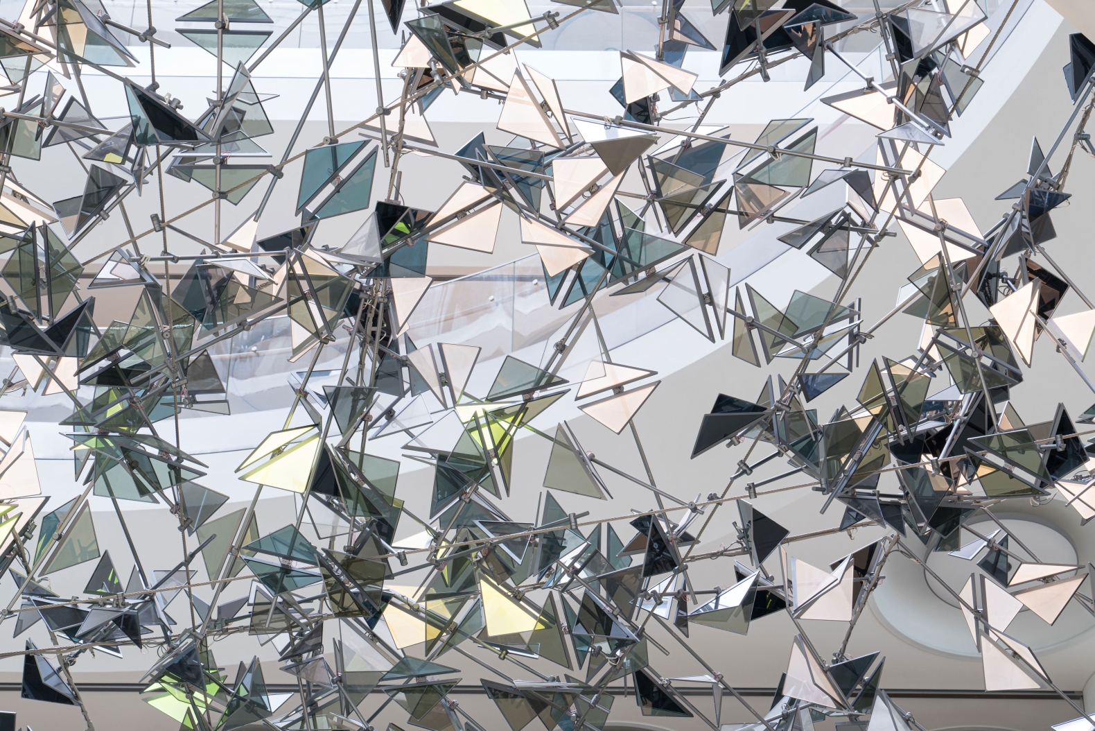 With a bespoke media assembly, the artwork uses technology to bring an essence of the natural world inside the building. Layered edge-lit LED units and liquid crystal shutters create delicate volumes of illumination and obscuration representing the way light filters through leaves. A varied palette of inputs including the movement of passersby, sun paths and wind speeds, trigger generative colours and textures that update with the changing seasons. Illustrating the intricate coexistence of nature, modern art and technology, Digital Phyllotaxy aims to create a workplace that is restorative and supports people’s wellbeing.