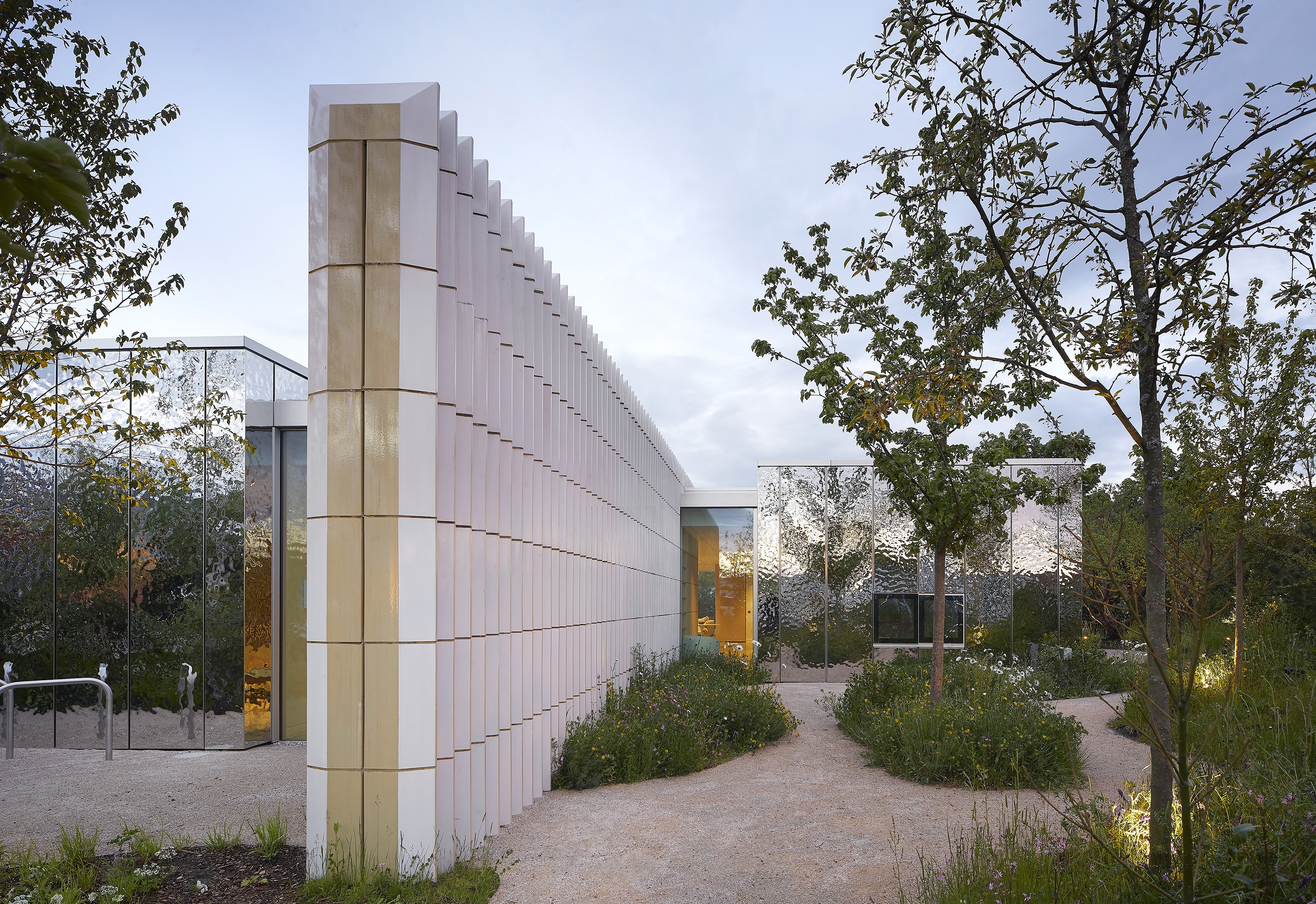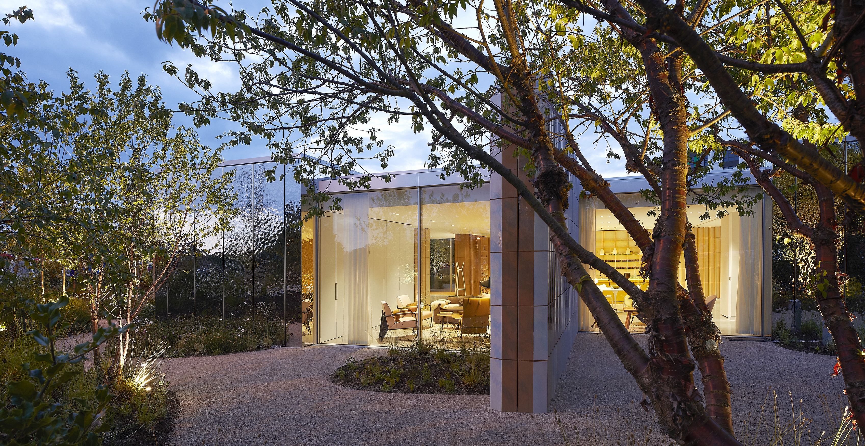 The spaces are organized around an open central space, where a large skylight creates focal point from where the private spaces radiate. The colours reinforce a connection to the earth and envelope the guests with a feeling of calm and wellbeing. Woven through the ceilings and details, the soft and warm internal lighting reaches outward from the central skylight to the perimeter. Full height glass allows for views to the sky while being protected by the surrounding trees and their reflections, obscuring views into private areas.