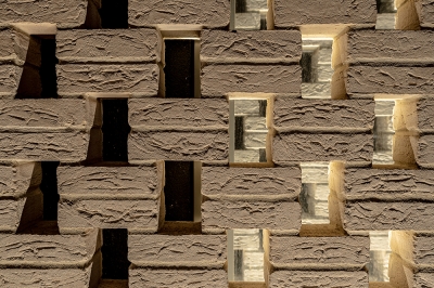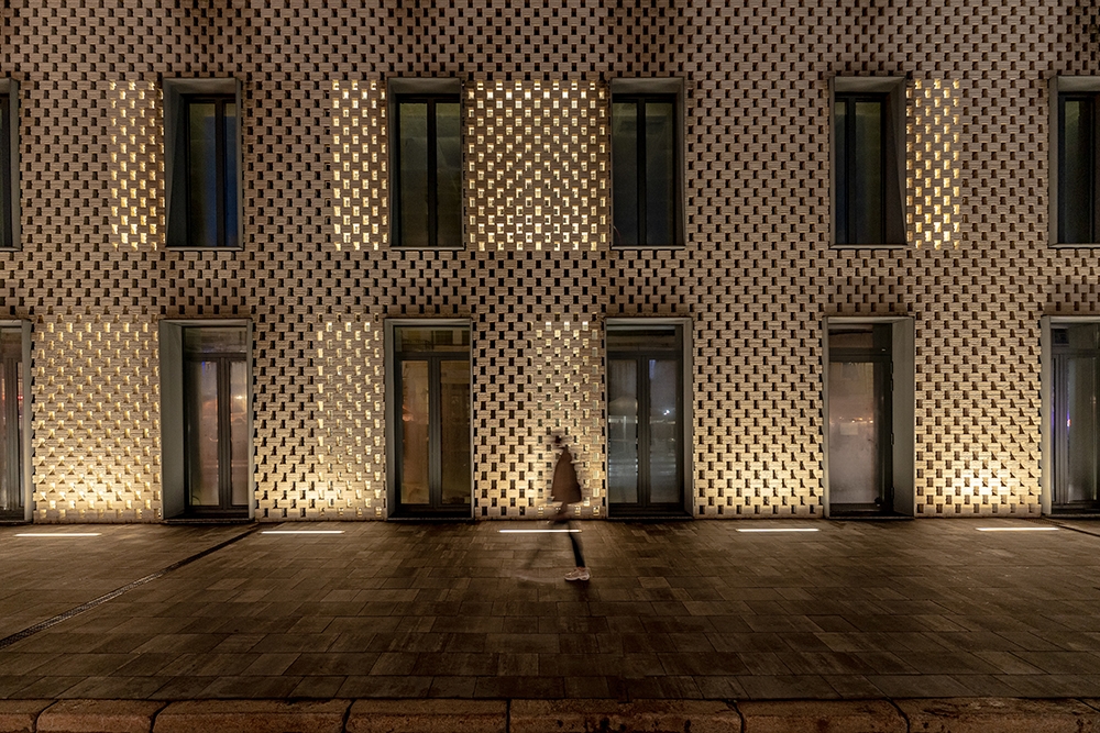 Brick is a traditionally dense and rough material, but here - a non-standard white shade turns into a light veil. The rhythm of the inner window openings does not coincide with the rhythm of the outer ones, so we will reveal the hidden elements with an inner light.