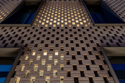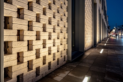 The facade of Saga City Space is a white brick lace canvas, for which we have developed a unique lighting scheme with different layouts. Soft muted light will fill the facade from the inside, and its openwork part will come to the fore thanks to the sliding external backlight.