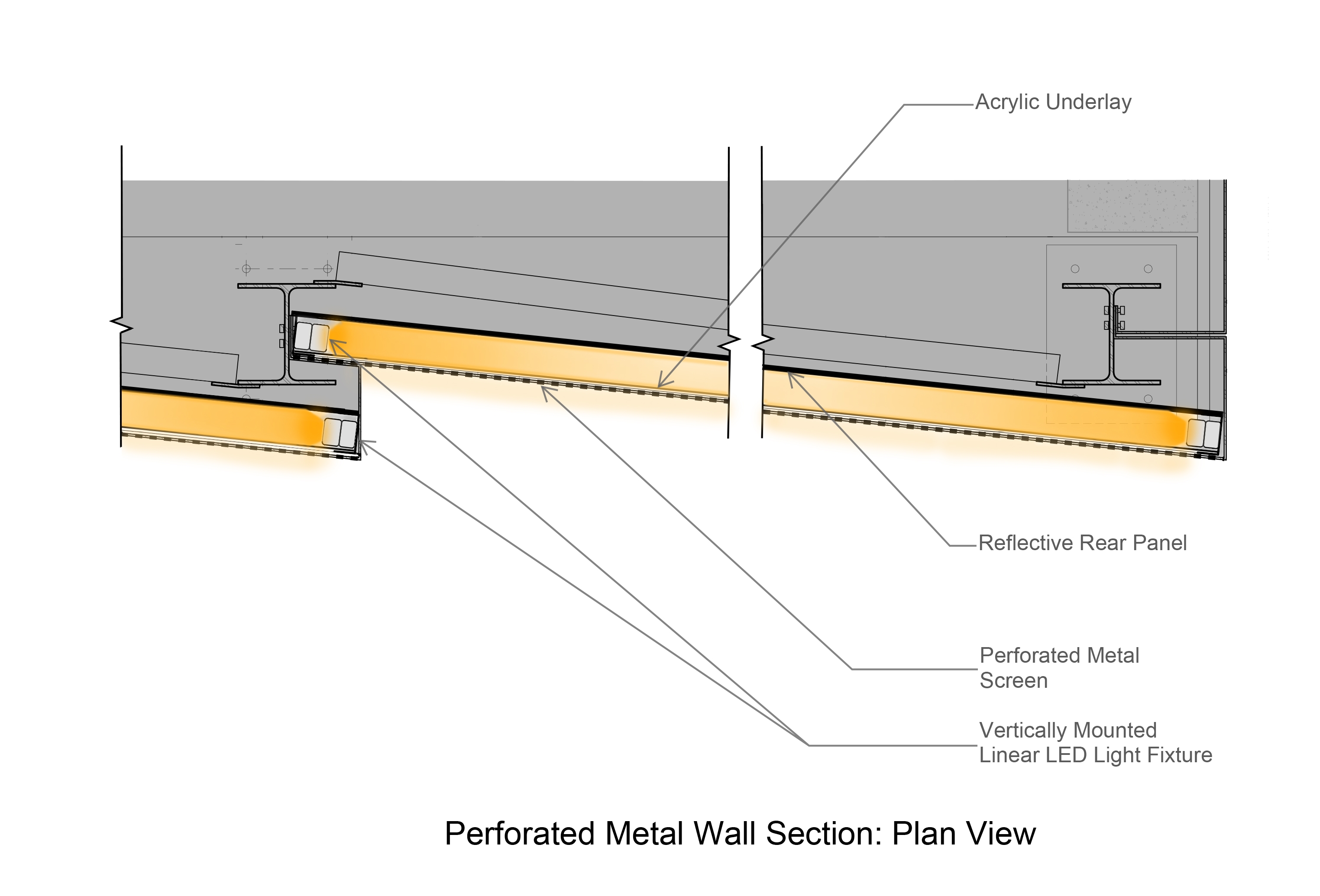 A glowing screen of backlit perforated metal echoes the tilted panel motif of the lobby, acting as a backdrop for the silhouetted trees. Concealed linear grazing LEDs evenly reflect light through diffusers.