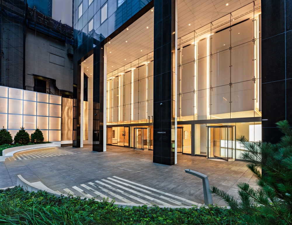 Entry DescriptionThe thoughtful illumination of this public plaza in midtown Manhattan starts with the soft, even lighting provided by contemporary cutoff pedestrian poles, which achieve the light levels required by NYC’s strict code. Highlighting architectural elements transforms the daytime experience of the plaza into an inviting exterior room.
