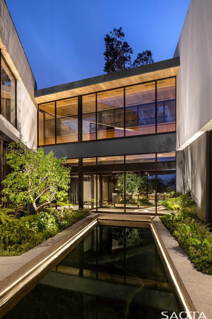 This contemporary home with its clean architectural lines and floating planes, softened with rich materials and textures nestled in an elaborate landscape setting, provided the optimum canvas to play with light to influence the experience and visual perception of this luxurious private residence. Our biggest lighting challenge was working with the vast amount of glazing to optimise the user experience from within but also provide the privacy with reflections in the glass from the outside looking in. Architecturally, the purpose of all the glazing, was to extend the interior spatial experience beyond the building to the exterior and landscape and I wanted to extend this experience into the evening with artificial light. At night, glass becomes a reflective barrier that not only creates a busy backdrop which tires your eyes but also limits the sense of space. To overcome this, we specifically underlit the glazing line on the inside of the building but over lit the area immediately outside to keep the glass transparent at night from the inside.