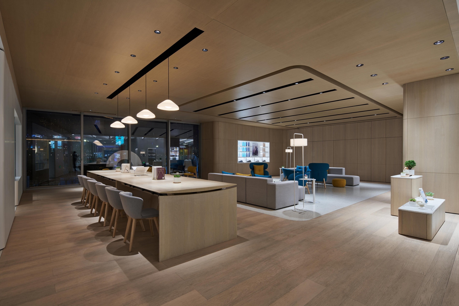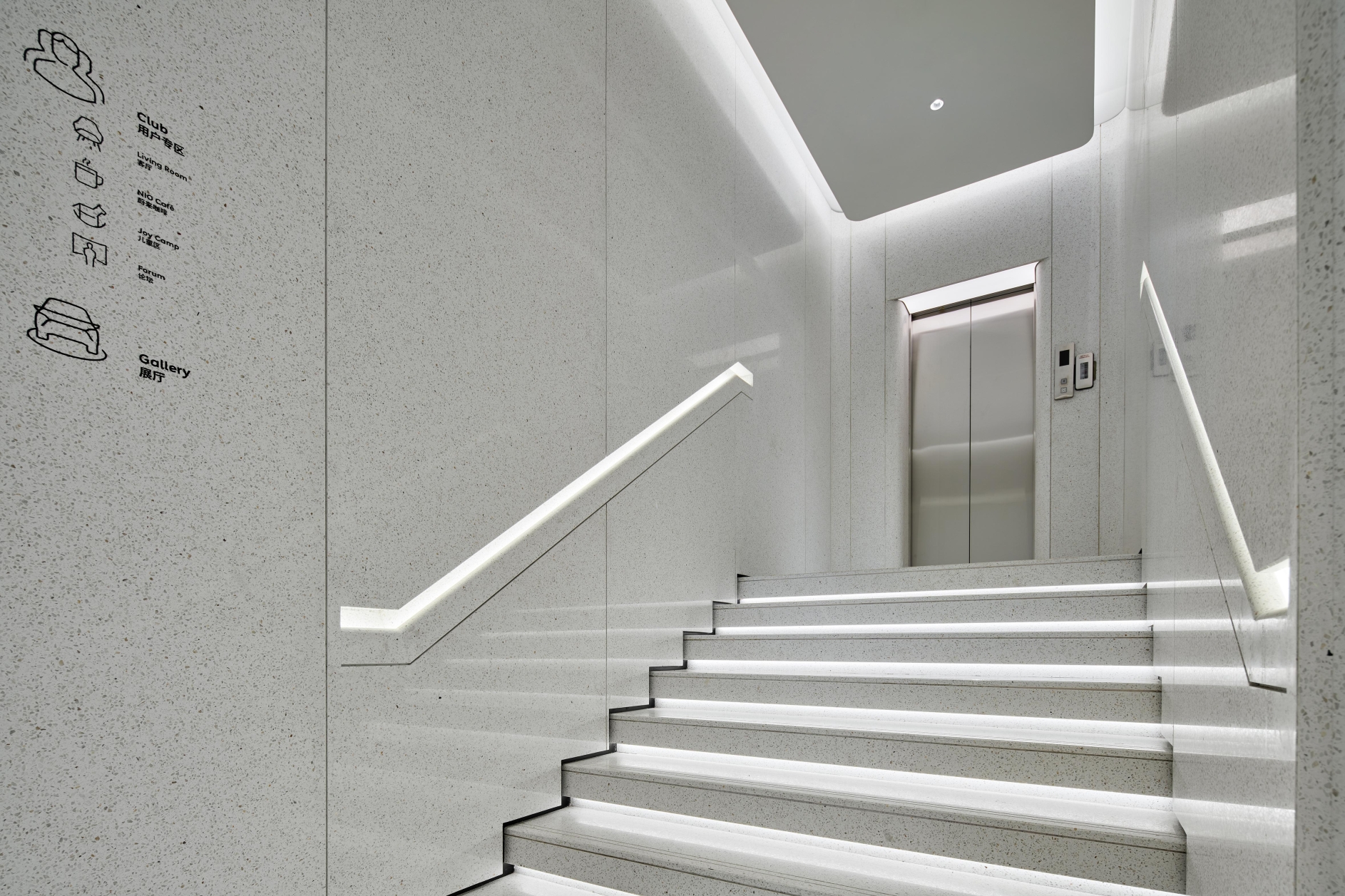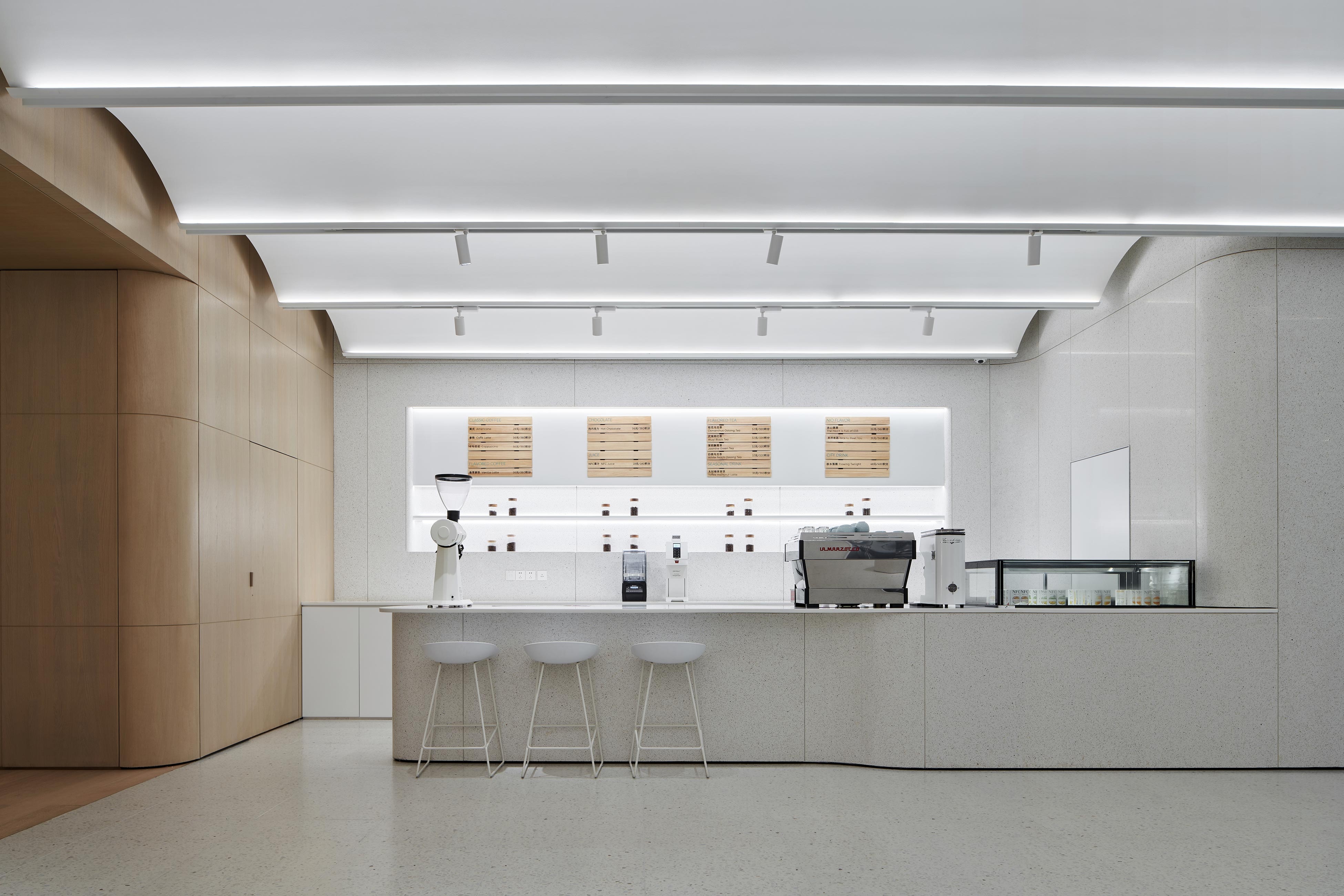 We try to explore how different materials and light shape the mood of space,create a floating modern sense on the first floor,and create a sense of NIO technology.The second floor uses materials to divide the spatial functions into reception area and water bar area.The lighting in the reception area has two modes of negotiation and meeting.The dome shape of the water bar area pays tribute to Louis Kang's kimbel Art Museum. We use linear wall washing lighting to emphasize the atmosphere of the dome cage. From light colored terrazzo to wood grain, from floating to feeling a sense of stability, from display space to experience reception hall, it is a very interesting and profitable project to apply a variety of different methods in one space, and finally pay attention to humanized experience and details, so as to build a future advanced community with customers.