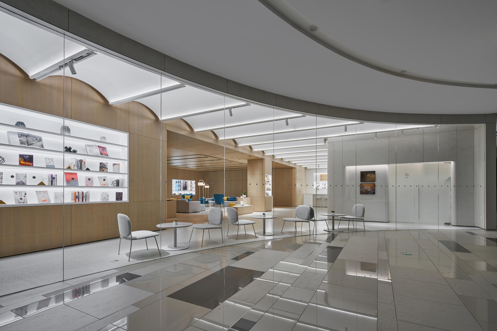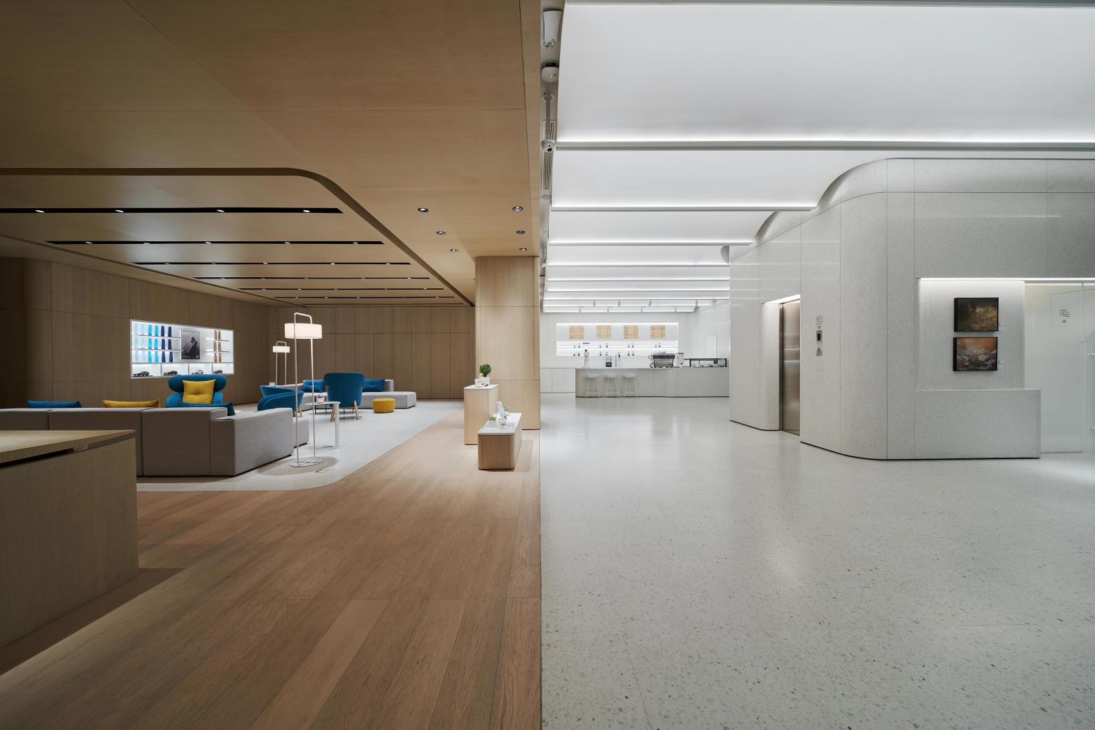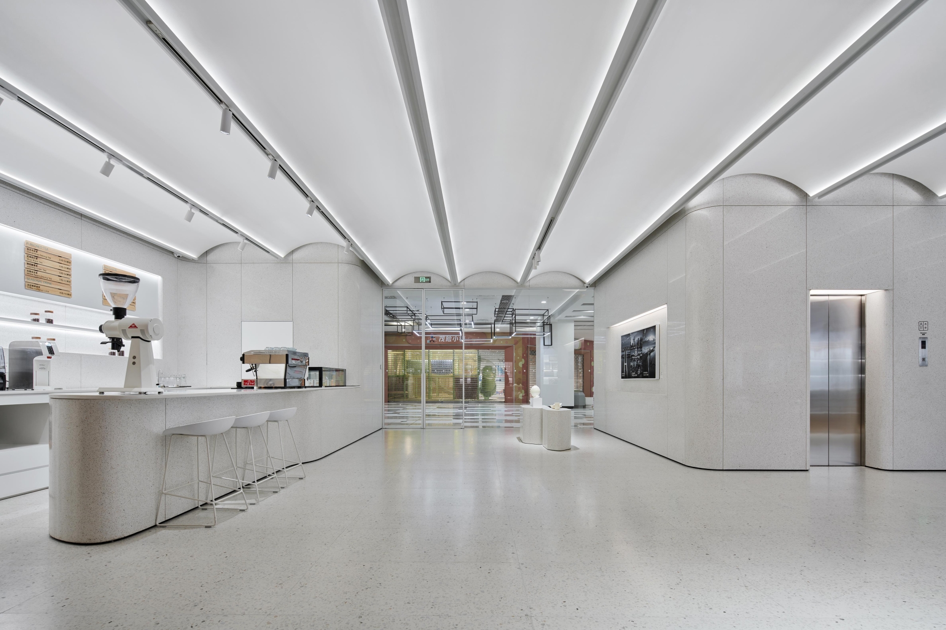 We try to explore how different materials and light shape the mood of space,create a floating modern sense on the first floor,and create a sense of NIO technology.The second floor uses materials to divide the spatial functions into reception area and water bar area.The lighting in the reception area has two modes of negotiation and meeting.The dome shape of the water bar area pays tribute to Louis Kang's kimbel Art Museum. We use linear wall washing lighting to emphasize the atmosphere of the dome cage. From light colored terrazzo to wood grain, from floating to feeling a sense of stability, from display space to experience reception hall, it is a very interesting and profitable project to apply a variety of different methods in one space, and finally pay attention to humanized experience and details, so as to build a future advanced community with customers.