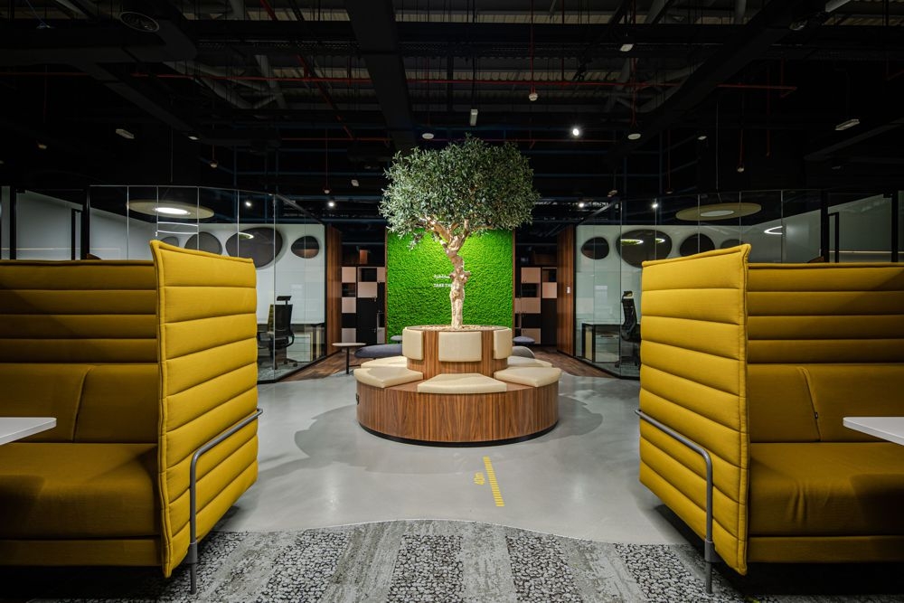 The lighting design was planned around this same idea. A curated selection of decorative and bespoke lighting elements helps define spaces, provides character and contributes to the overall feel of flow and movement. More specifically, the implementation of acoustic moss light fixtures supported the biophilic design principles which were developed.