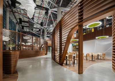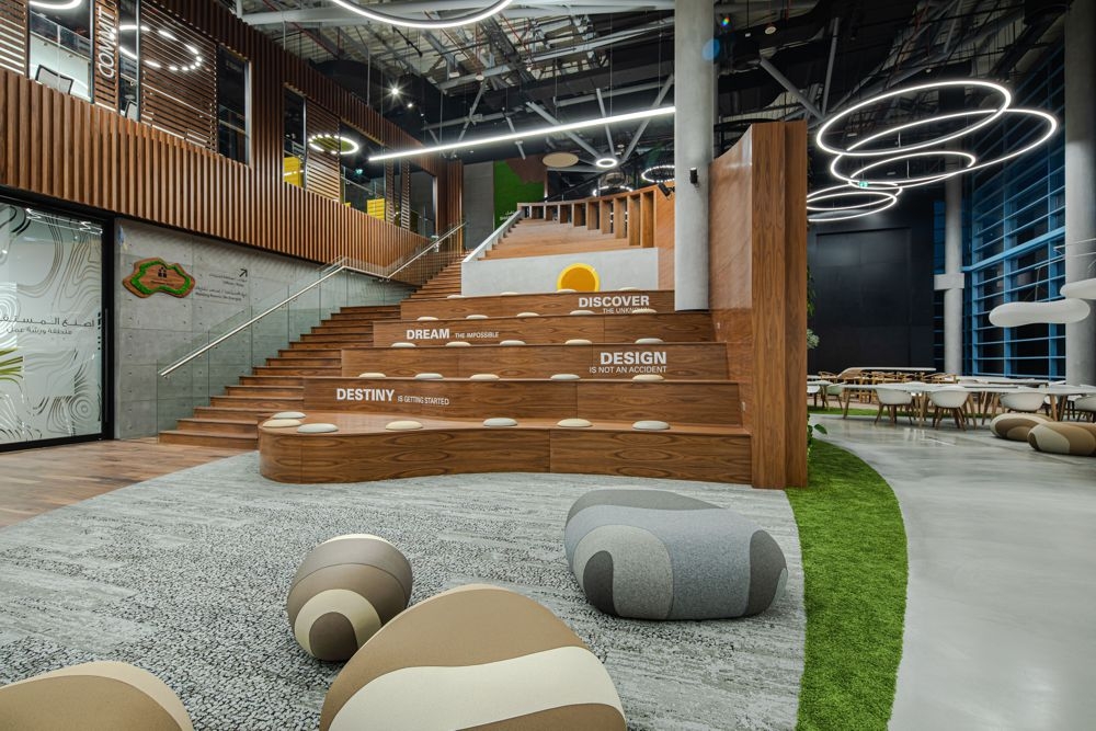 The interior design revolved around the notion of a wadi, Arabic term for valley, where knowledge, collaboration, innovation and entrepreneurship ideas converge. The space is therefore influenced by organic forms; interconnecting events, features and spaces by undulating passageways which dominate the experience of the user.