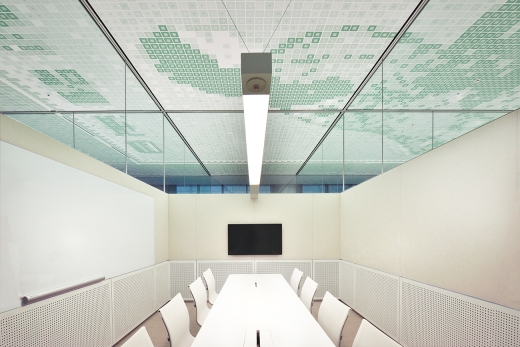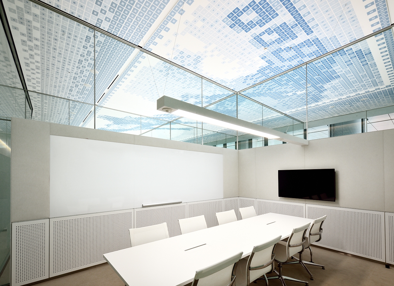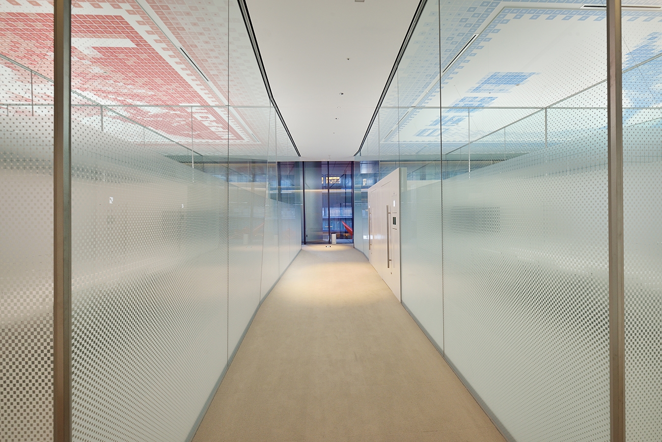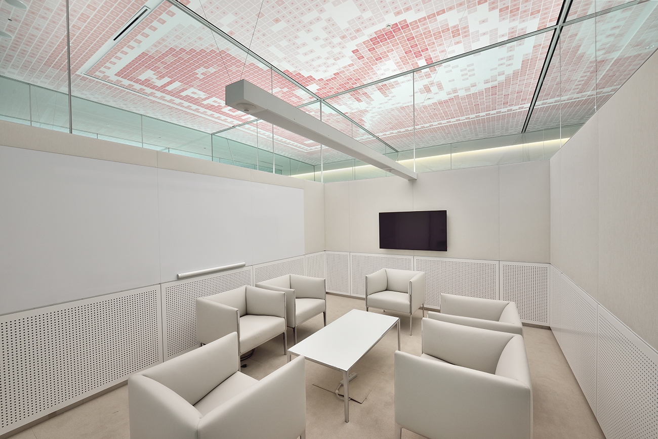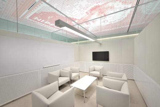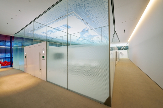 The ceiling of the reception room is decorated with "postage stamps," one of the corporate images, as a sign graphic. Inside the building, the brightly colored ceiling welcomes visitors, and from the exterior, the three types of postage stamps depicted on the ceiling in three corporate colors float across the ceiling, creating an impression of the company's presence.