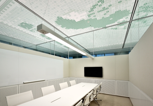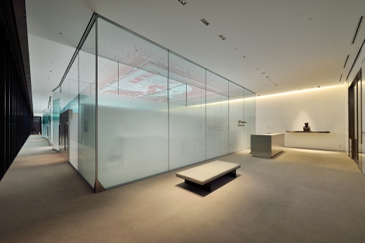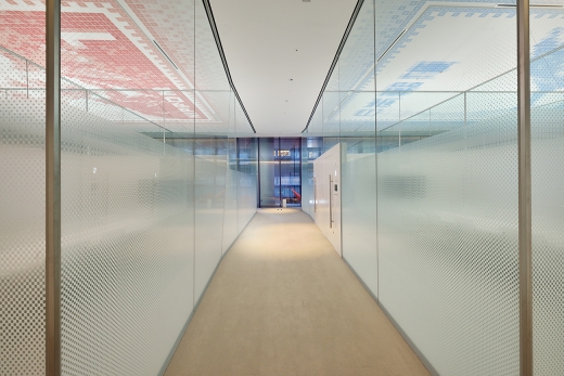 The lighting fixtures installed within the transparent glass partitions that maintain the continuity of the ceiling and the upper lights from the custom-made lights installed in the center of each room provide a fairly uniform light that maximizes the appeal of the sign graphics.