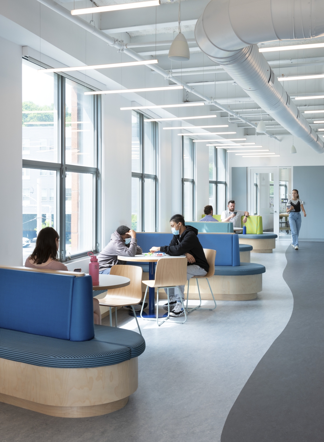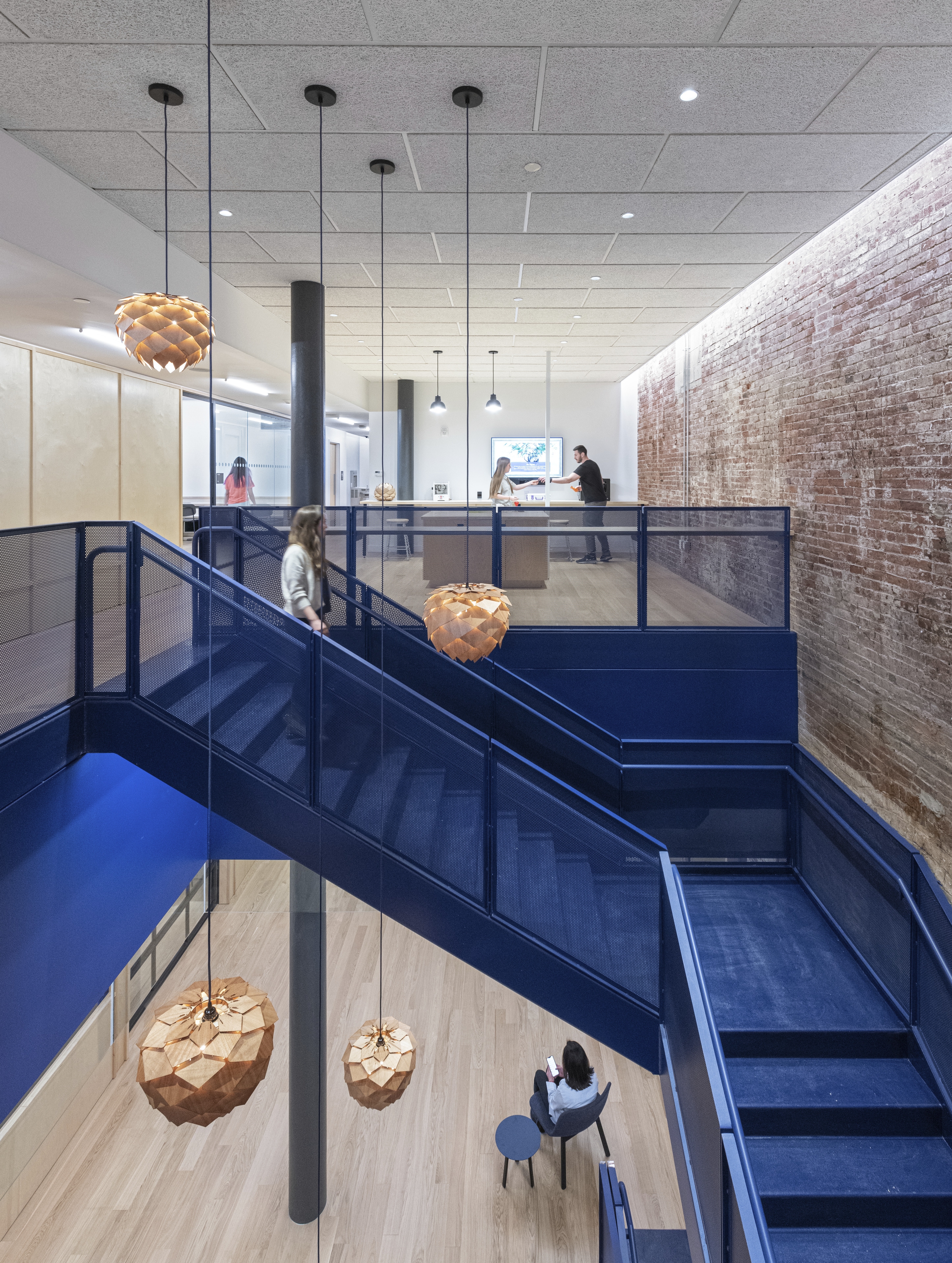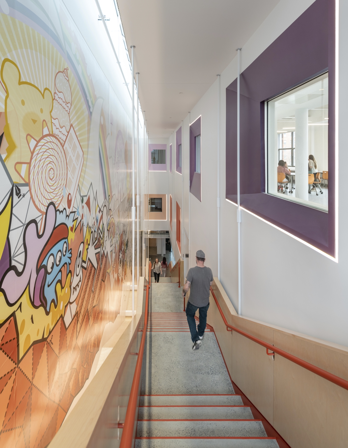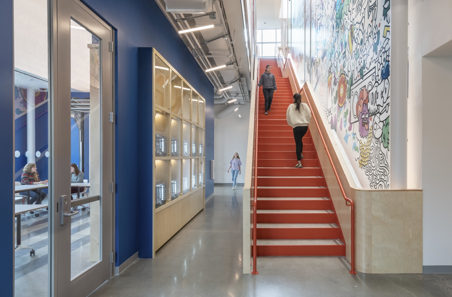 In the main connecting stair, linear accents integrated into the underside of the stair structure emphasize the tech-forward aesthetic, as a cluster of student-designed and constructed pendants hang through the multi-story space. Lam worked closely with The Possible Zone team to modify these decorative “Pangolin” pendants for commercial use, offering a chance to showcase students’ talents and celebrate their successes.