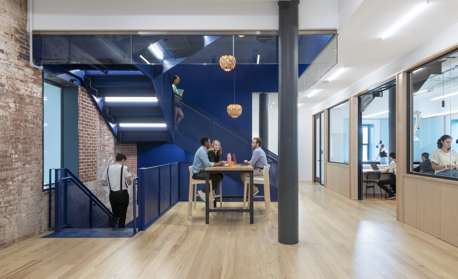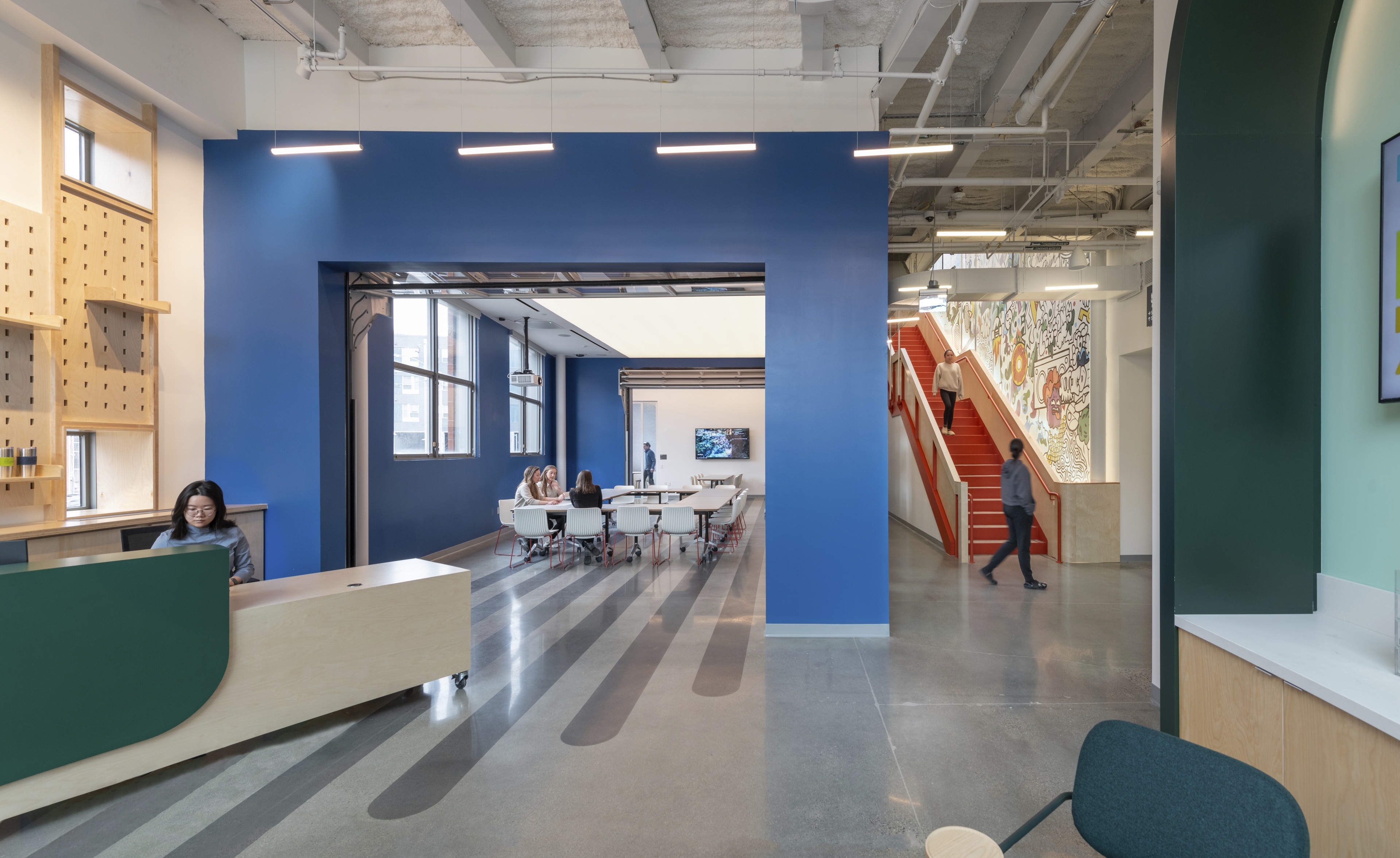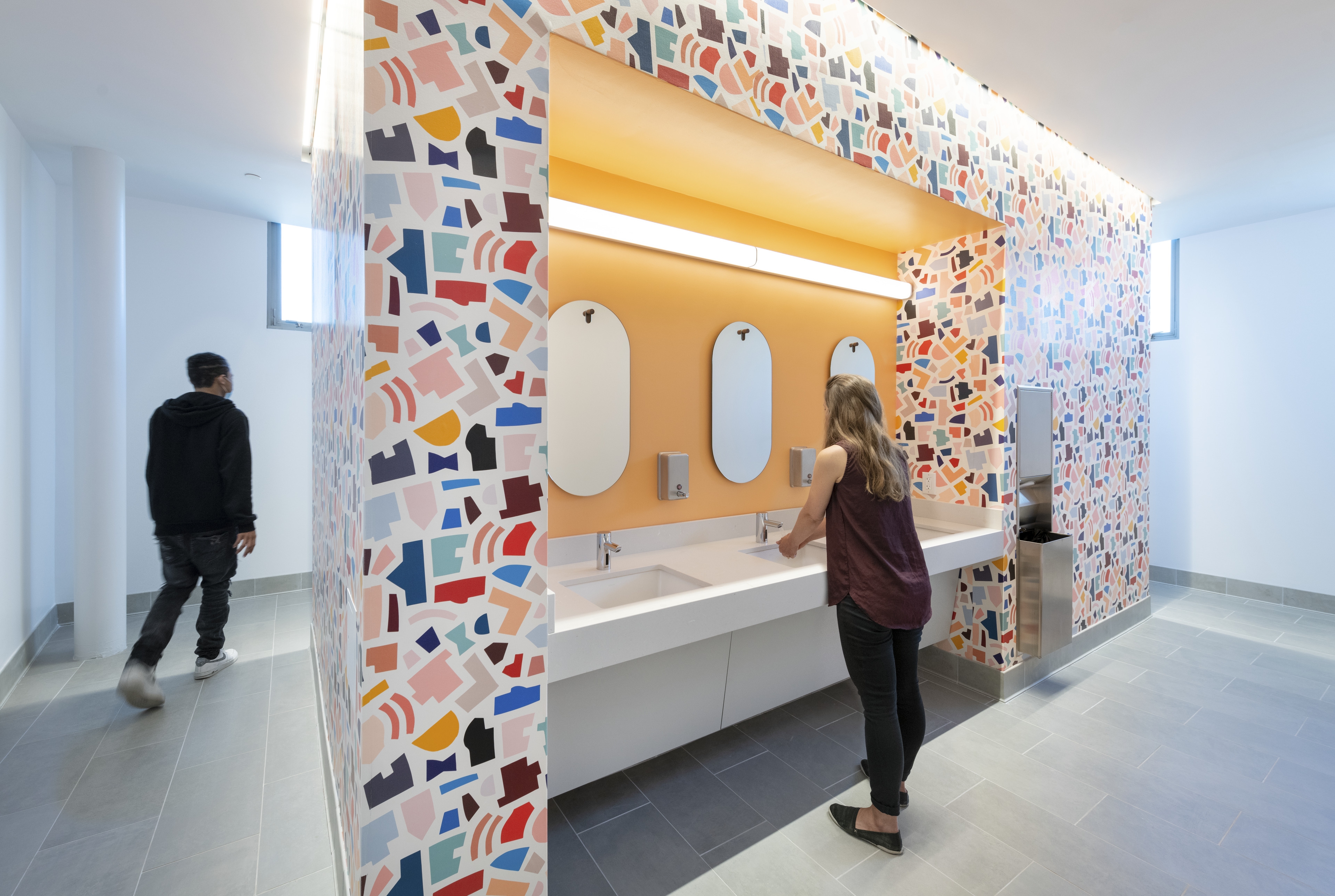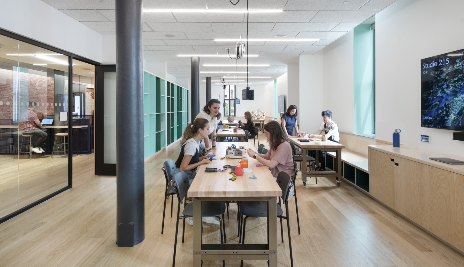 In the main connecting stair, linear accents integrated into the underside of the stair structure emphasize the tech-forward aesthetic, as a cluster of student-designed and constructed pendants hang through the multi-story space. Lam worked closely with The Possible Zone team to modify these decorative “Pangolin” pendants for commercial use, offering a chance to showcase students’ talents and celebrate their successes.