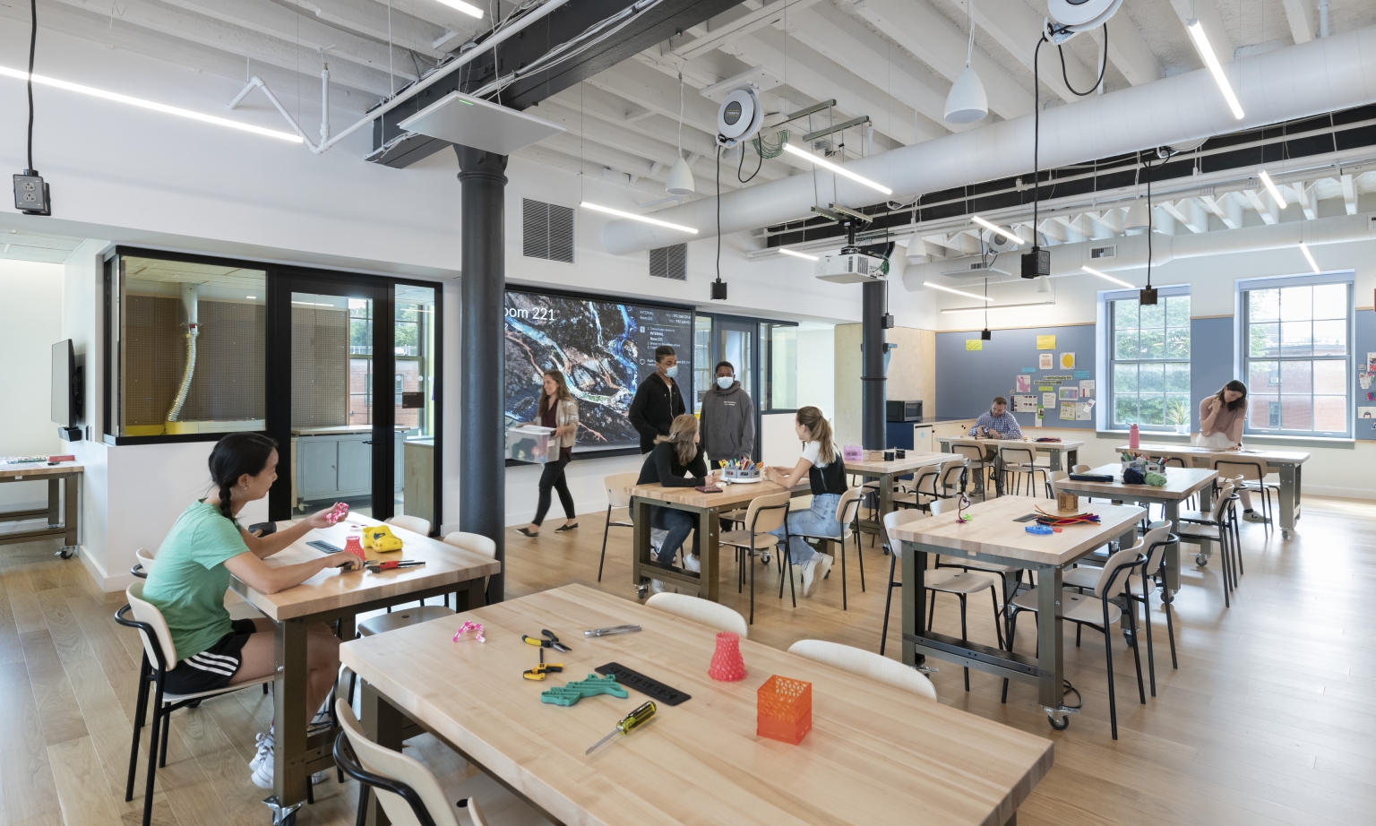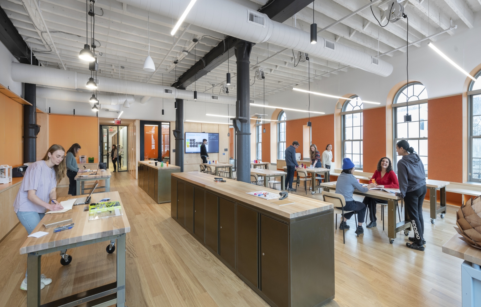 The facility houses various collaborative and creative spaces, including workshops, classrooms, and digital fabrication labs, illuminated with playful lighting design and a range of architecturally integrated details. An array of luminous tube pendants greets visitors at the main entry, suspended in a parametrically dynamic array to accentuate the forward-thinking pedagogy of the school. These tubes flow and adapt to the changing spaces throughout the project as a consistent element, acting as a visually dominant element in some locations, while providing a luminous datum in others.