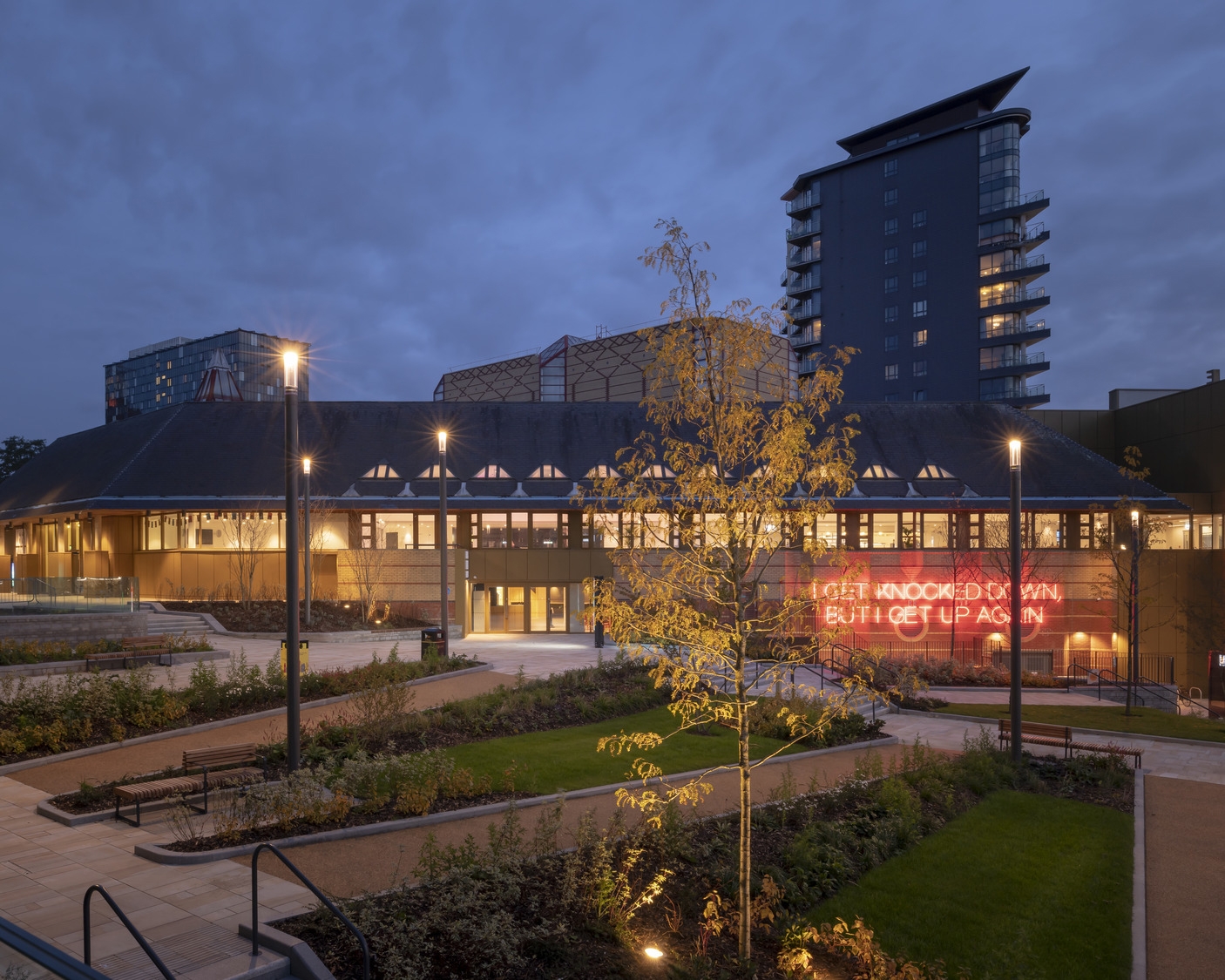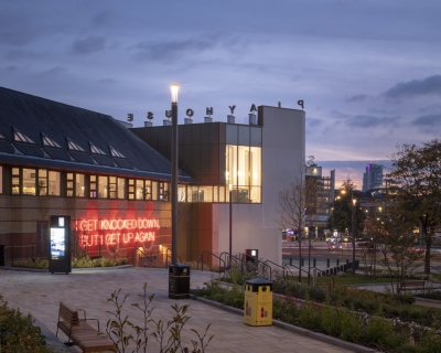 The Leeds Playhouse has been transformed by a radical reconfiguration and extension of the existing building to create a new face to the city. The external lighting looked to strengthen the visual identity of the Playhouse. Illuminated letters along the roofline help the new extension assert its presence on St Peters Street as it sits against larger scale neighbouring buildings. The letters are reminiscent of the original Leeds Playhouse, connecting the new extension back to the origins of the theatre. Up lighting to the ceramic façade reinforces the narrative behind the pattern of the panels. Each panel depicts actors in the foot lights looking out at their audience, with the fading of colours into darkness. Each panel is lit from the bottom (representing the stage foot lights) with the light fading as your eye rises up the panels. The use of coloured lighting further enhances the story behind the vibrant ceramics. The re-imagined original entrance onto Playhouse Square forms at gateway to the wider cultural quarter located in Quarry Hill. Existing under canopy lighting was updated with discreet downlights to form an inviting and clearly identifiable secondary entrance.