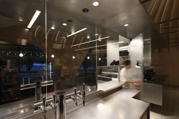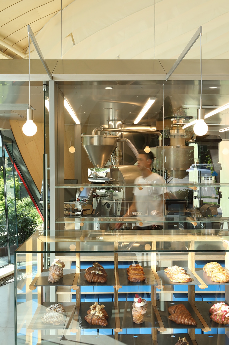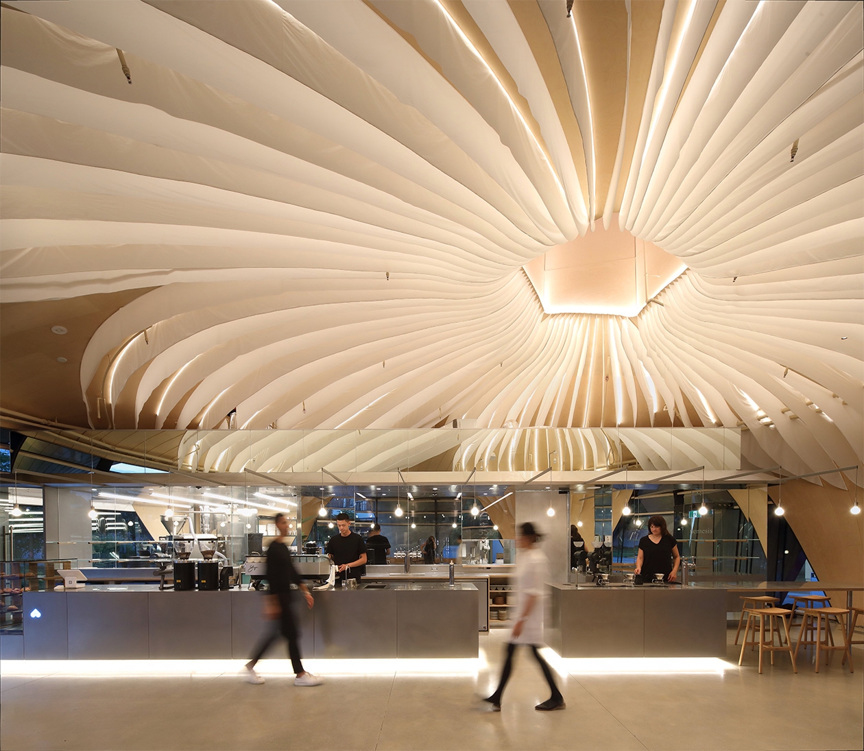 Layering light was achieved by first installing the flexible LED strip adjacent to every other fabric fin, thereby producing an ambient glow. A second layer of light consisted of accent lighting throughout the restaurant with suspended LED cylinders strategically mounted above the tables, decorative luminaires above the serving counter and task lighting for the back of house area. The result was a consistent experience between the front of house and back of house which can be observed while sitting in the restaurant looking through the glazing that separates the main hall from the coffee roasting area and the kitchens.