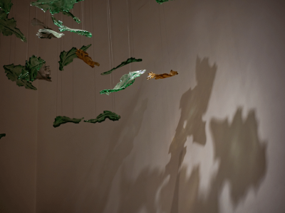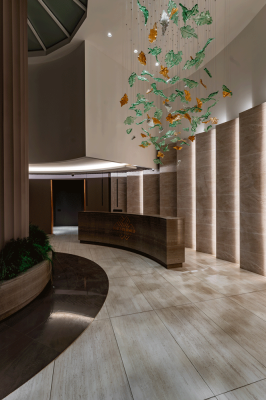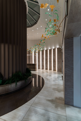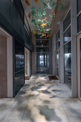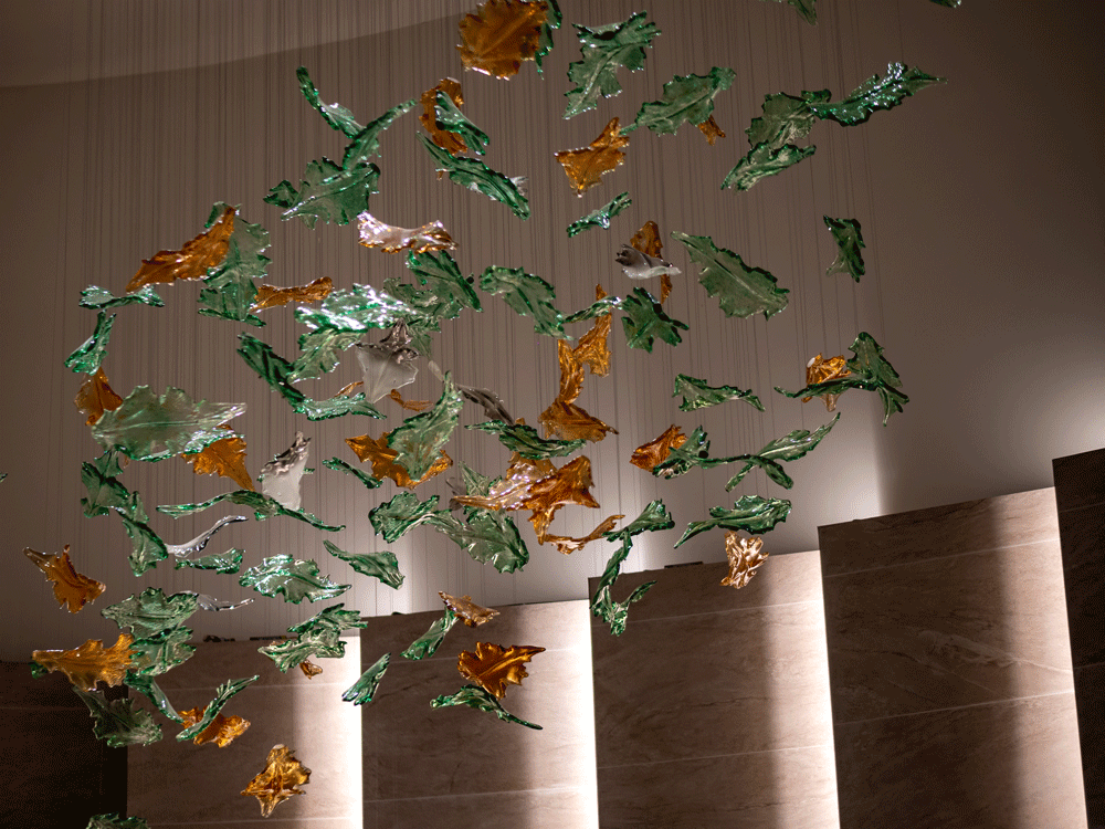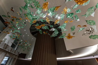 We filled the hall with aesthetic, highly functional light and worked out the semantic content of the space. We analyzed the volume and density of space, all angles of perception, and movement routes in the hall and developed lighting scenarios. We created the light glass sculpture in our Optical Metaphor glassblowing facility. All modules of the chandelier are made in the form of glass leaves, which are painted in natural tones and assembled in the form of a whirlwind to emphasize the Green Tower's connection with nature. We manually created glass elements and gave them different finishes: mirror, matte, and transparent natural shades. Each leaf is situated at a different height. The chandelier complimented the play of light with shadow patterns on the floor, giving the feeling of walking in a shady park.