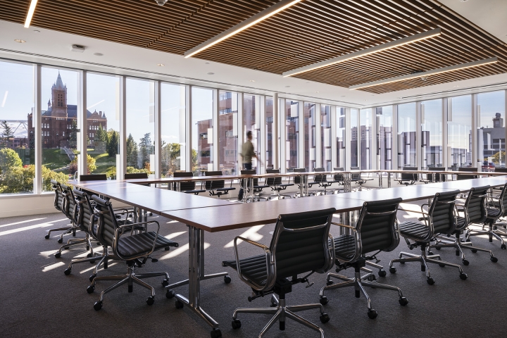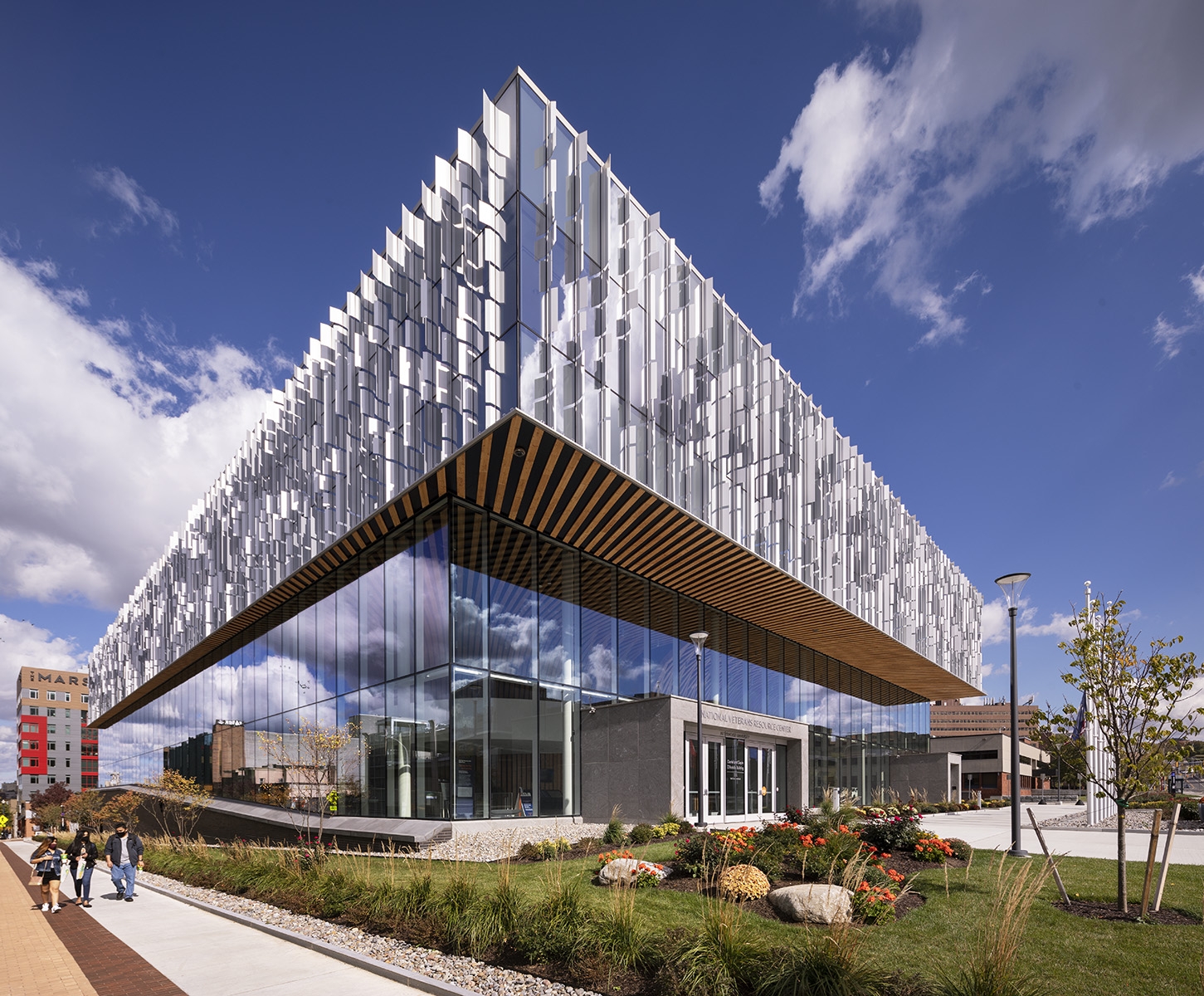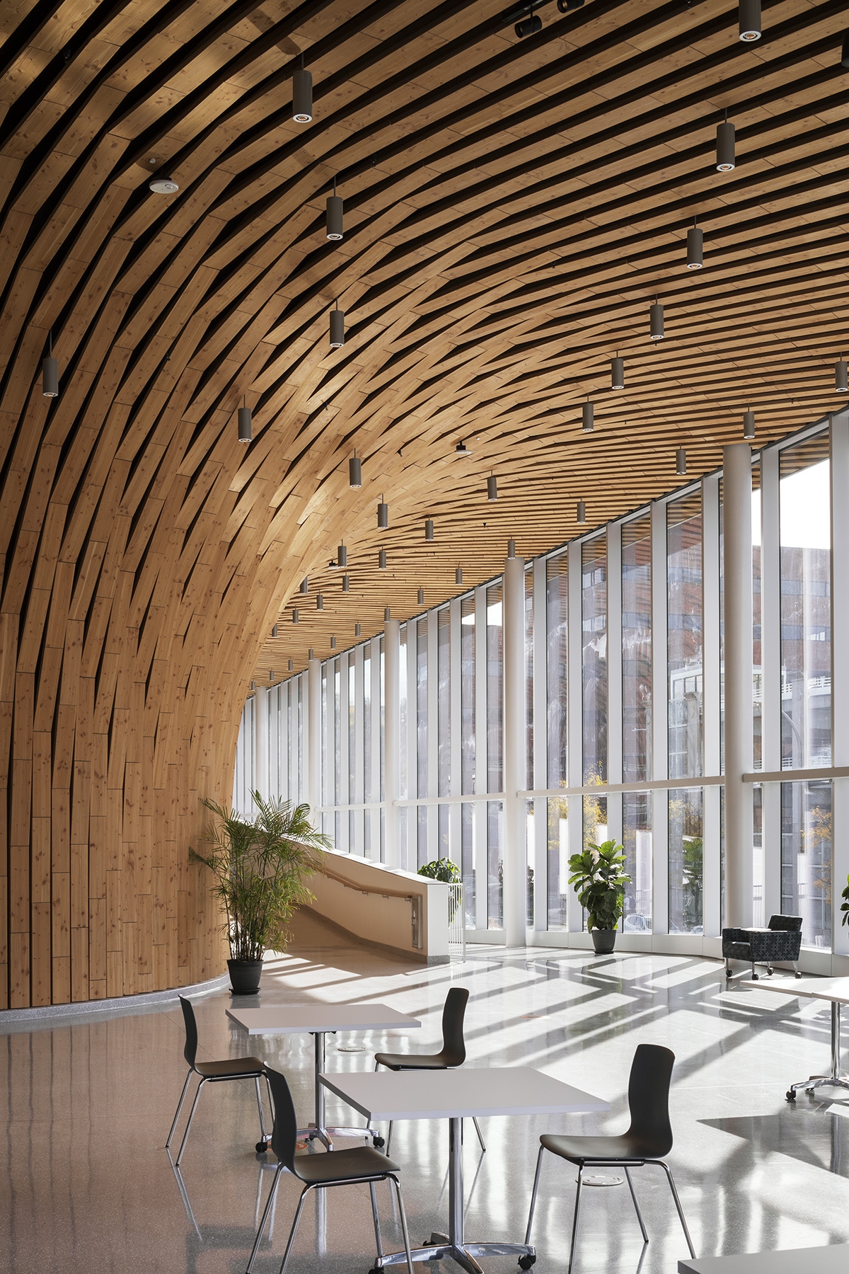 Offices, meeting rooms, and classrooms are located in the upper portion of the building and are situated around a central rooftop courtyard enabling more access to daylight. Metal fins on the façade create visual interest and help mitigate glare. The interiors utilize high-efficiency linear lensed LED lights to provide general illumination suitable for educational and professional purposes. These fixtures also employ wireless controls that play an integral role in reducing energy consumption and creating a comfortable work environment.