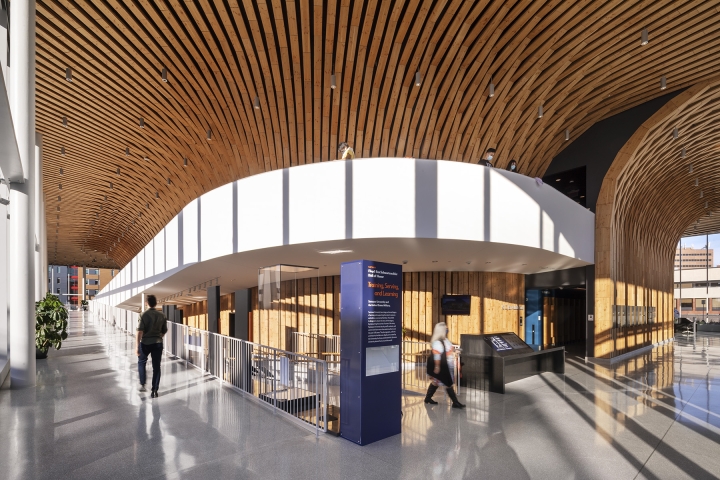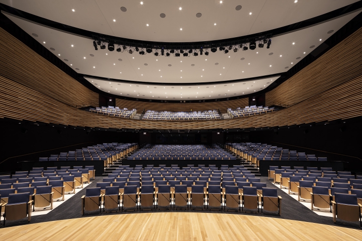 The National Veterans Resource Center aims to provide a welcoming and supportive atmosphere for veterans and families. The large wooden hull of the lower half of the building opens up towards the street. At night, pendants with adjustable LED gimbals create a soft glow that features the warm tones of the barreled wood ceiling and draws interest inwards. The walls of the amphitheater are lined with a similar timber treatment. The deep regressed LED accent lights keep the ceiling quiet while providing the necessary light levels for the audience seating and stage to help to reinforce a sense of calm and focus.