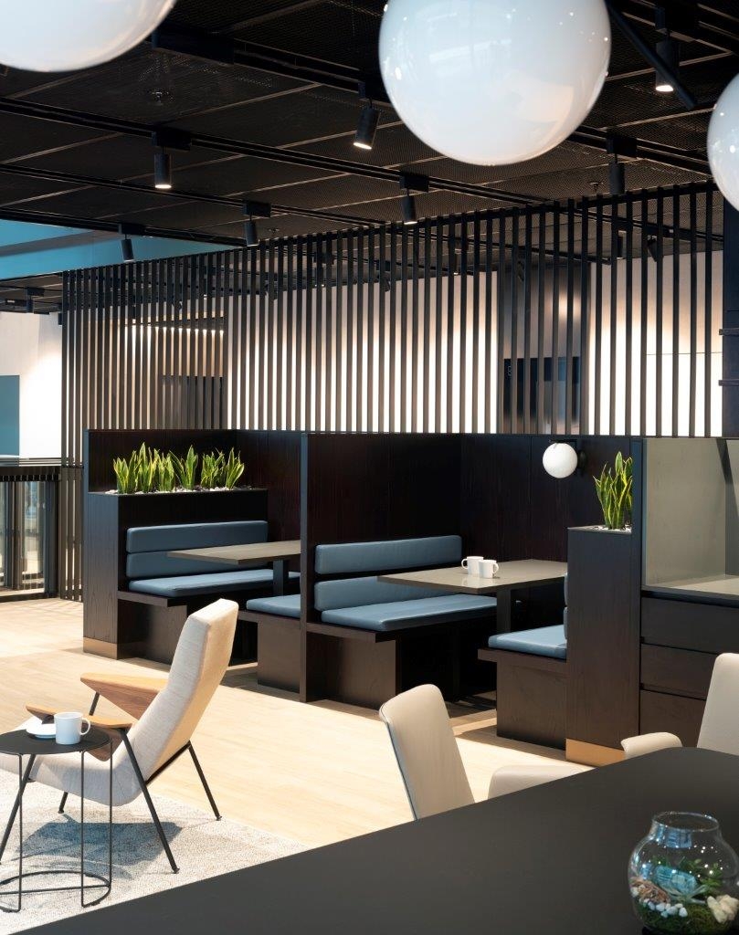 The unique palette of black with black meant that standard lighting could not be used. Backlighting to the ceiling produces a warm upward high-level wash; a bright daylit ceiling yet retaining black as a translucent layer.