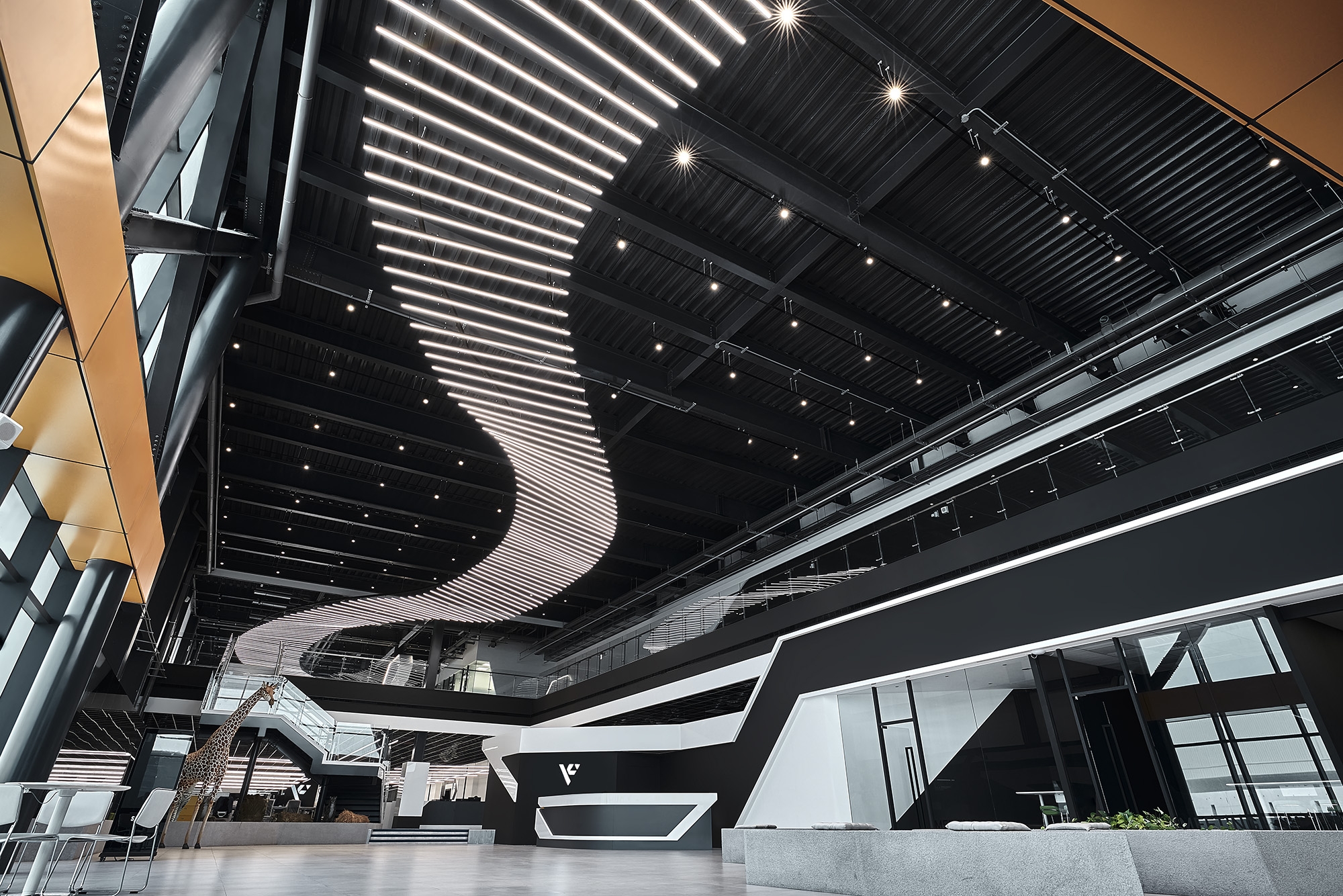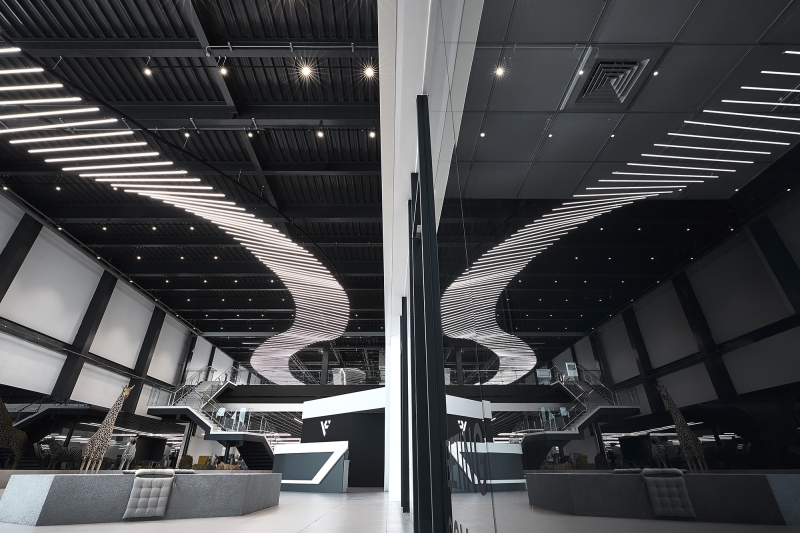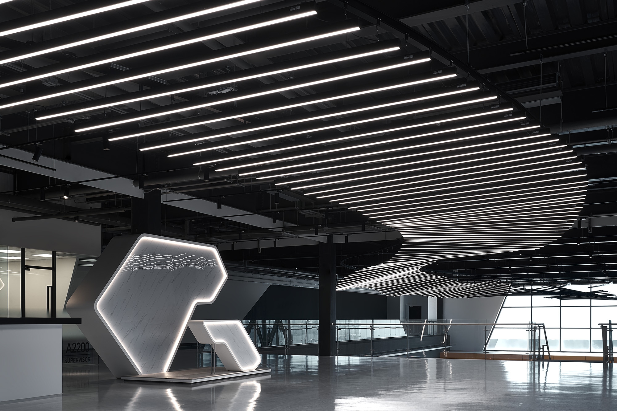 The 60-meter-long river is used as the main focus of the lighting design and is installed on the ceiling, creating a sense of three-dimensionality, dynamics, and layers. Through a simple and delicate linear arrangement of light pipes and a three-dimensional design approach, the designer creates a modern and sleek style that gives the impression that there is nothing like a regular and boring office. Through the designer’s ingenuity, the geometric aesthetics are combined with the side-by-side display of lamps to show a harmonious and artistic aesthetic. The Oriental feng shui culture is introduced into the design concept, and the image of water, which symbolizes the flow of life and wealth, is presented as an endless river-like image for the arrangement of the lamps, allowing the auspiciousness to flow in the space. By doing so, the designer produces a modern and fashionable shape and represents good luck for the company.