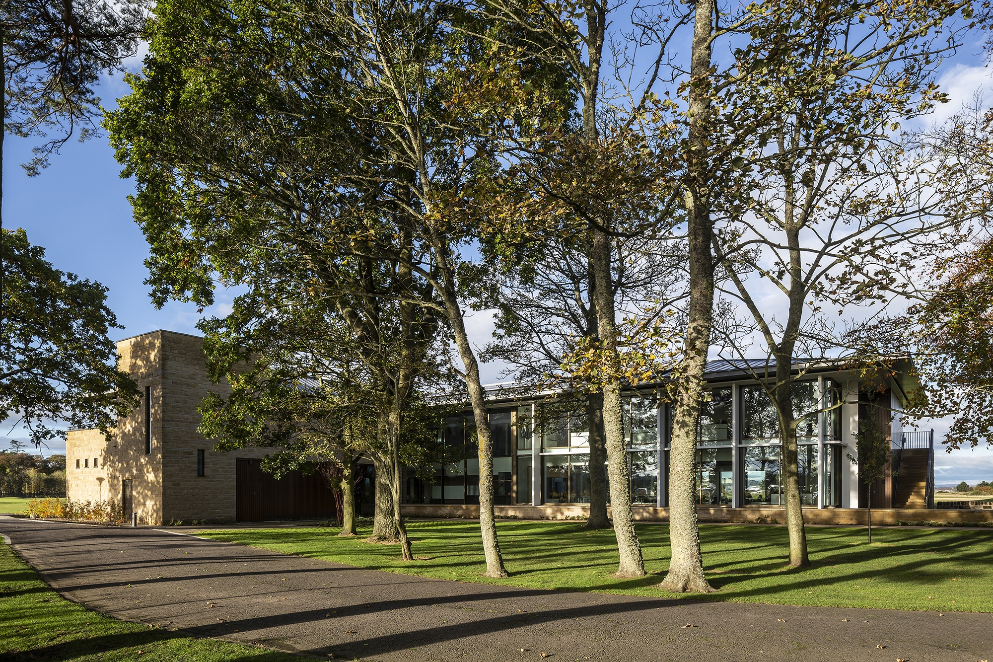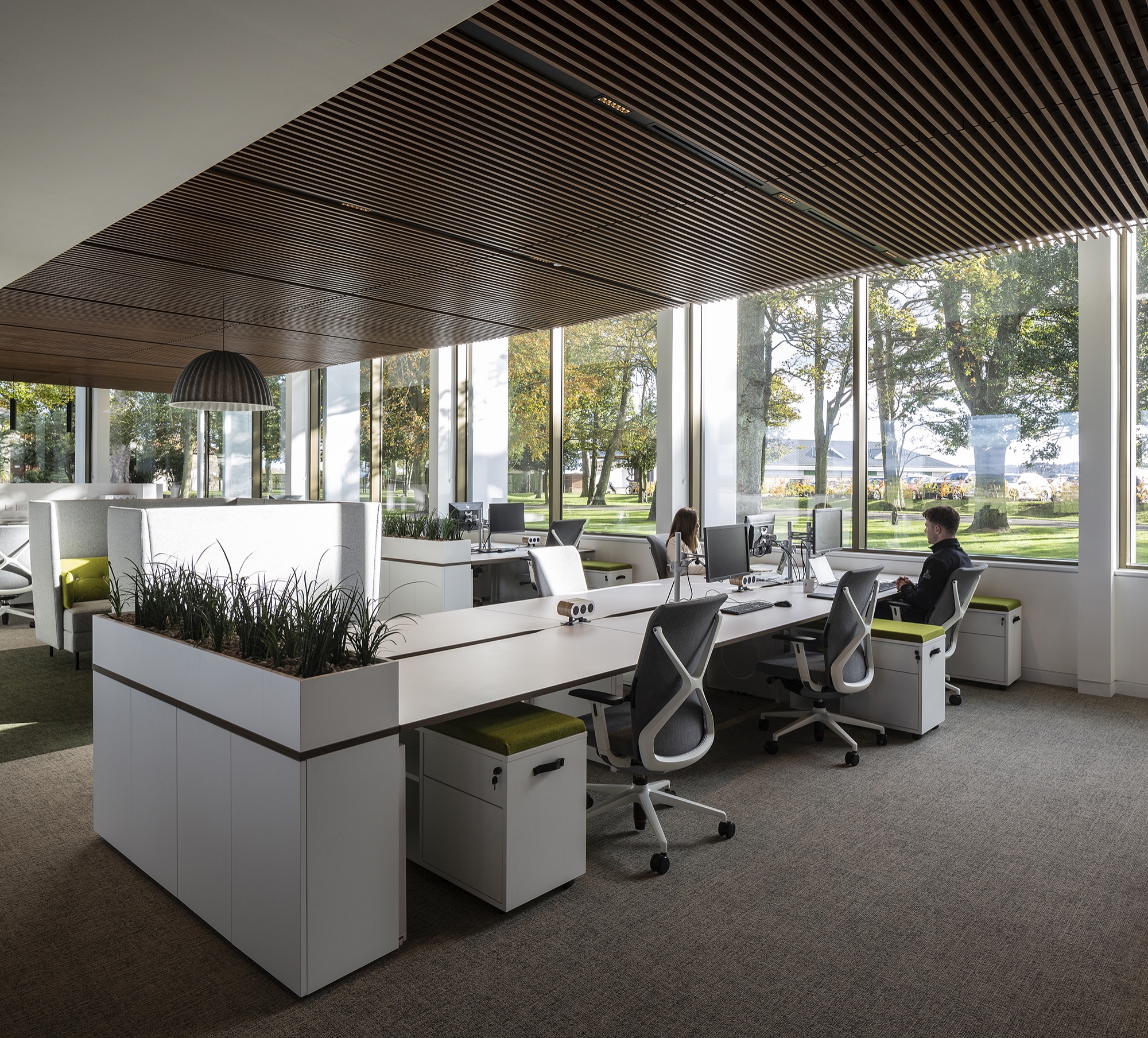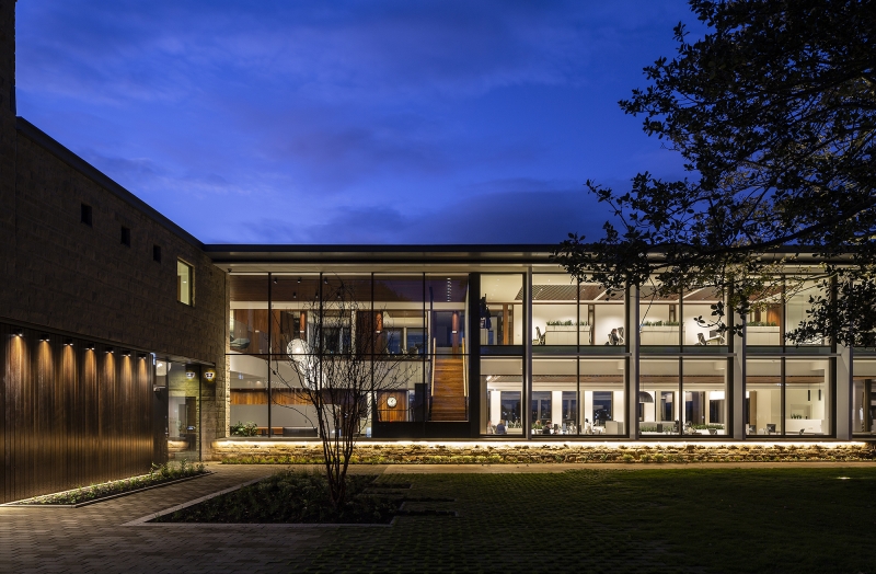 The high percentage of glazing reveals the interior layout, its surfaces, and finishes. These surfaces are illuminated to support the natural lighting provision, as well as providing a night-time expression, establishing it within its setting. This is augmented with a minimum of exterior lighting applied to the building and integrated into the landscape to ensure safe circulation.
