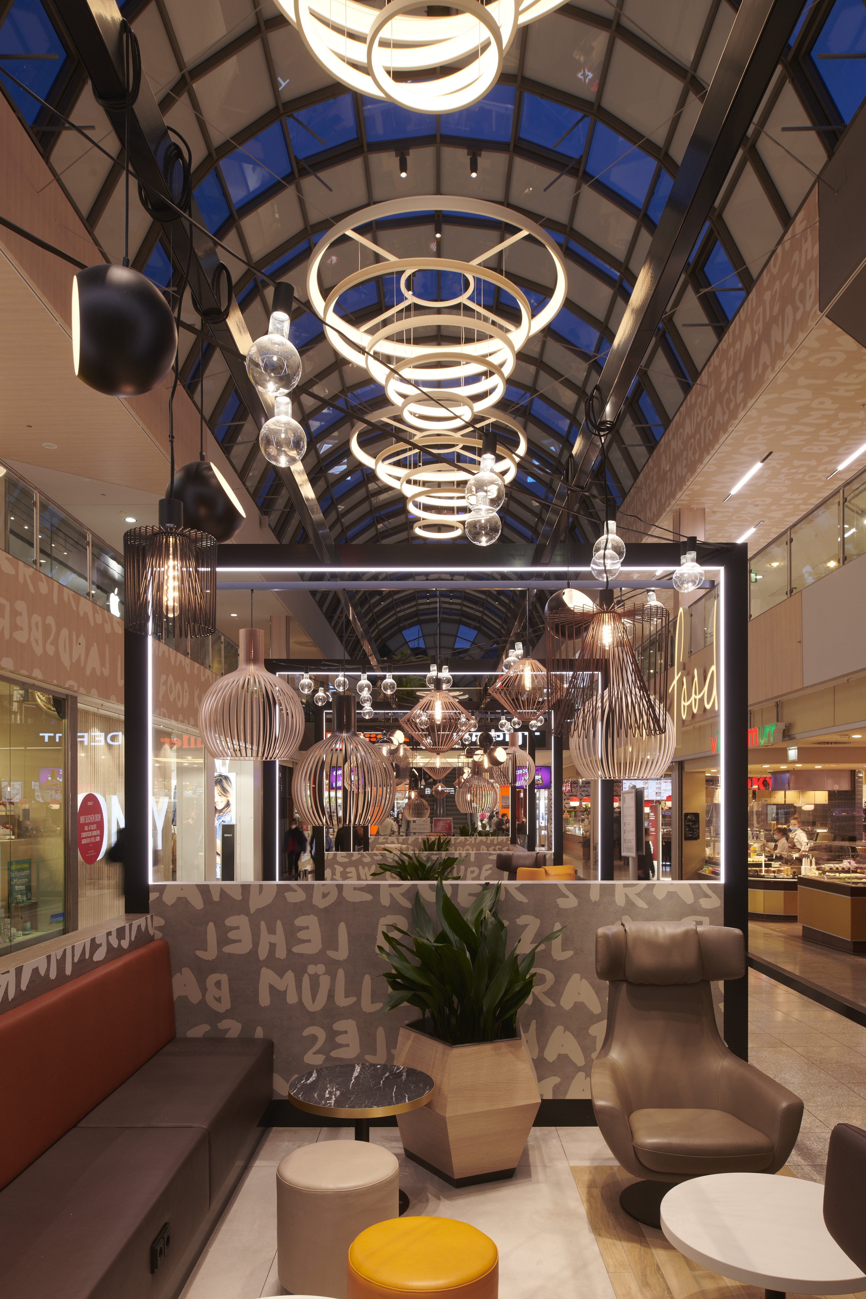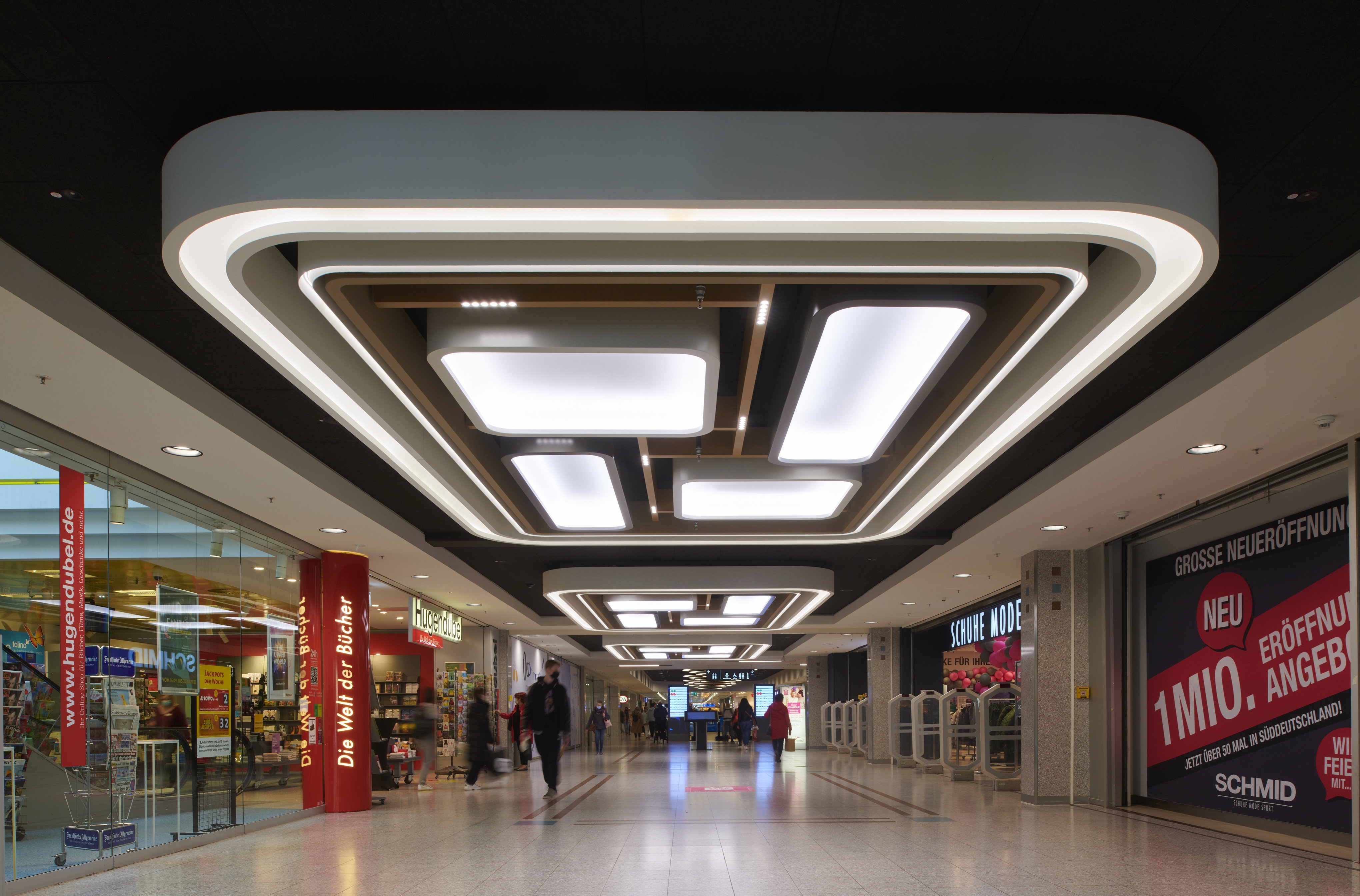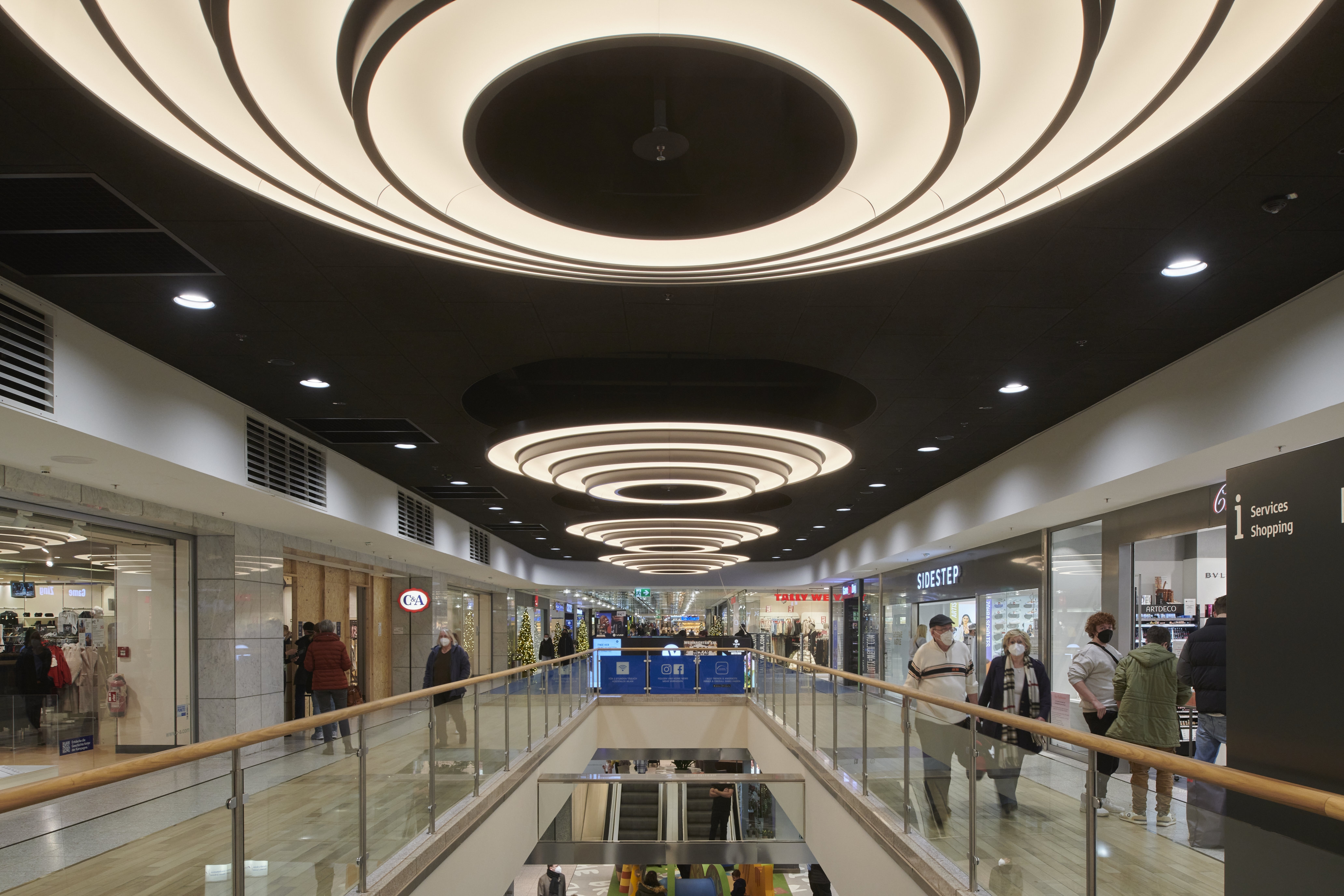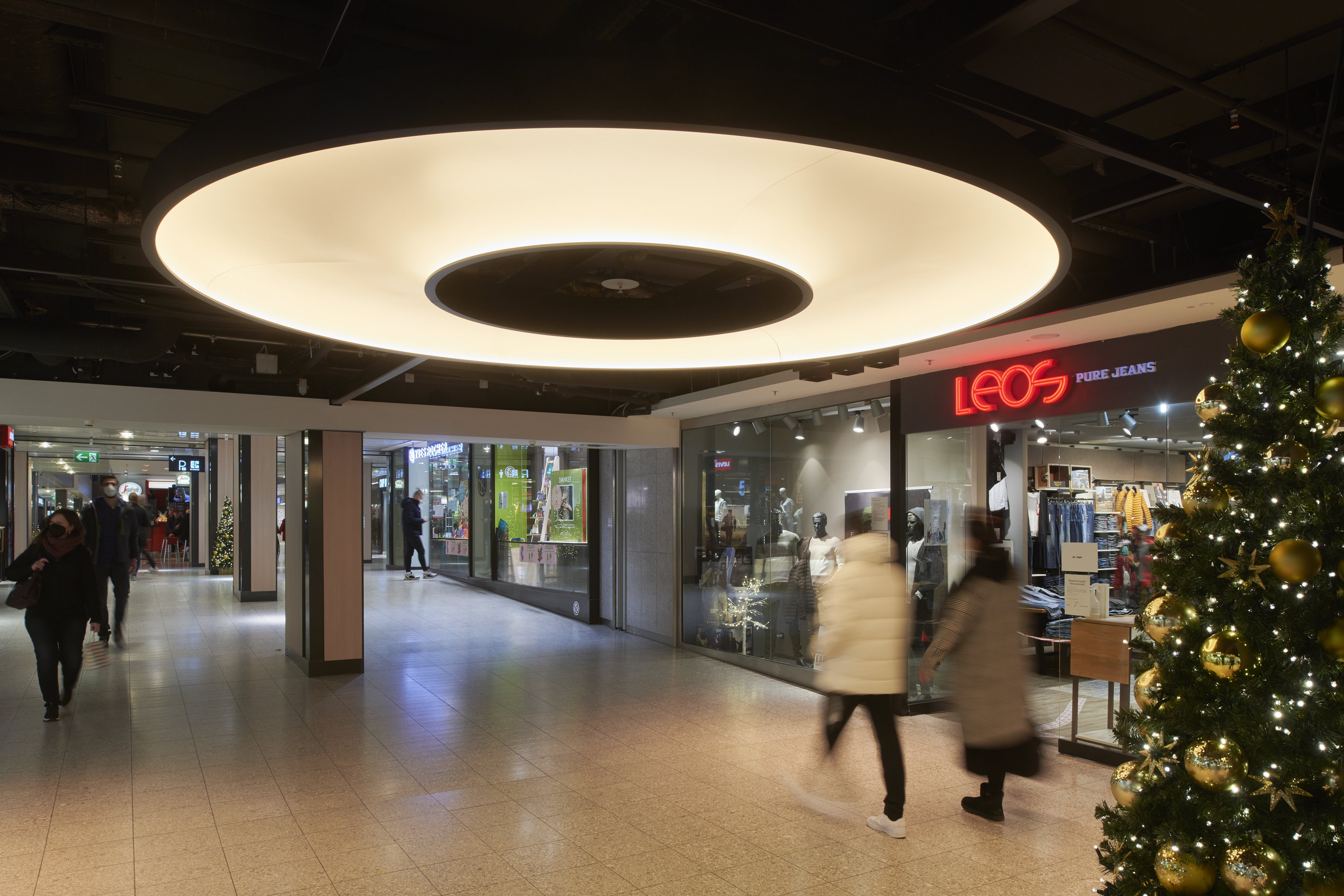 Entry DescriptionThe lighting climate was designed in the spirit of "Human Centric Lighting" and was also deliberately made much more contrasting and varied. As this is a mall here a shopping experience is to be created, all decorative ceiling elements were designed in terms of lighting technology to create generous diffuse light areas on the ceiling, equipped with sufficient luminous fluxes to emulate the natural sky. These were supplemented with luminaires that produce brilliant directional light, thus imitating the proportion of direct sunlight from nature. All luminaires are equipped with mixing white light. The mixture of different types of light ensures that a vitalising and courteous lighting climate is created at all times. In terms of sustainability, all luminous ceilings have been designed in a new style. This completely eliminates the use of diffuser foils, because these become dirty over time and the quality of light decreases due to the ageing process. In our case, the light is generated in a gap and distributed over the entire surface via a specially shaped and coated reflector. The light gap is integrated into the reflector design in such a way that an observer cannot be glared.