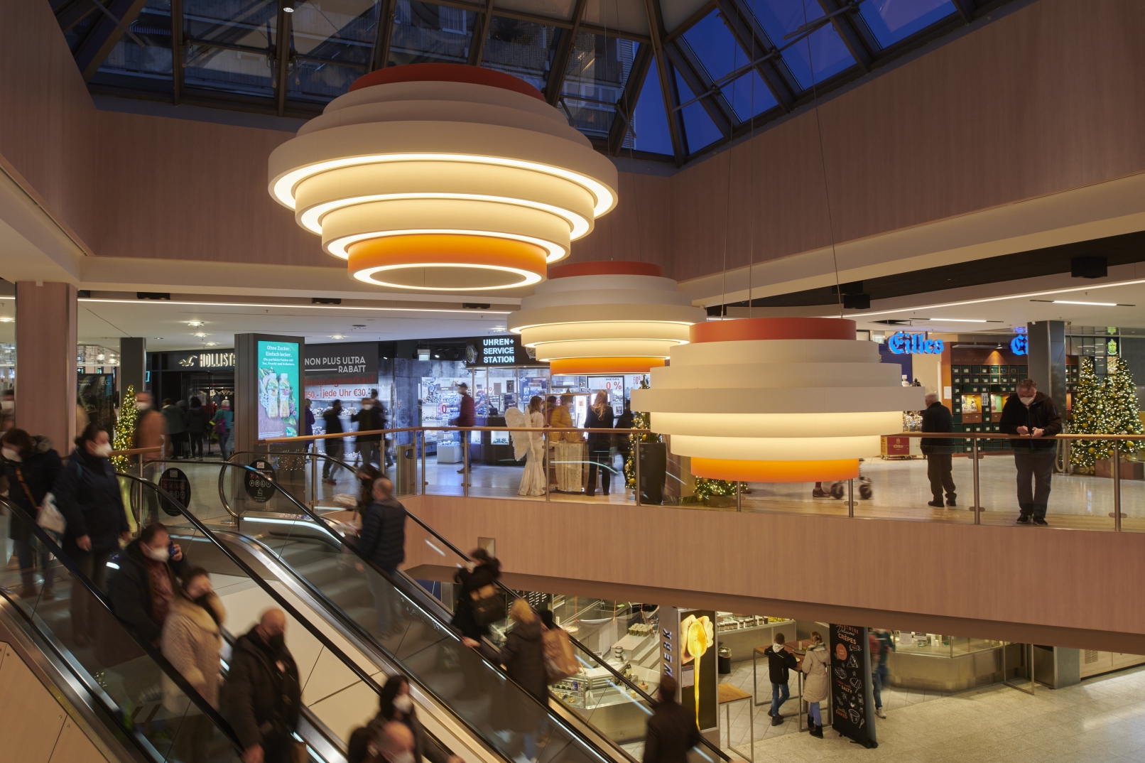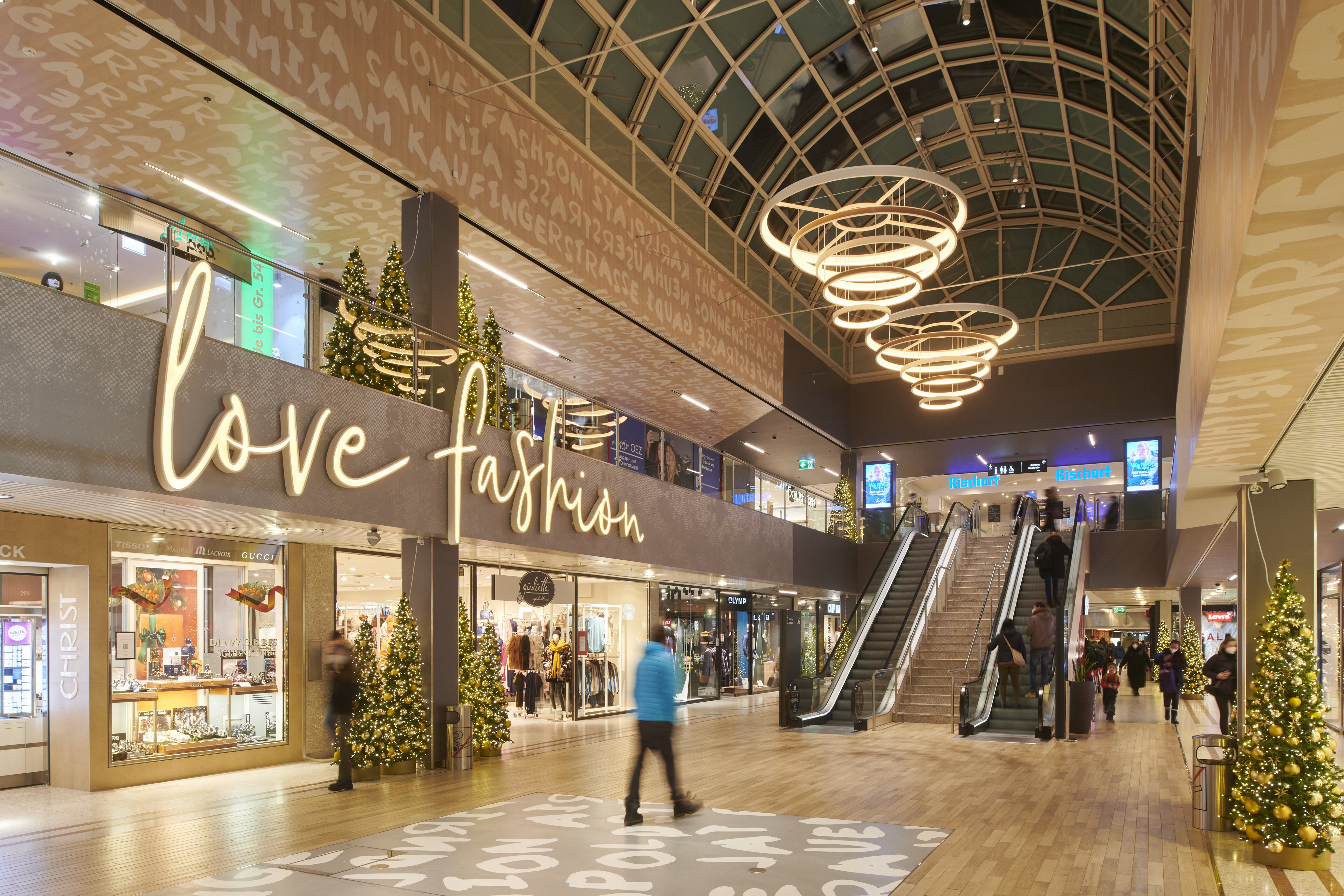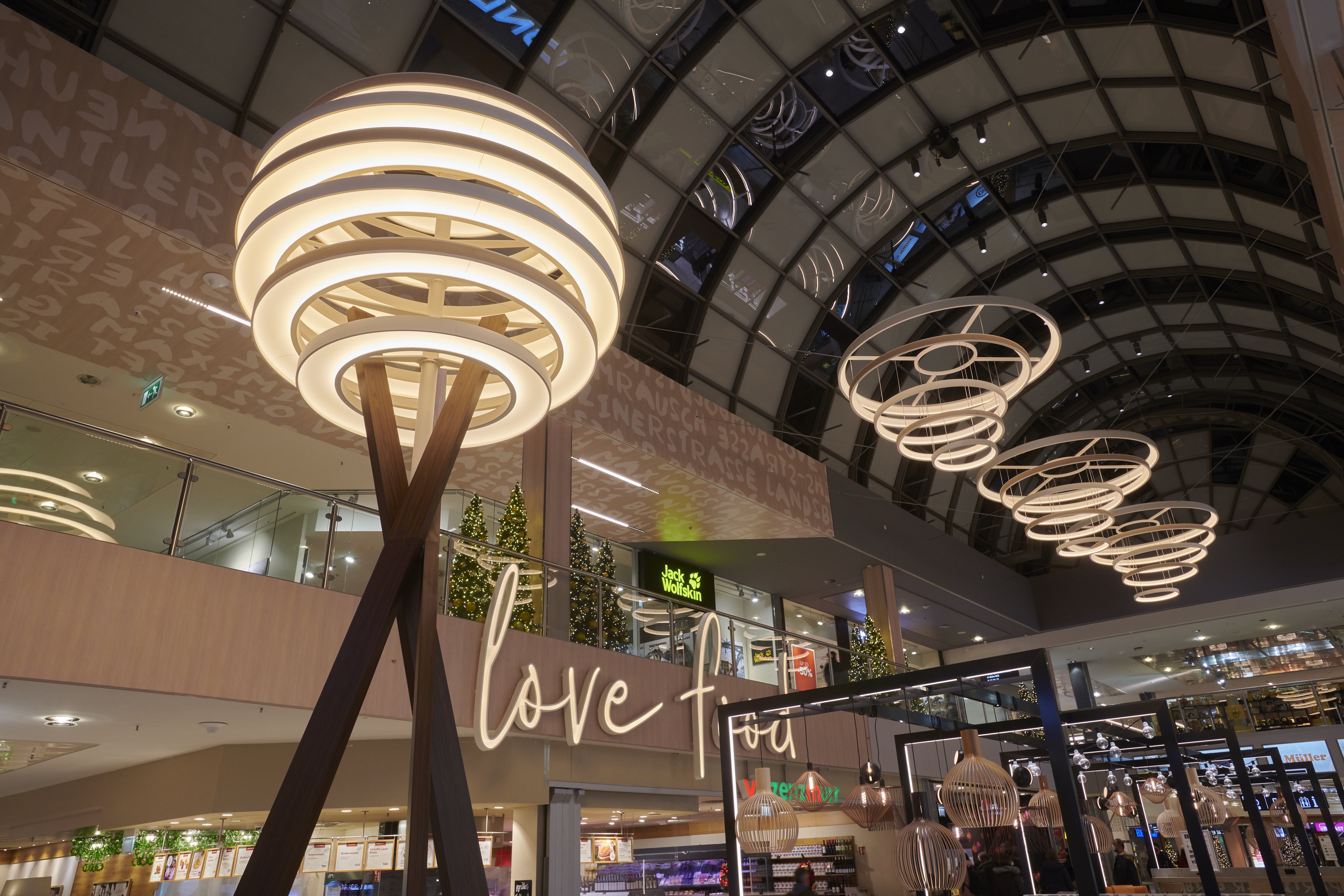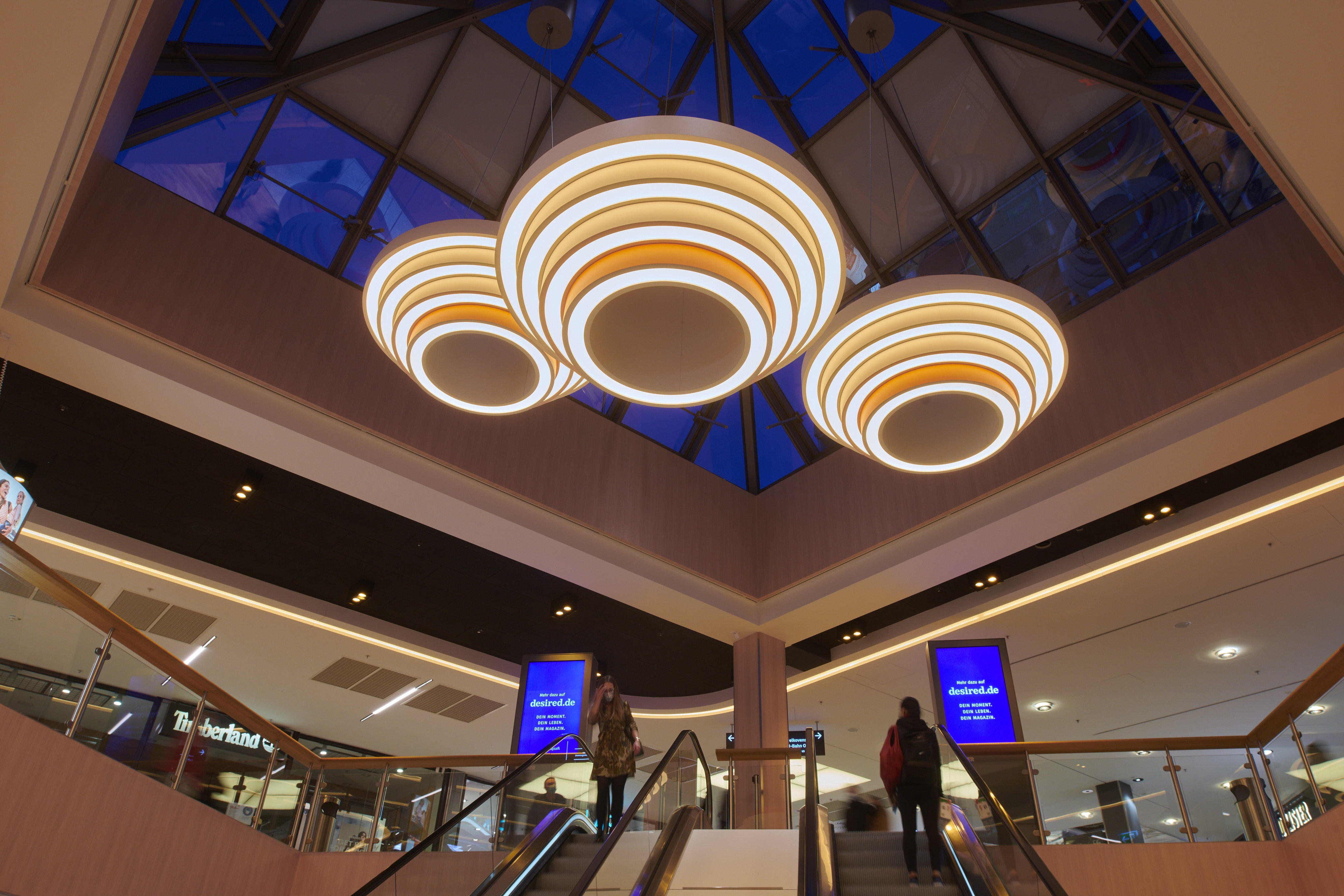 Entry DescriptionThe lighting climate was designed in the spirit of "Human Centric Lighting" and was also deliberately made much more contrasting and varied. As this is a mall here a shopping experience is to be created, all decorative ceiling elements were designed in terms of lighting technology to create generous diffuse light areas on the ceiling, equipped with sufficient luminous fluxes to emulate the natural sky. These were supplemented with luminaires that produce brilliant directional light, thus imitating the proportion of direct sunlight from nature. All luminaires are equipped with mixing white light. The mixture of different types of light ensures that a vitalising and courteous lighting climate is created at all times. In terms of sustainability, all luminous ceilings have been designed in a new style. This completely eliminates the use of diffuser foils, because these become dirty over time and the quality of light decreases due to the ageing process. In our case, the light is generated in a gap and distributed over the entire surface via a specially shaped and coated reflector. The light gap is integrated into the reflector design in such a way that an observer cannot be glared.