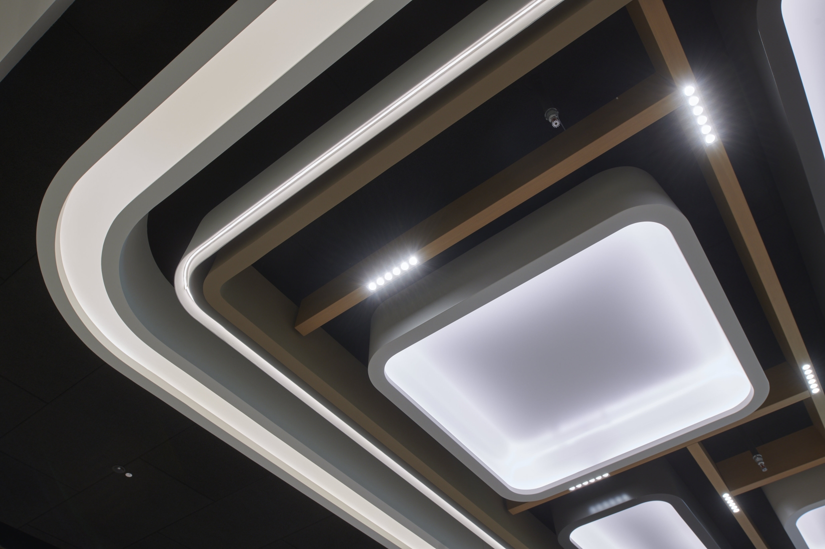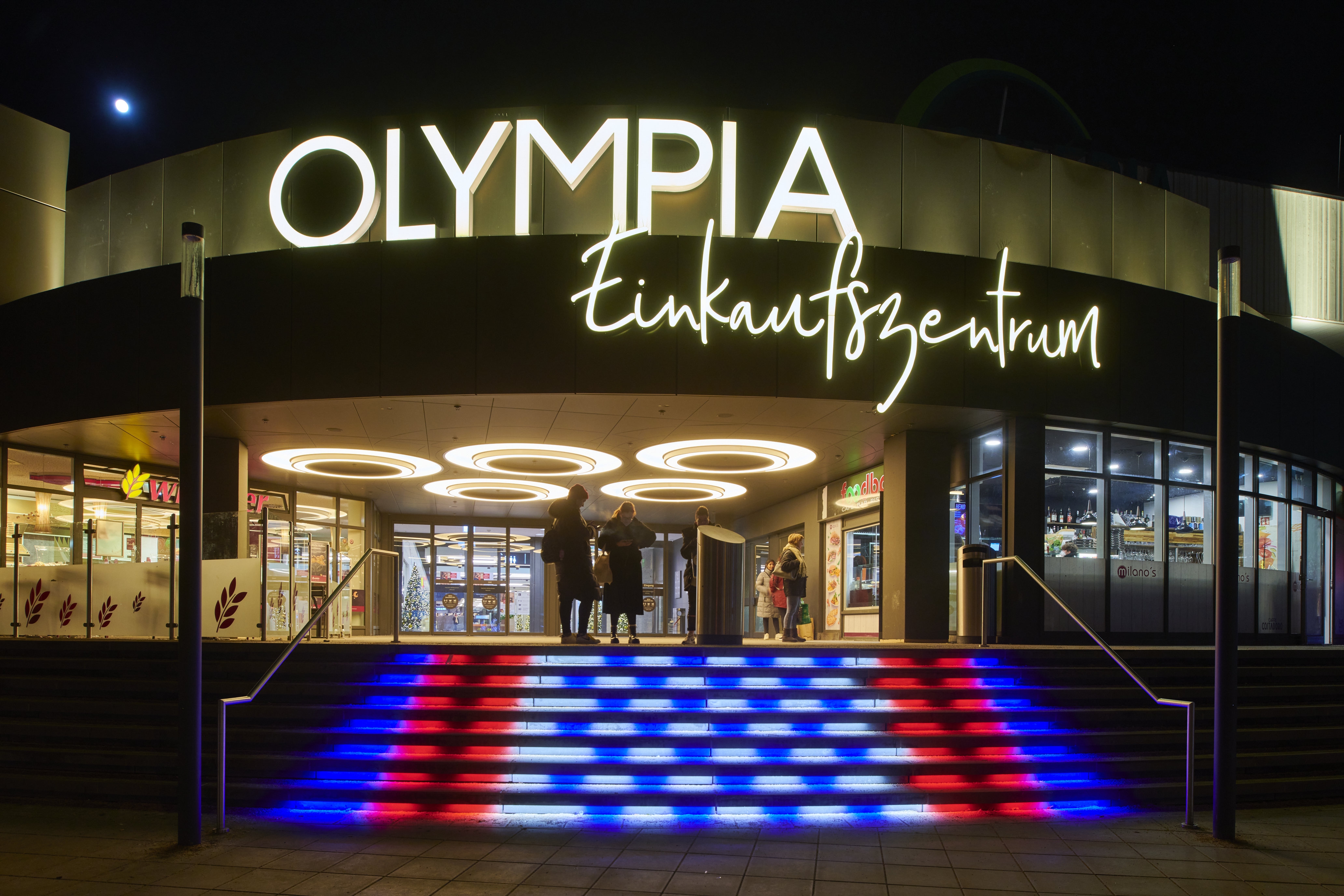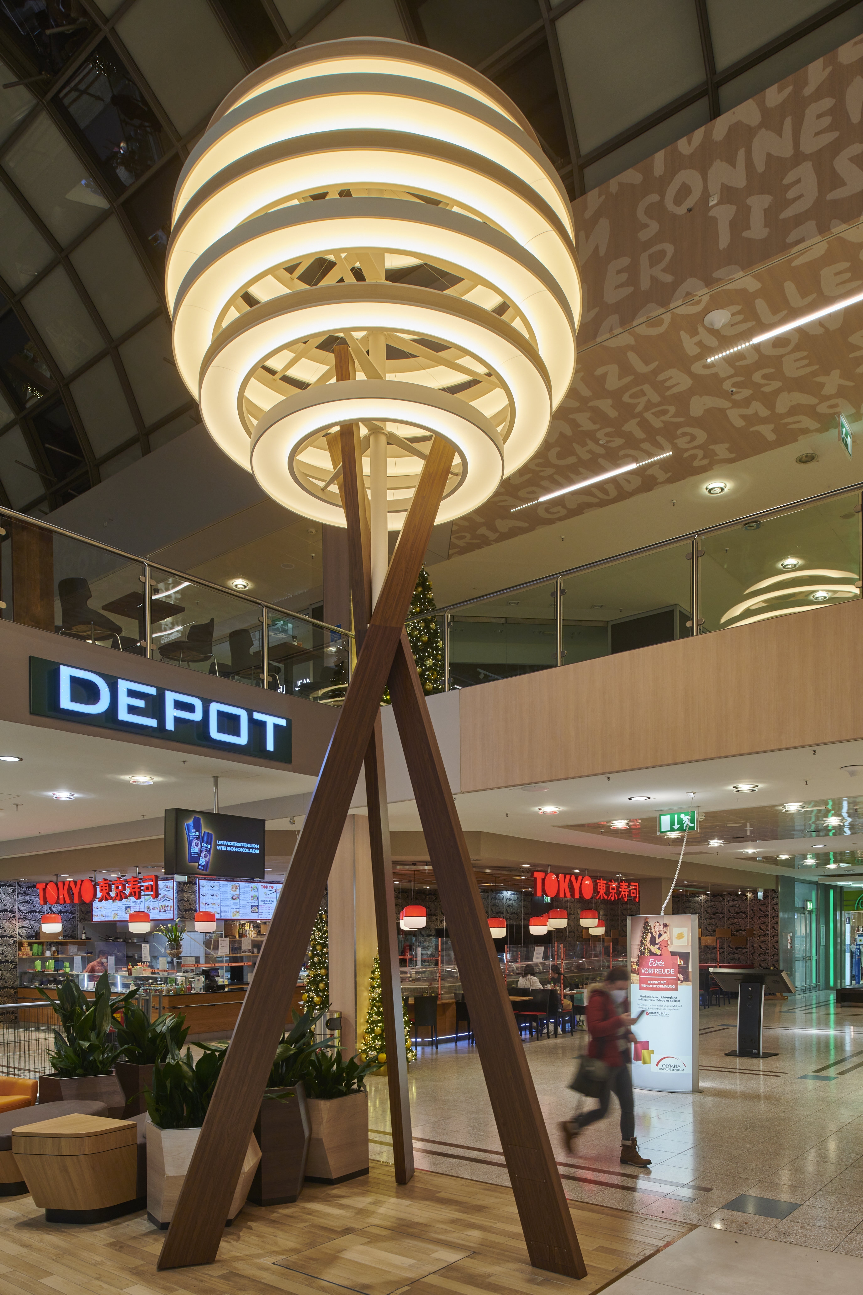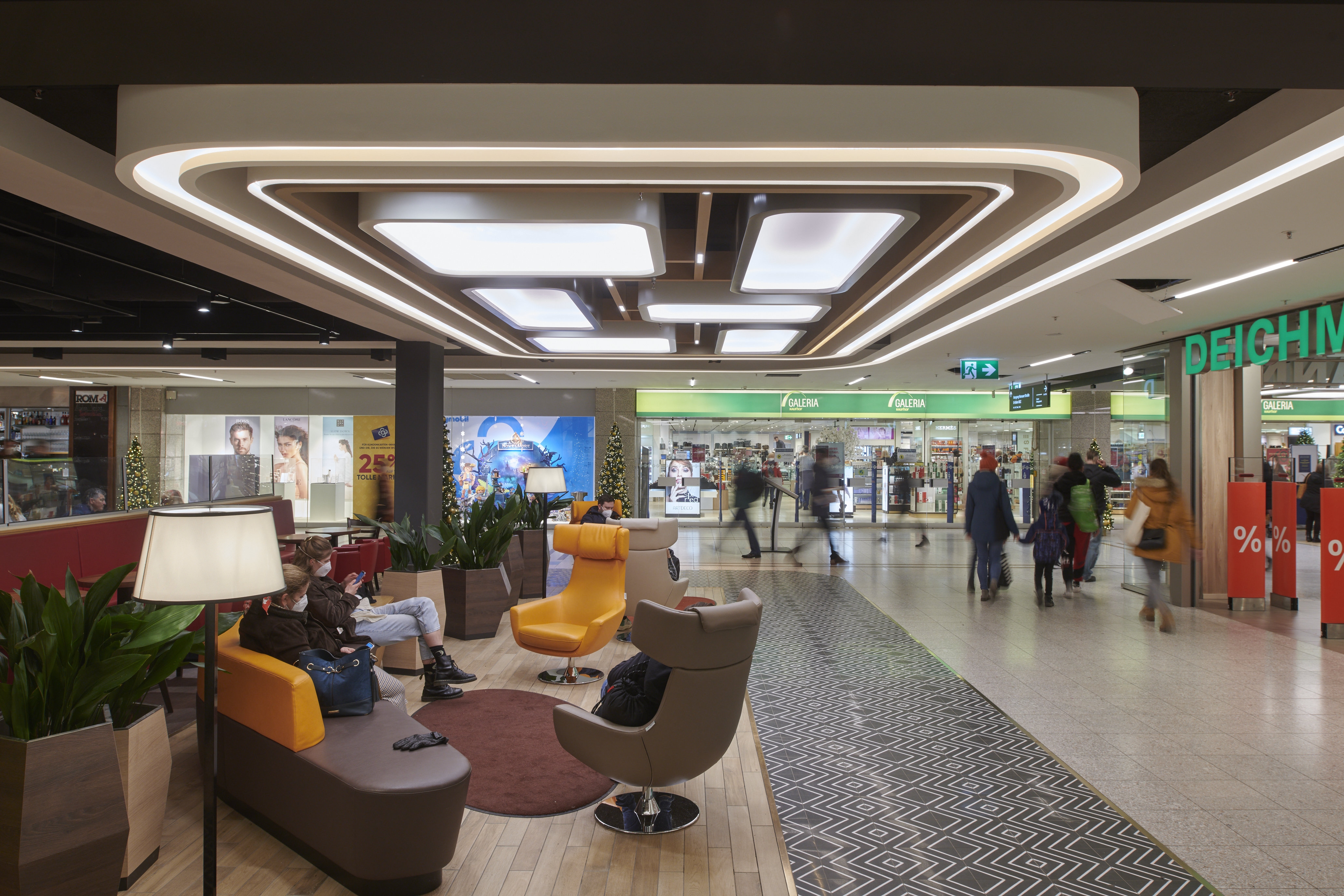 Entry DescriptionThe lighting climate was designed in the spirit of "Human Centric Lighting" and was also deliberately made much more contrasting and varied. As this is a mall here a shopping experience is to be created, all decorative ceiling elements were designed in terms of lighting technology to create generous diffuse light areas on the ceiling, equipped with sufficient luminous fluxes to emulate the natural sky. These were supplemented with luminaires that produce brilliant directional light, thus imitating the proportion of direct sunlight from nature. All luminaires are equipped with mixing white light. The mixture of different types of light ensures that a vitalising and courteous lighting climate is created at all times. In terms of sustainability, all luminous ceilings have been designed in a new style. This completely eliminates the use of diffuser foils, because these become dirty over time and the quality of light decreases due to the ageing process. In our case, the light is generated in a gap and distributed over the entire surface via a specially shaped and coated reflector. The light gap is integrated into the reflector design in such a way that an observer cannot be glared.
