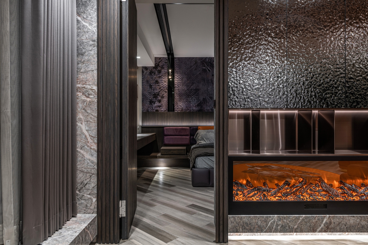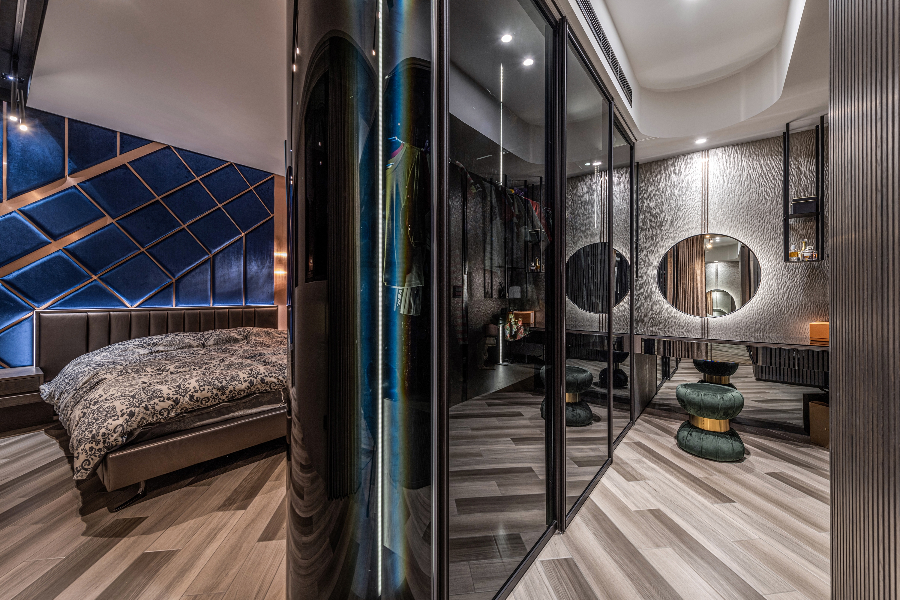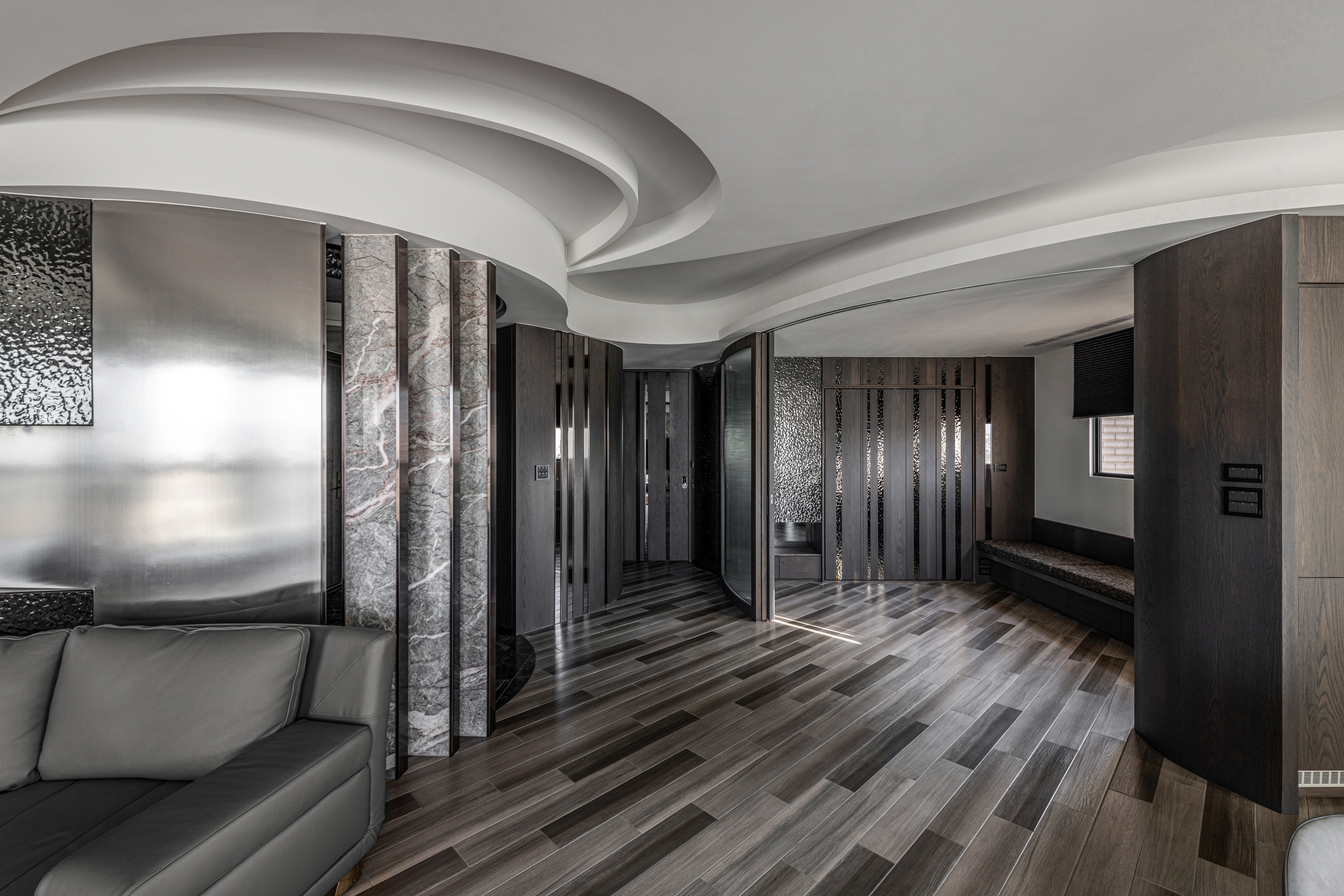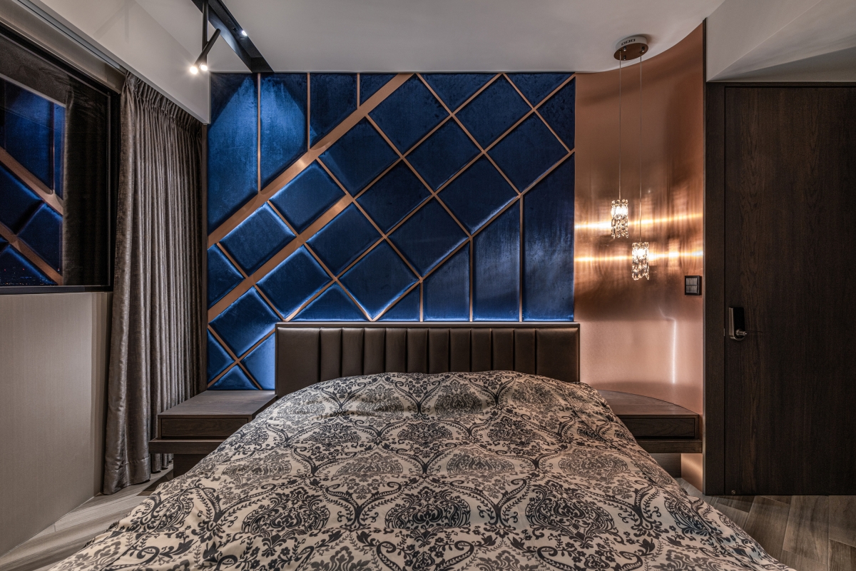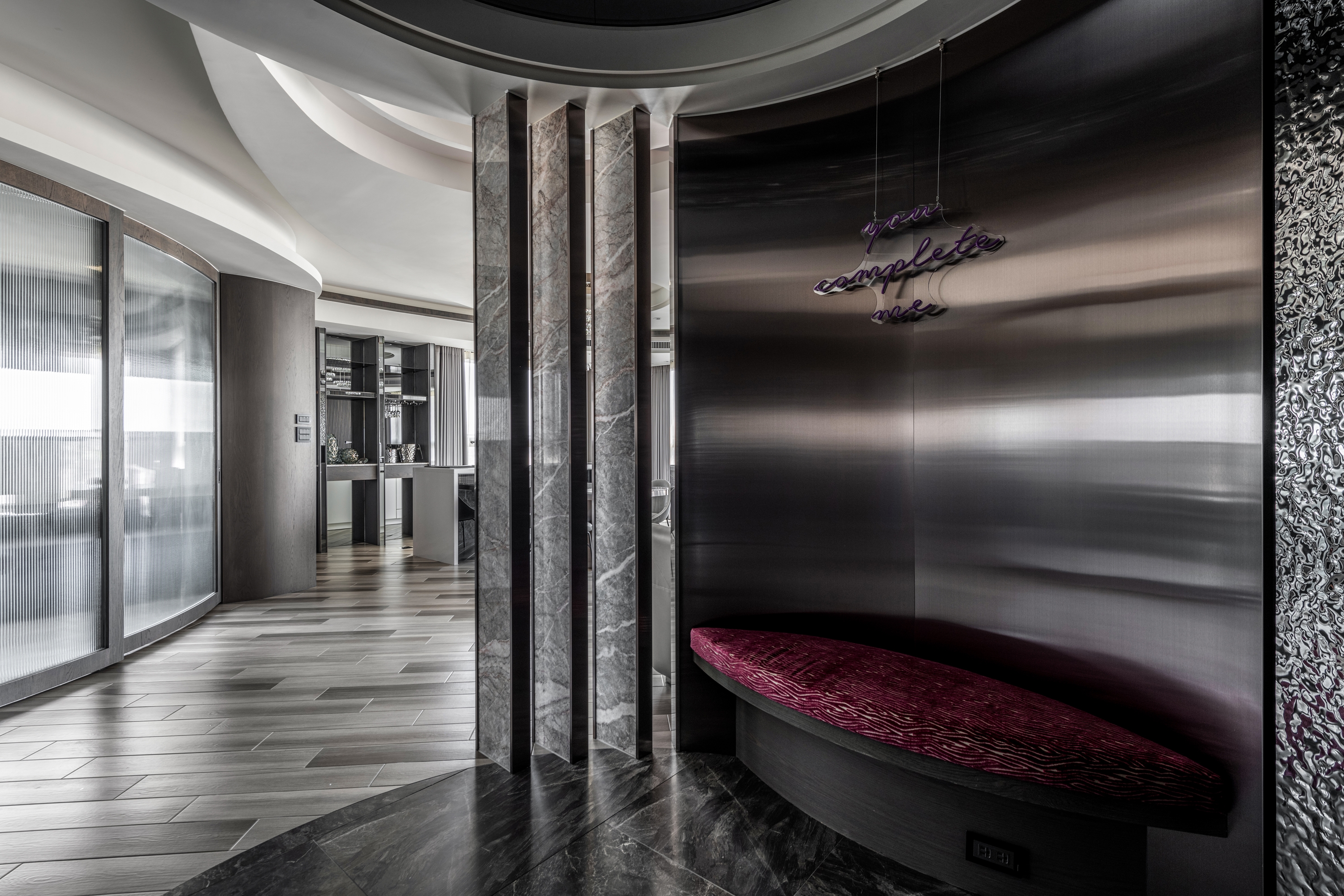 Entry DescriptionGroove comes from the rhythm, which includes the melody of high and low, strength and weakness, and the sense of rhythm that can make people relax, follow the vibe and flow of the music. In this apartment, the designer brings the rhythm of groove dance into the space with irregular curved lines, through the layered curved ceiling and sloping flooring pattern, creating a visual effect of groove in the space. The ceiling is designed with three different heights to improve the oppressiveness brought by the large beams, and to create a sense of visual rhythm on the façade. In terms of space arrangement, the curved circular movement also brings convenience to daily life. Through lighting design and reflection of reflective materials, many white arcs overlap and extend infinitely in the space, creating a natural and lively dance effect and bringing out a modern sense of style. The left side of the master bedroom is also curved to create a gentle embrace around the bed. The bronze metallic material and blue reflective bandage create a dance floor-like effect. At night, with reflected dim light, it gives the space a sense of understated luxury.