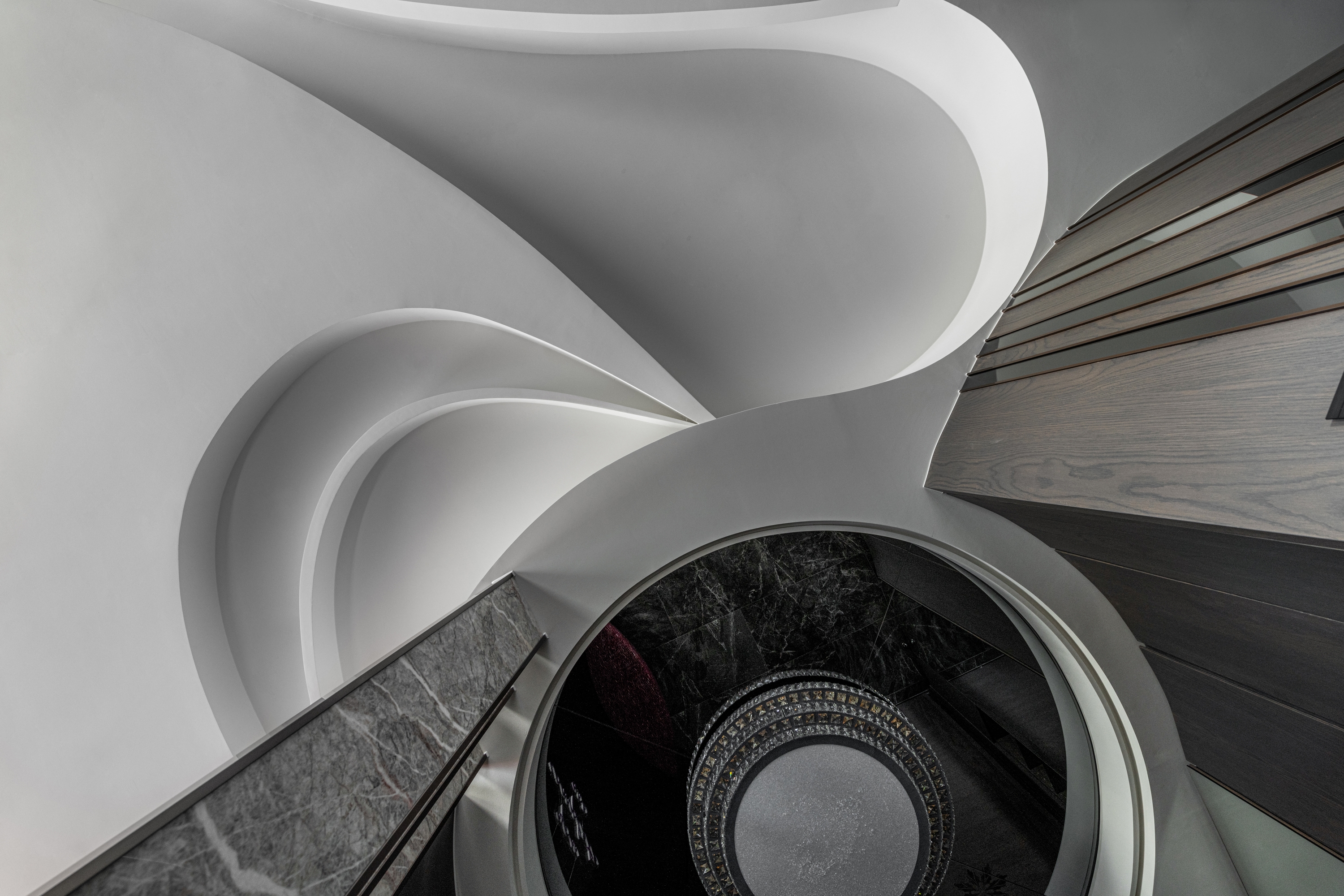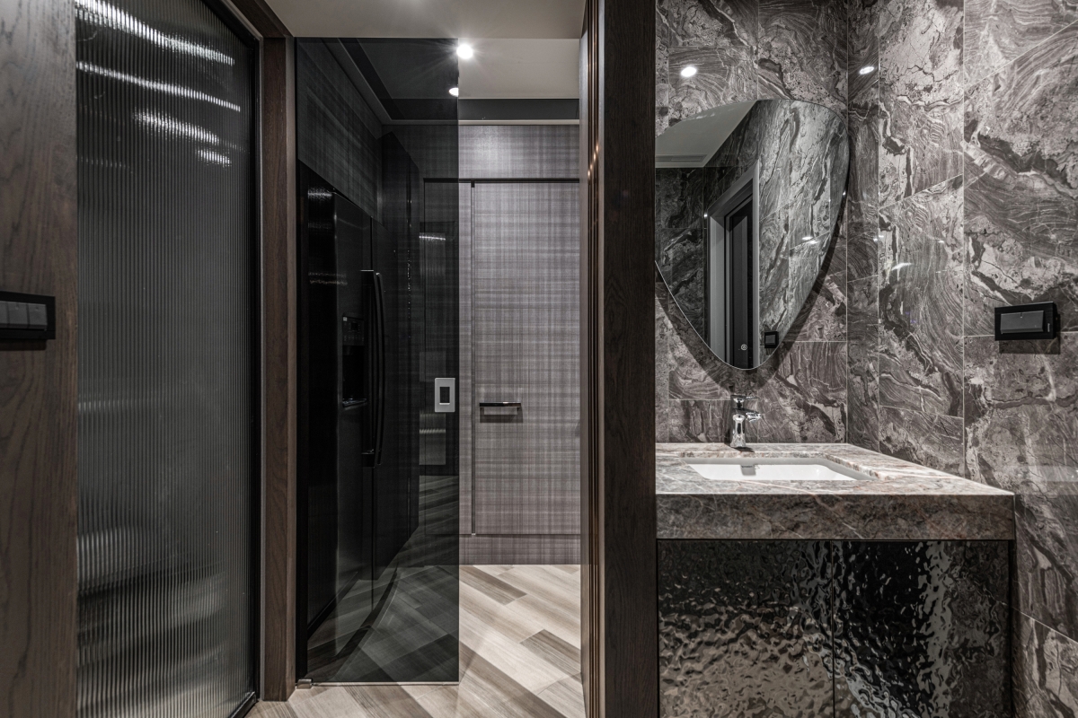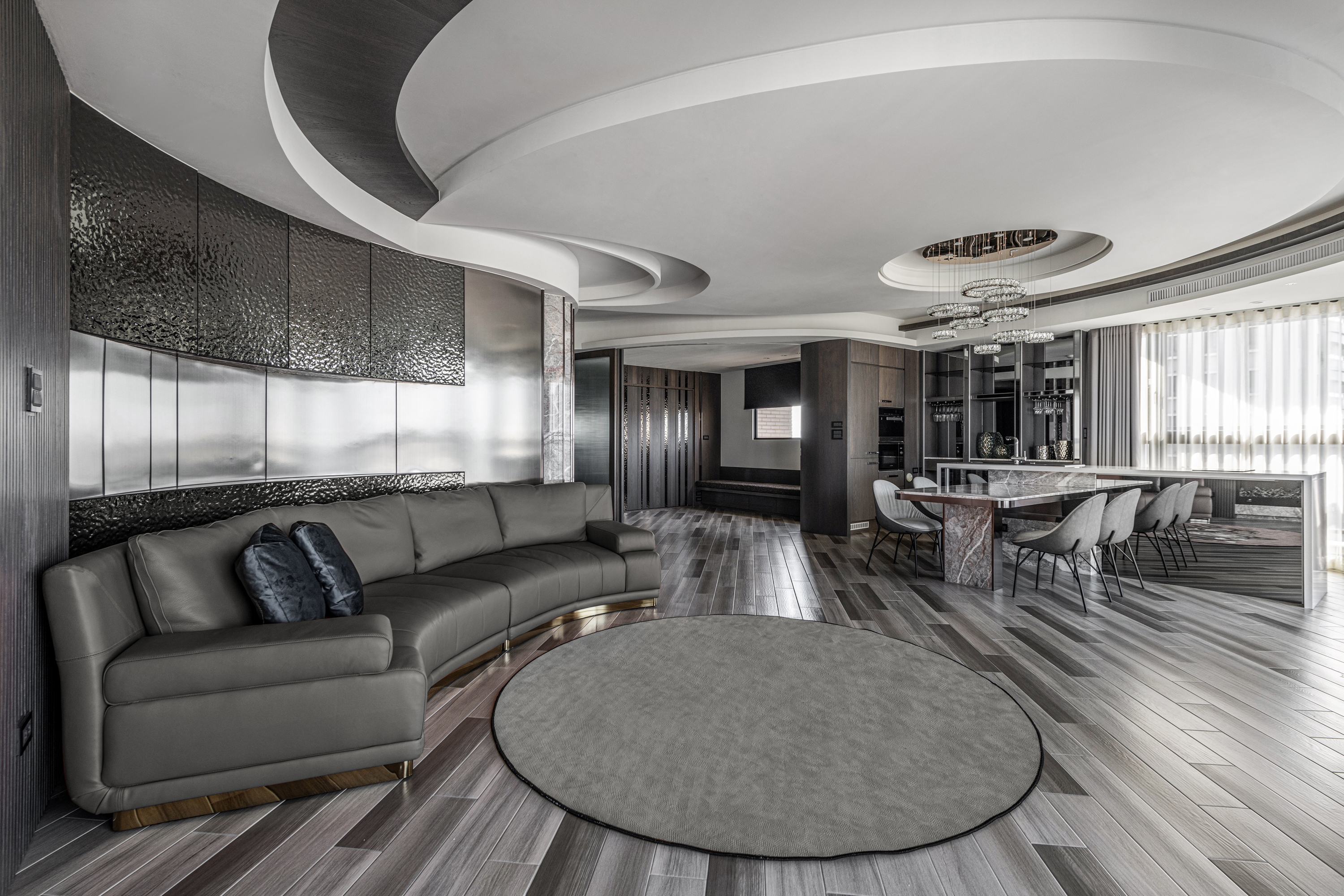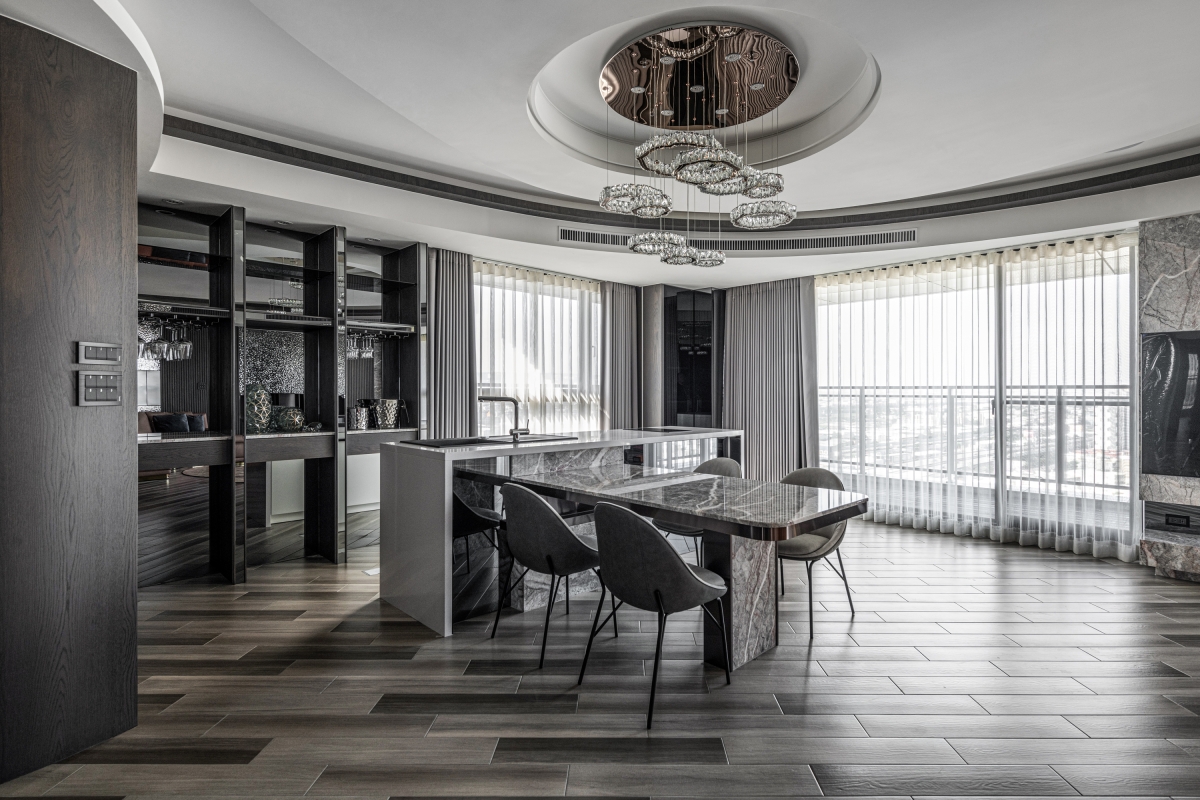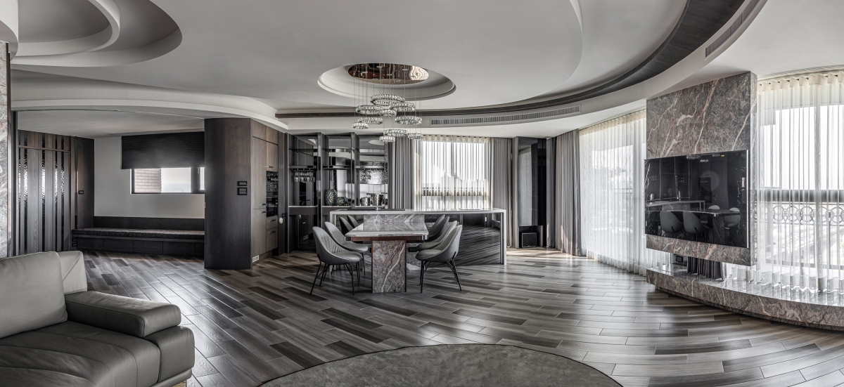 Entry DescriptionGroove comes from the rhythm, which includes the melody of high and low, strength and weakness, and the sense of rhythm that can make people relax, follow the vibe and flow of the music. In this apartment, the designer brings the rhythm of groove dance into the space with irregular curved lines, through the layered curved ceiling and sloping flooring pattern, creating a visual effect of groove in the space. The ceiling is designed with three different heights to improve the oppressiveness brought by the large beams, and to create a sense of visual rhythm on the façade. In terms of space arrangement, the curved circular movement also brings convenience to daily life. Through lighting design and reflection of reflective materials, many white arcs overlap and extend infinitely in the space, creating a natural and lively dance effect and bringing out a modern sense of style. The left side of the master bedroom is also curved to create a gentle embrace around the bed. The bronze metallic material and blue reflective bandage create a dance floor-like effect. At night, with reflected dim light, it gives the space a sense of understated luxury.