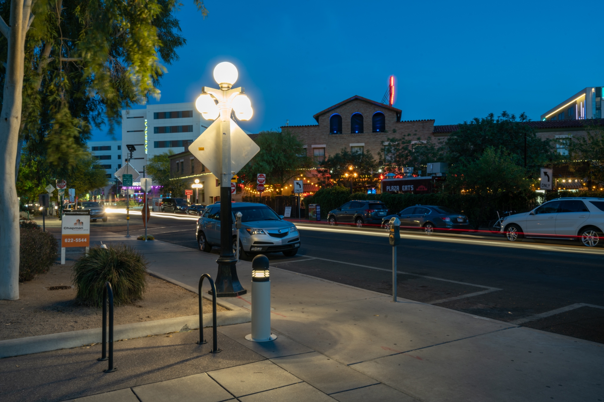By refinishing the historic street poles in an elegant black paint-finish, retrofitting the multi color frosted globes with high grade polyurethane smoked clear globes fitted with 4W dimmable LED retrofit E27 Bulbs, allowed us to meet the Tucson Outdoor Lighting Code and meet the required illuminance levels at eye and street level.