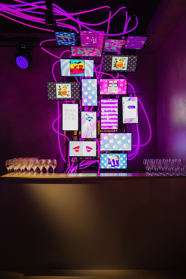 Cybernetic details like neon wires, projections, and multimedia screens supported the image of the online dating service virtual reality.