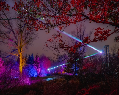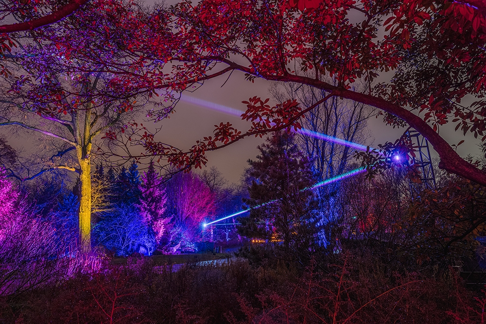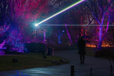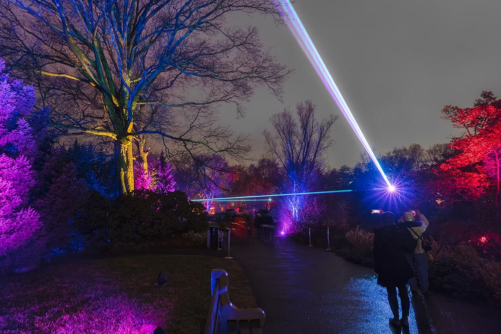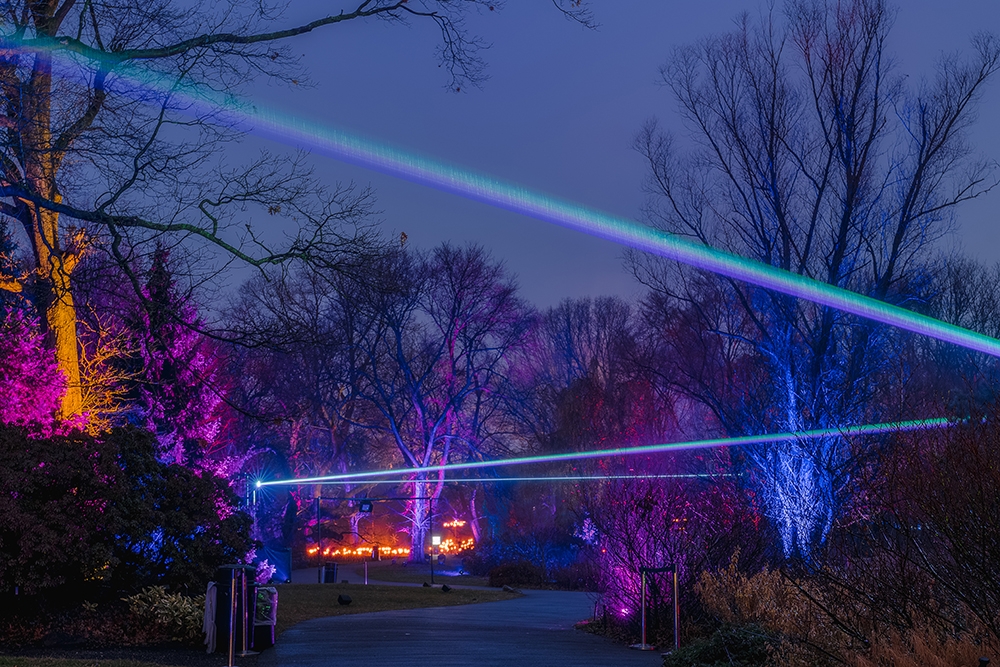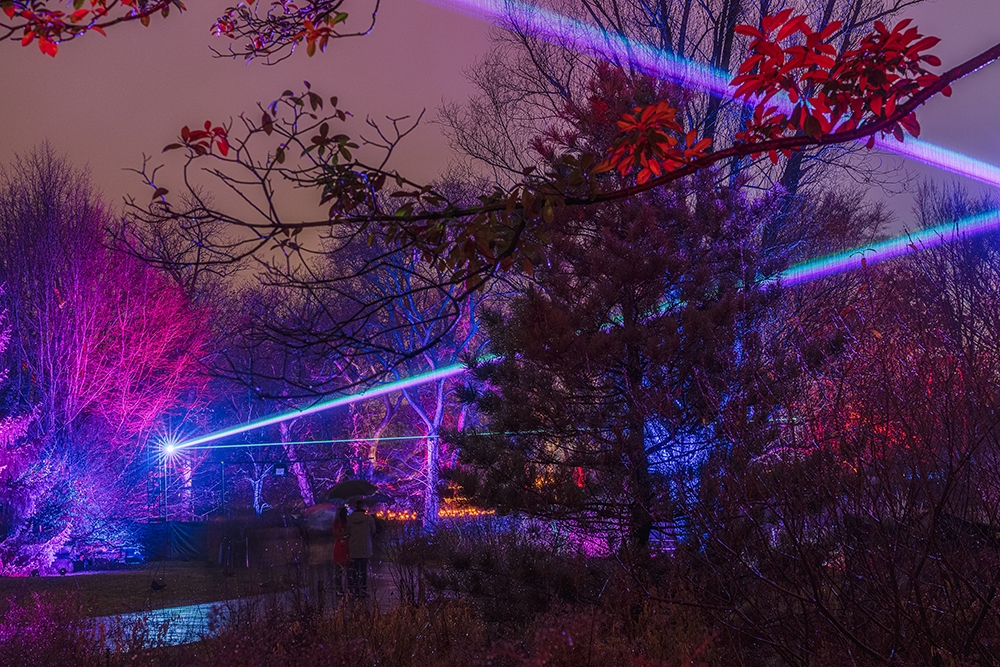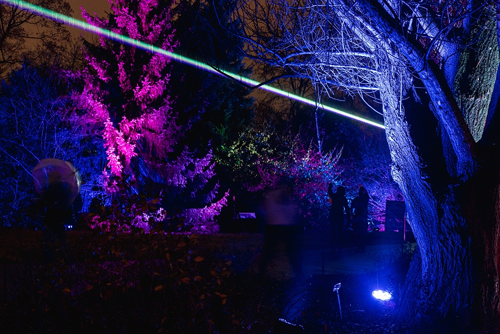 Expanding on the function of botanic gardens as crafted environments for connecting people to nature and drawing inspiration from the natural unseen networks that connect plants, a series of laser pathways illuminates the landscape on winter evenings.
