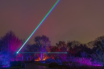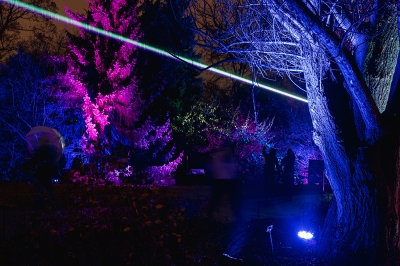 A 33 watt laser beam was bounced off mirrors weaving through the garden.