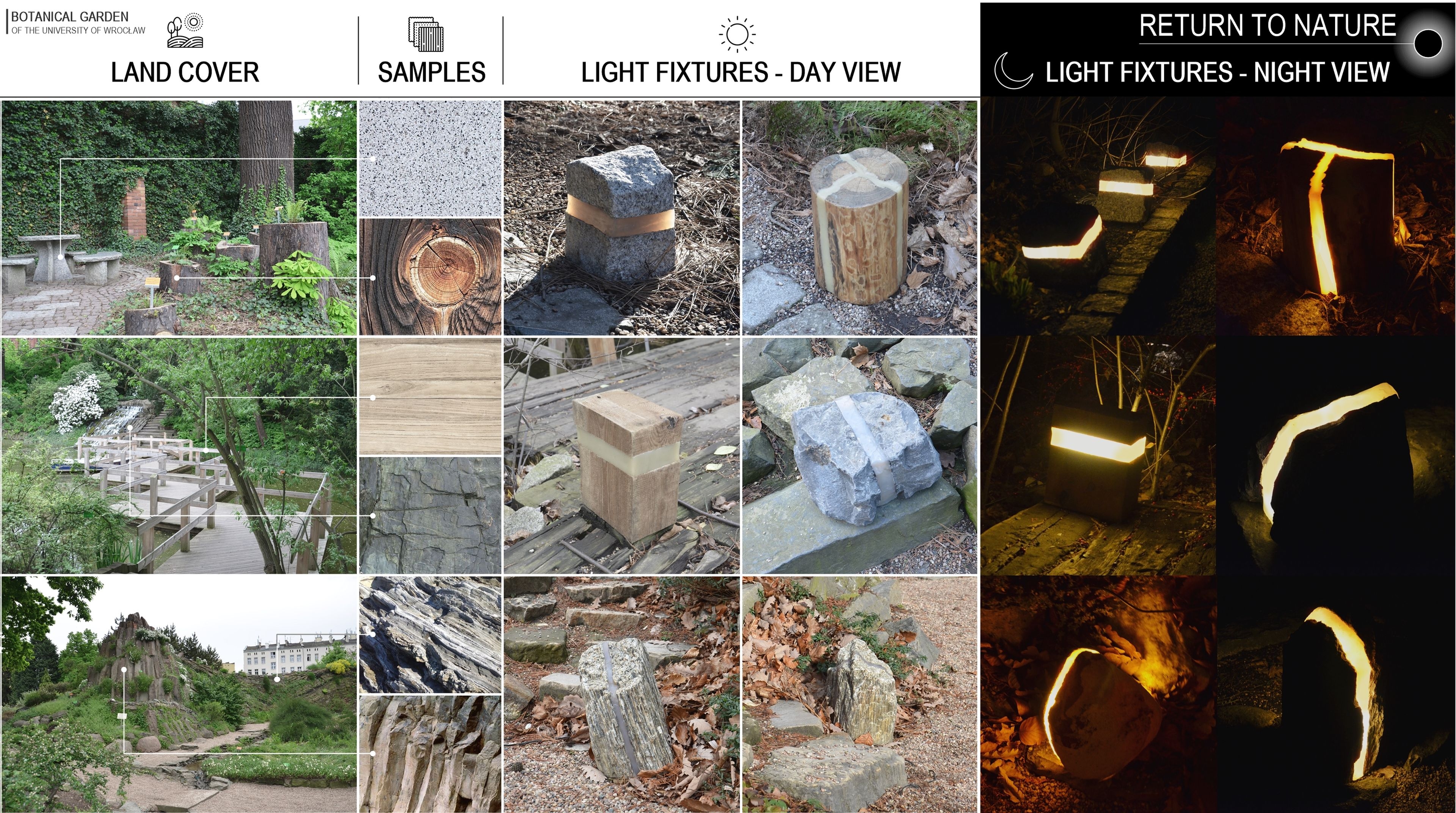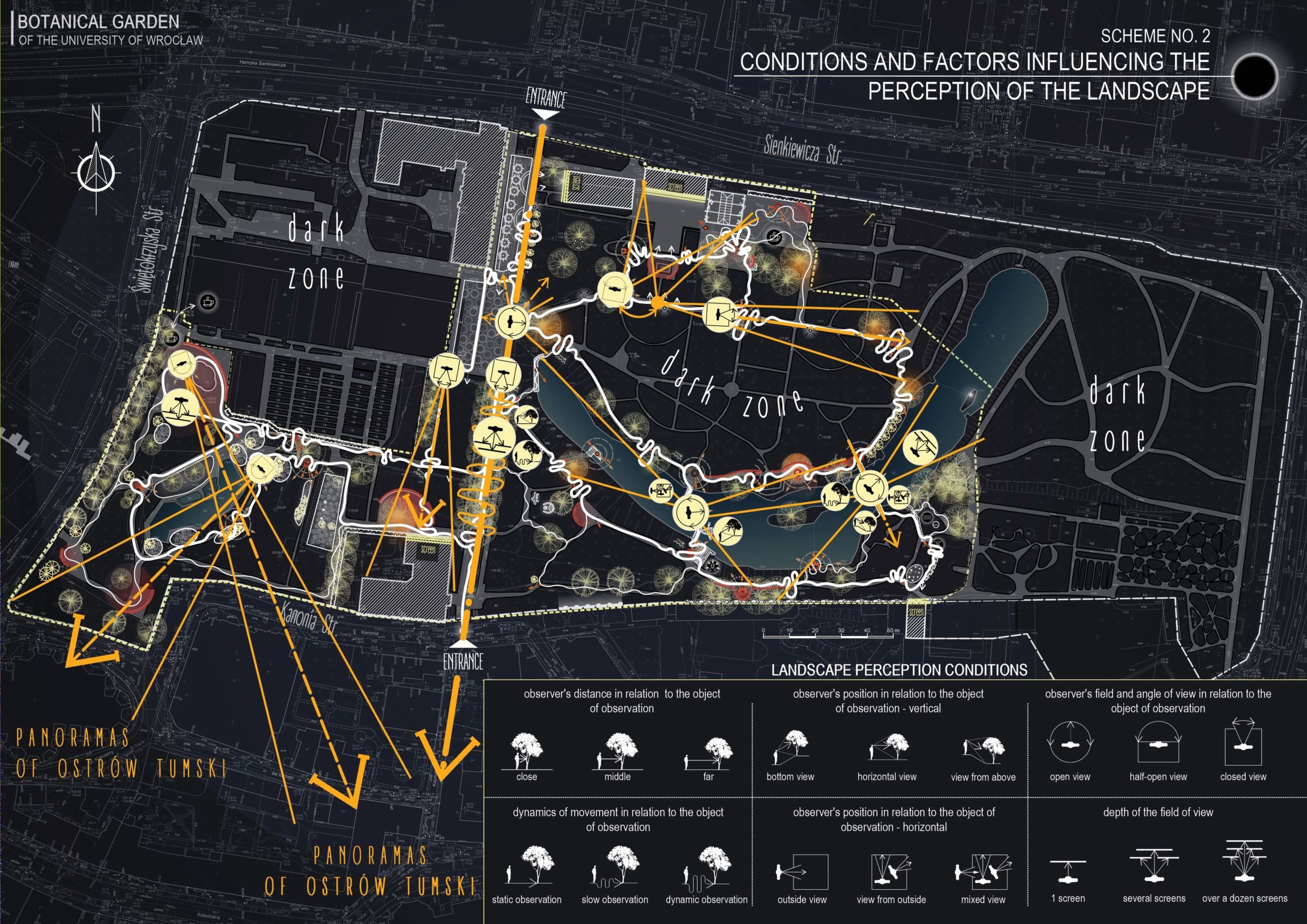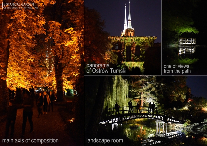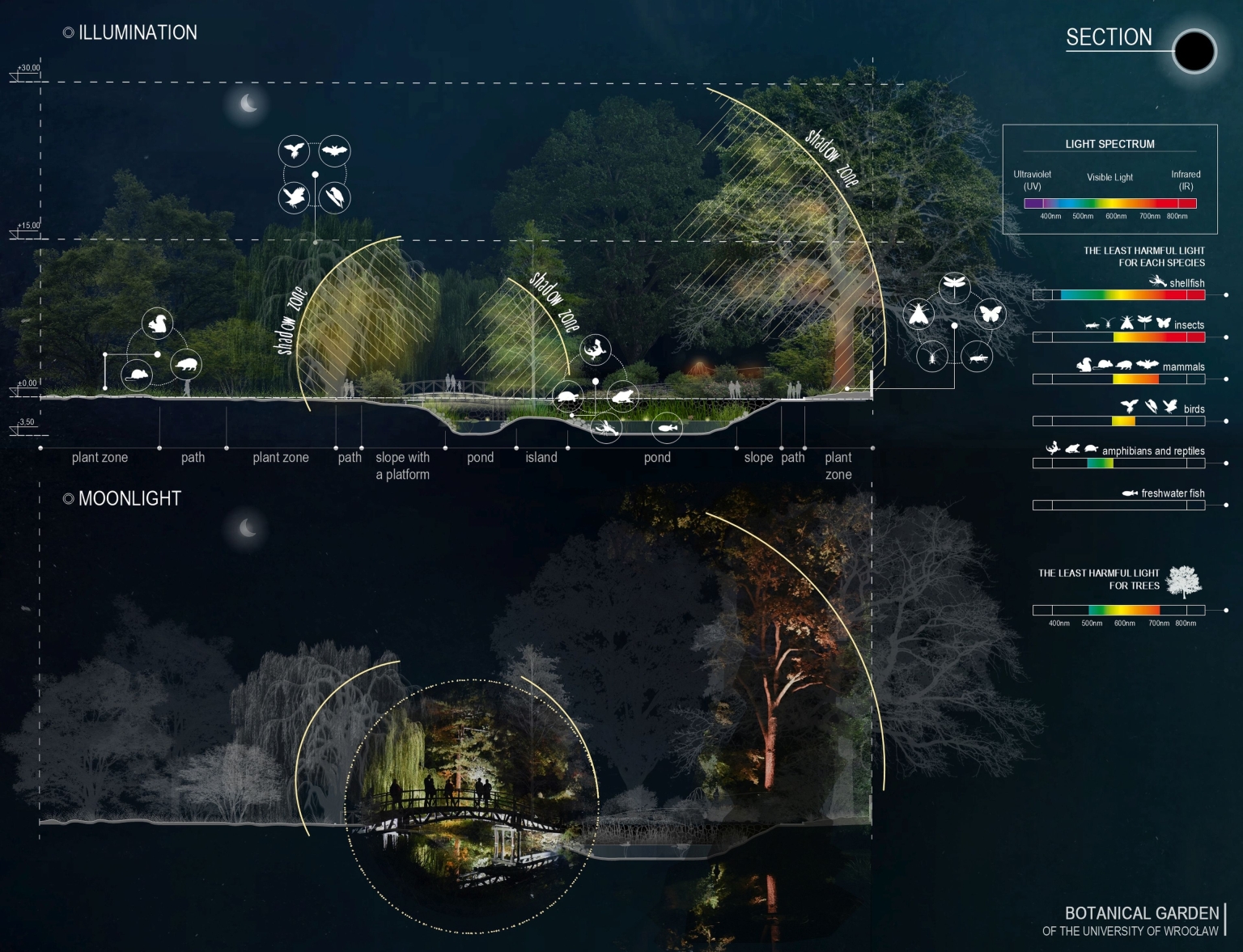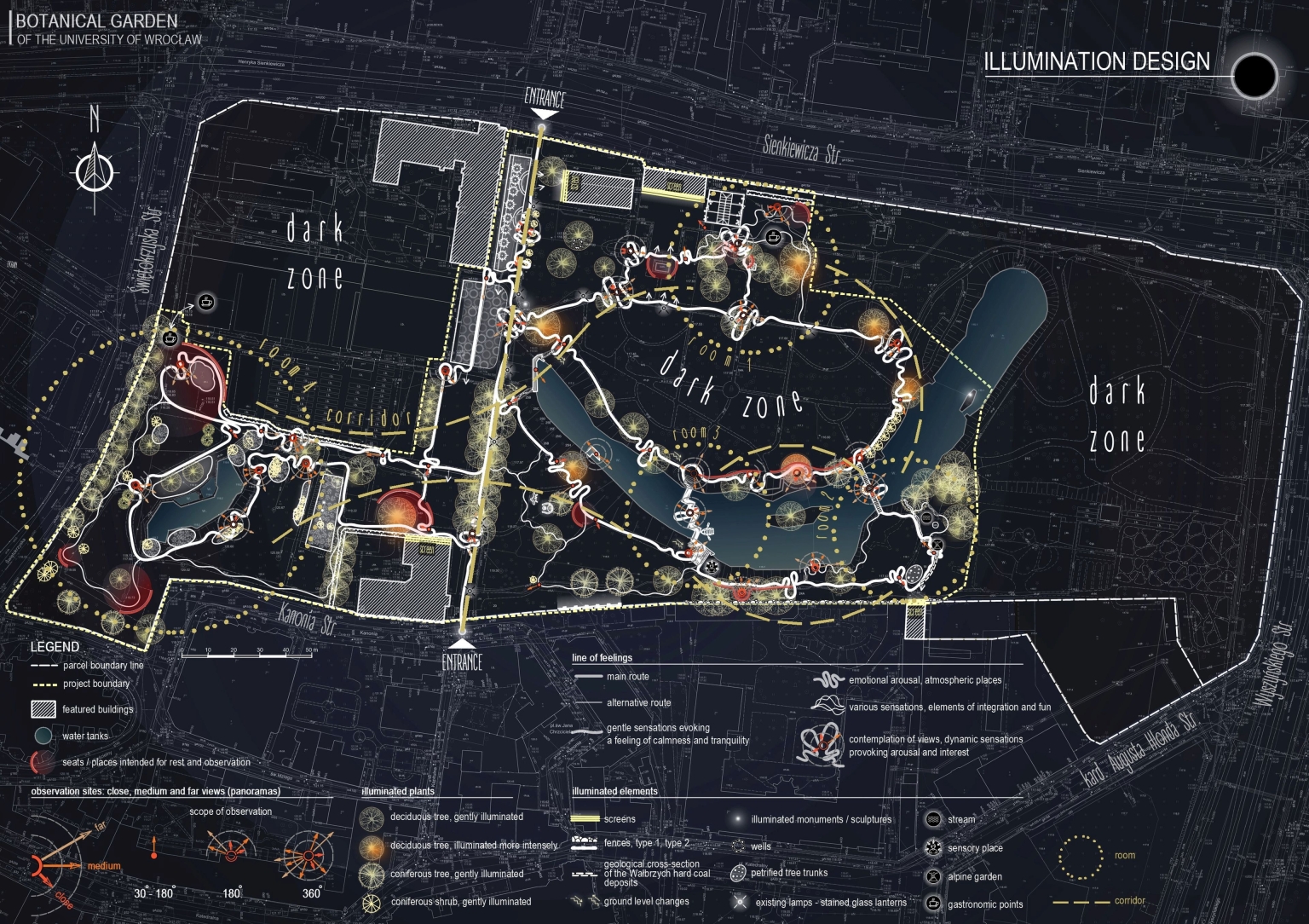 The aesthetics is created by nature itself, which is composed in terms of corridors and rooms of landscapes. Some of them were visually connected to the panoramas of the surrounding monuments to strengthen the perspective and construct structural links between the planes and the illuminated elements. The main purpose of light is to guide the observer according to the line of feeling, designed in the form of a loop. It is the act of landscape perception in harmony with the line of feelings, associated with the overlapping of different brightness levels, gradients, shadows, depth and a hierarchy of planes. The line of feelings is accompanied by mood, which is created primarily through contrast, rhythm and asymmetry. The project shows the city inspired by nature during night time. We have revealed a masterpiece of nature that can be discovered in every city - if not on the Botanical Garden scale then, at least, on the scale of a park fragment, a square or a single tree.