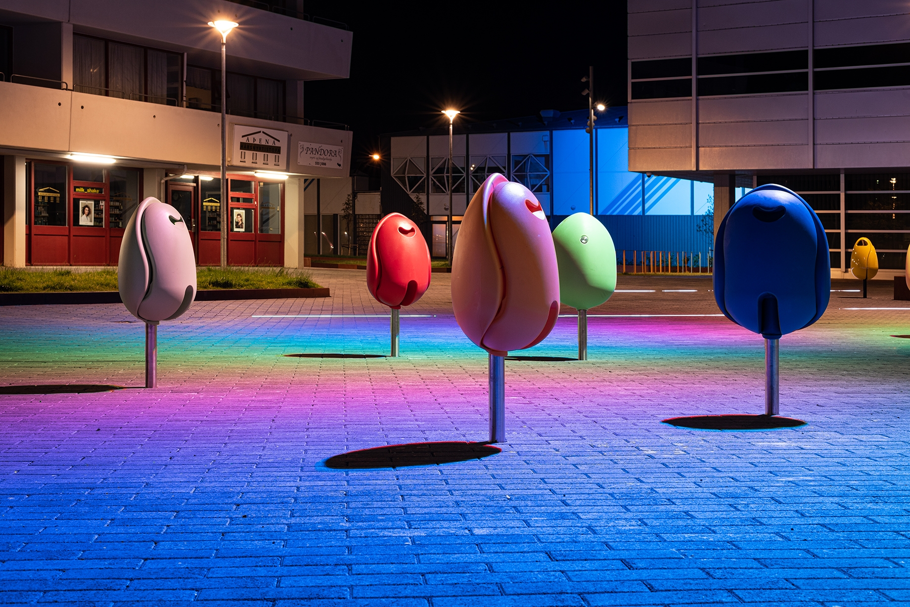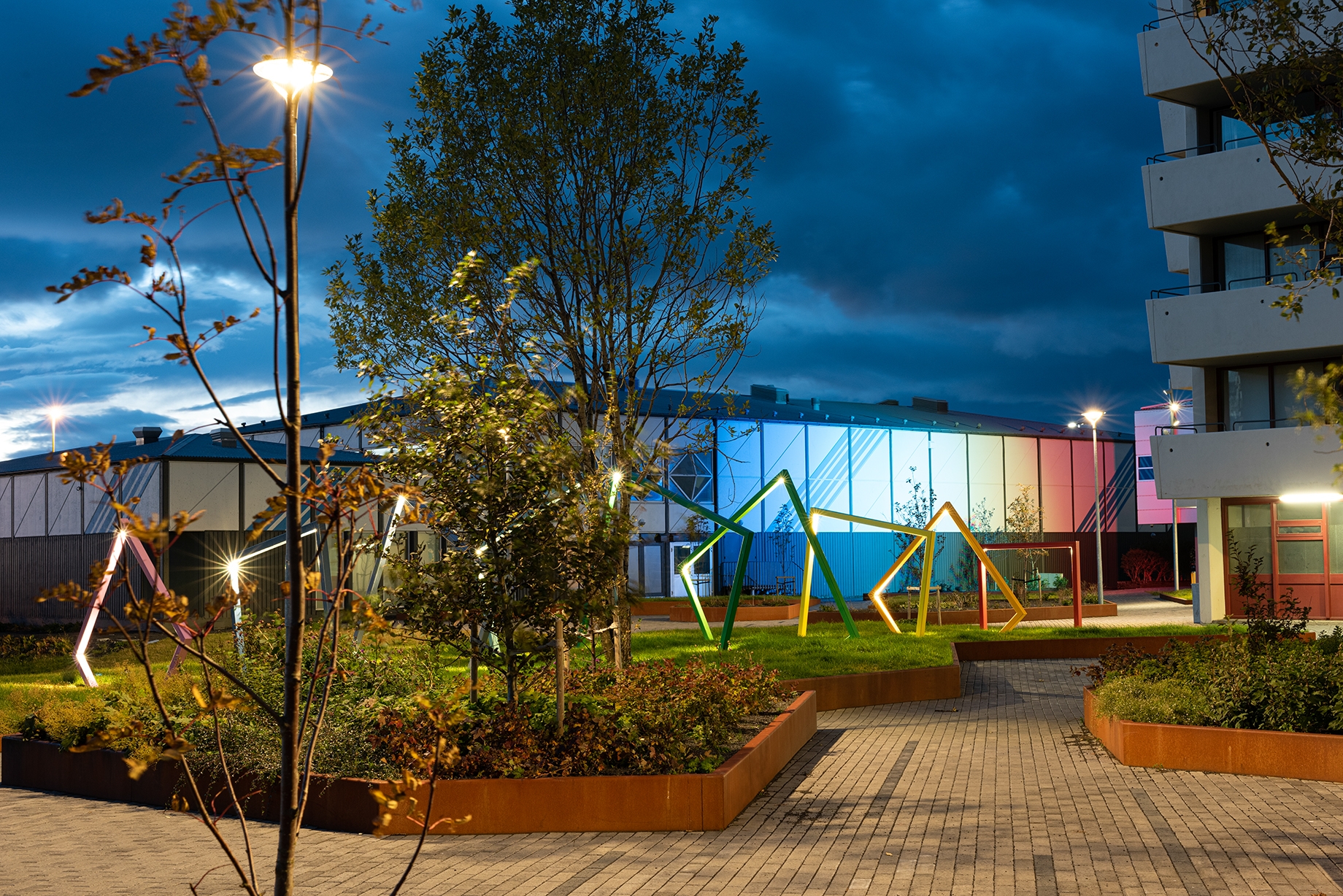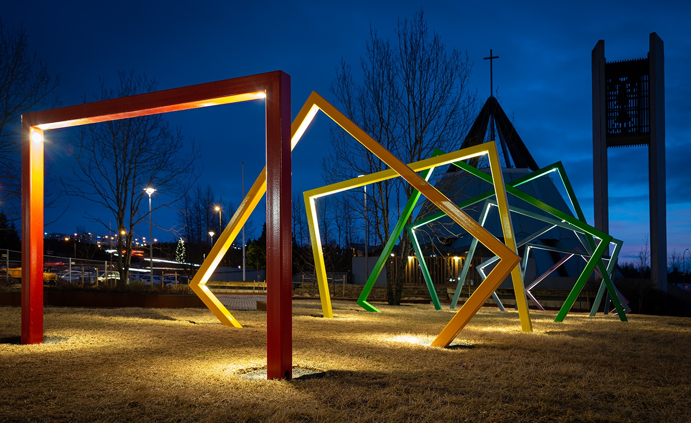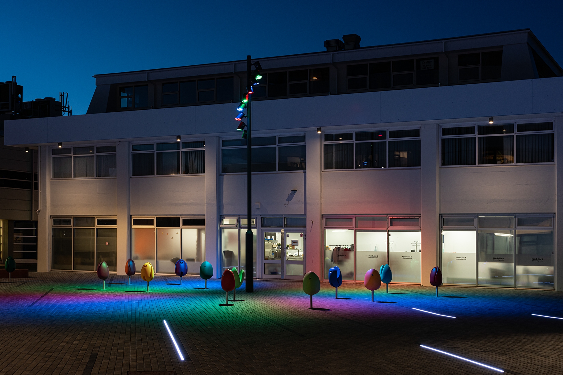 Entry DescriptionThe project consists of three adjacent squares in area which is an important meeting place. Lighting was upgraded on the squares and adjacent paths by careful selection of lighting fixtures to increase safety and visual comfort. Lighting was also optimized to create an interactive visual experience using RGB lights, light art projections, and a sculpture with integrated lighting. The main goal of the sculpture was to create a landmark which would encourage people of all ages to engage and to be enjoyed during day and night. The lighting design also consists of under bench lighting, RGB lighting on trees to create vivid shadow projections on adjacent facades, and inground lighting programmed to change colour based on national holidays and events. Colorful seats in the shapes of tulips have been placed at the most sunlit locations. As night falls, RGB lights flood the area, turning visitors and urban furniture into art. One of the lighting masts is equipped with a 32 amp event receptacle which offers possibility for easy set-up of events and gatherings. Finally, in collaboration with Reykjavik Art Museum, artwork is projected on an entrance door on one of the squares.
