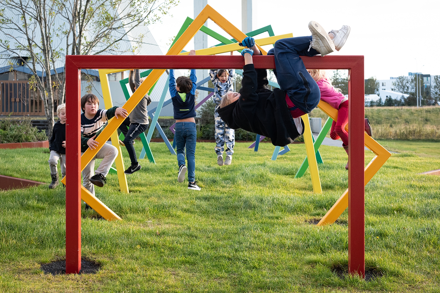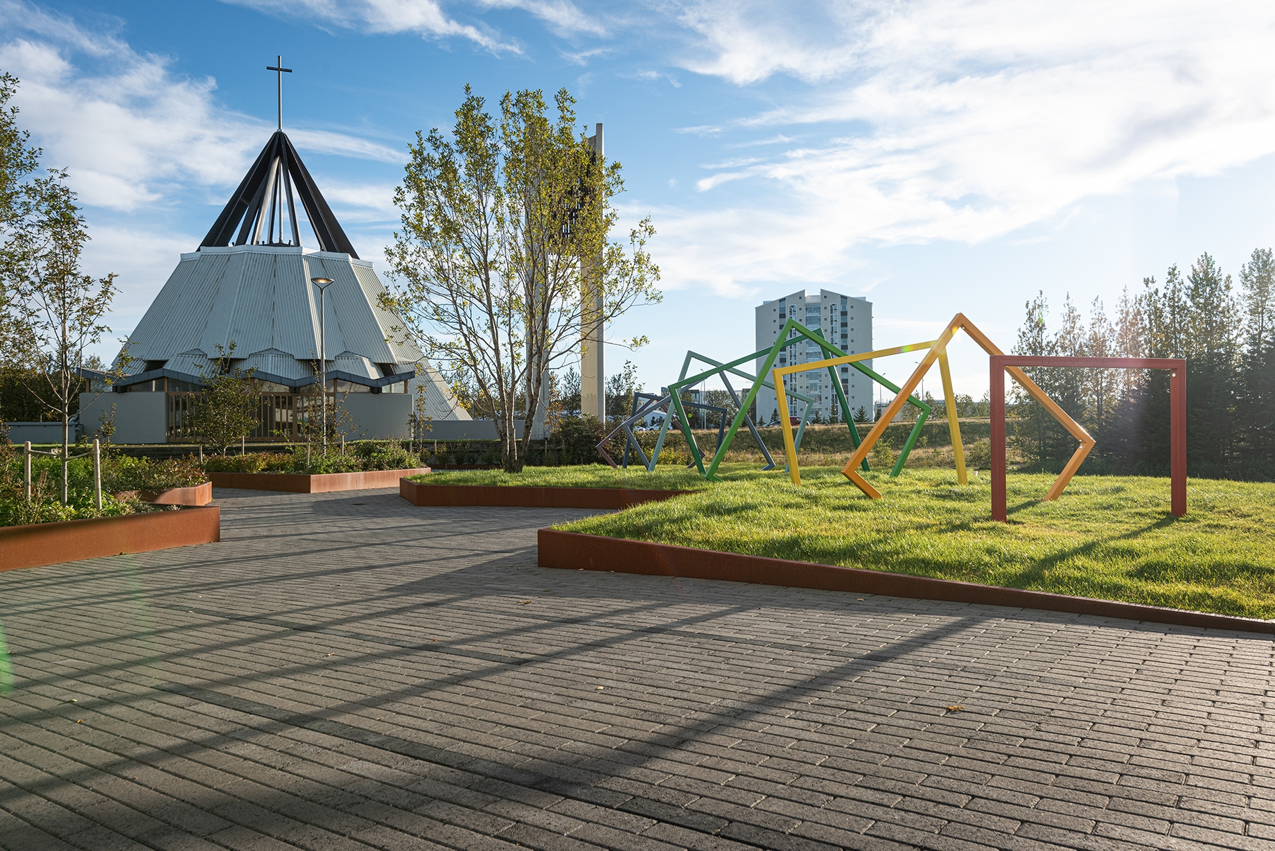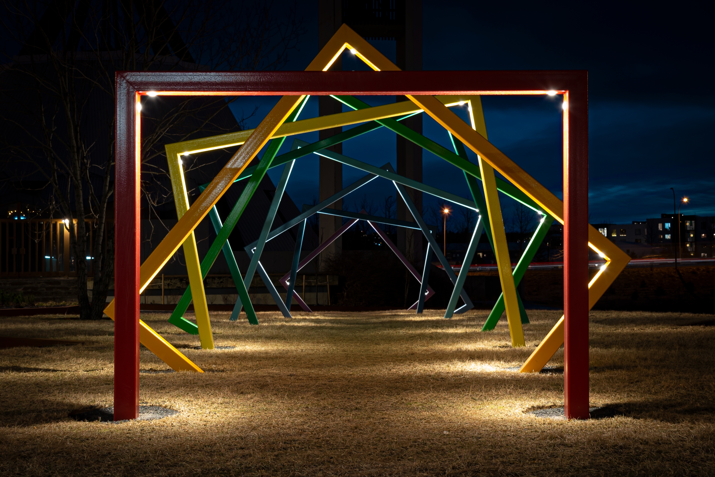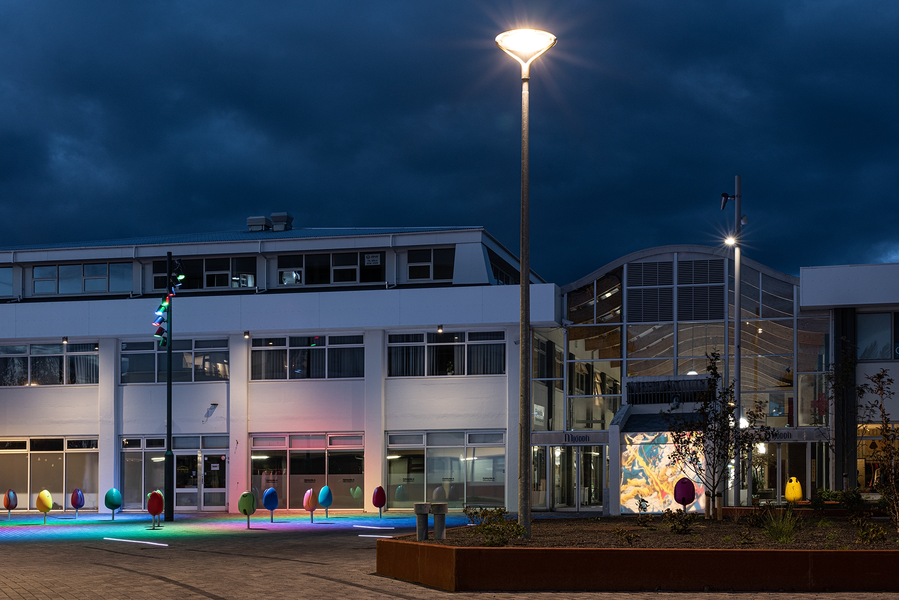 Entry DescriptionThe project consists of three adjacent squares in area which is an important meeting place. Lighting was upgraded on the squares and adjacent paths by careful selection of lighting fixtures to increase safety and visual comfort. Lighting was also optimized to create an interactive visual experience using RGB lights, light art projections, and a sculpture with integrated lighting. The main goal of the sculpture was to create a landmark which would encourage people of all ages to engage and to be enjoyed during day and night. The lighting design also consists of under bench lighting, RGB lighting on trees to create vivid shadow projections on adjacent facades, and inground lighting programmed to change colour based on national holidays and events. Colorful seats in the shapes of tulips have been placed at the most sunlit locations. As night falls, RGB lights flood the area, turning visitors and urban furniture into art. One of the lighting masts is equipped with a 32 amp event receptacle which offers possibility for easy set-up of events and gatherings. Finally, in collaboration with Reykjavik Art Museum, artwork is projected on an entrance door on one of the squares.