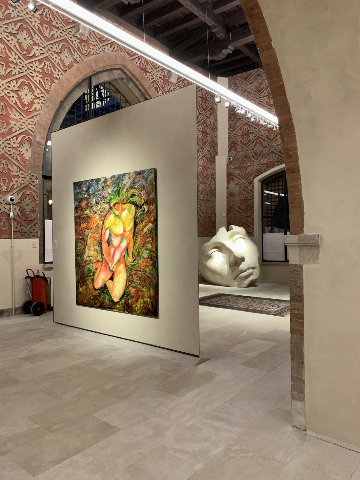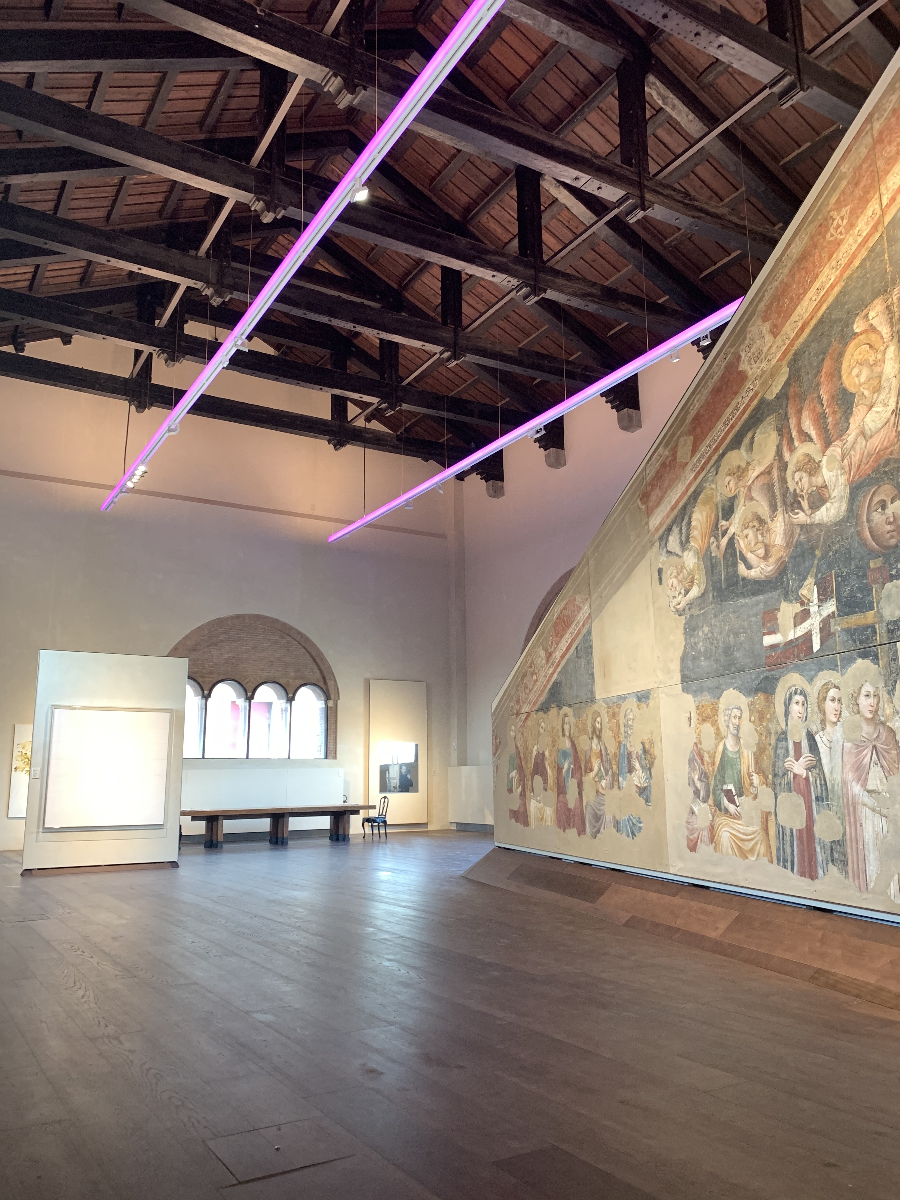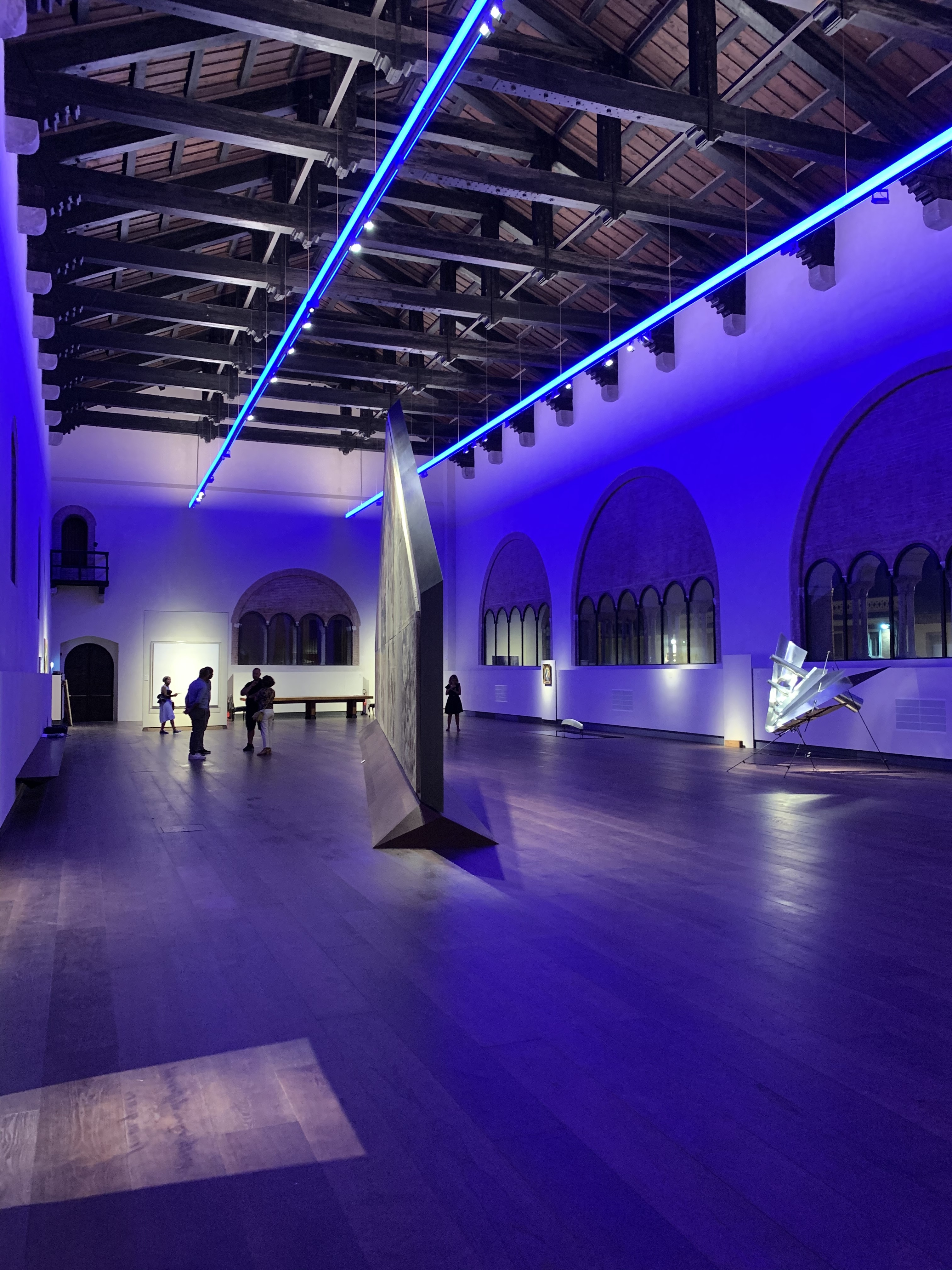 The lighting design of Arengo and Podestà Palaces, Contemporary Art Museum in the city of RIMINI, has been developped following the exhibit design of the Italian studio AR.CH.IT. The general focus of the design phase is both oriented towards the art collection donated to San Patrignano and the architectural significance of remarkable 12th and 13th century palaces. Responding to functional and formal issues a customized suspended linear luminaire has been designed and engineered including an integrated projector trackline and lateral diffusing surfaces, both sides, with dimmable and dynamic white options besides the opportunity to conceive coloured longitudinal lines into the space.