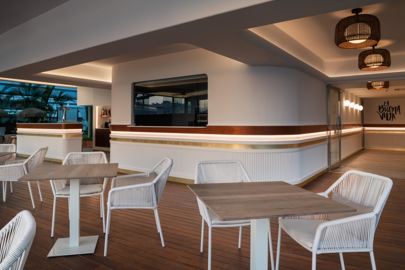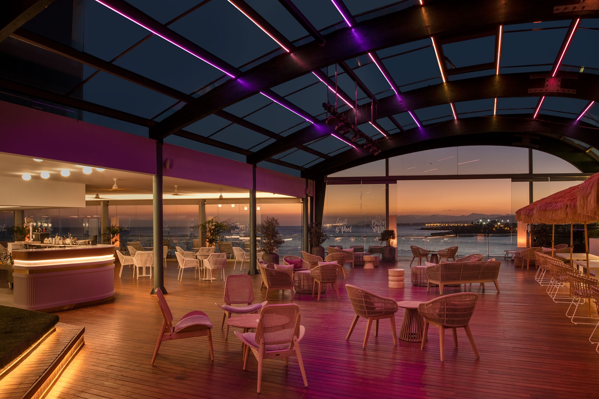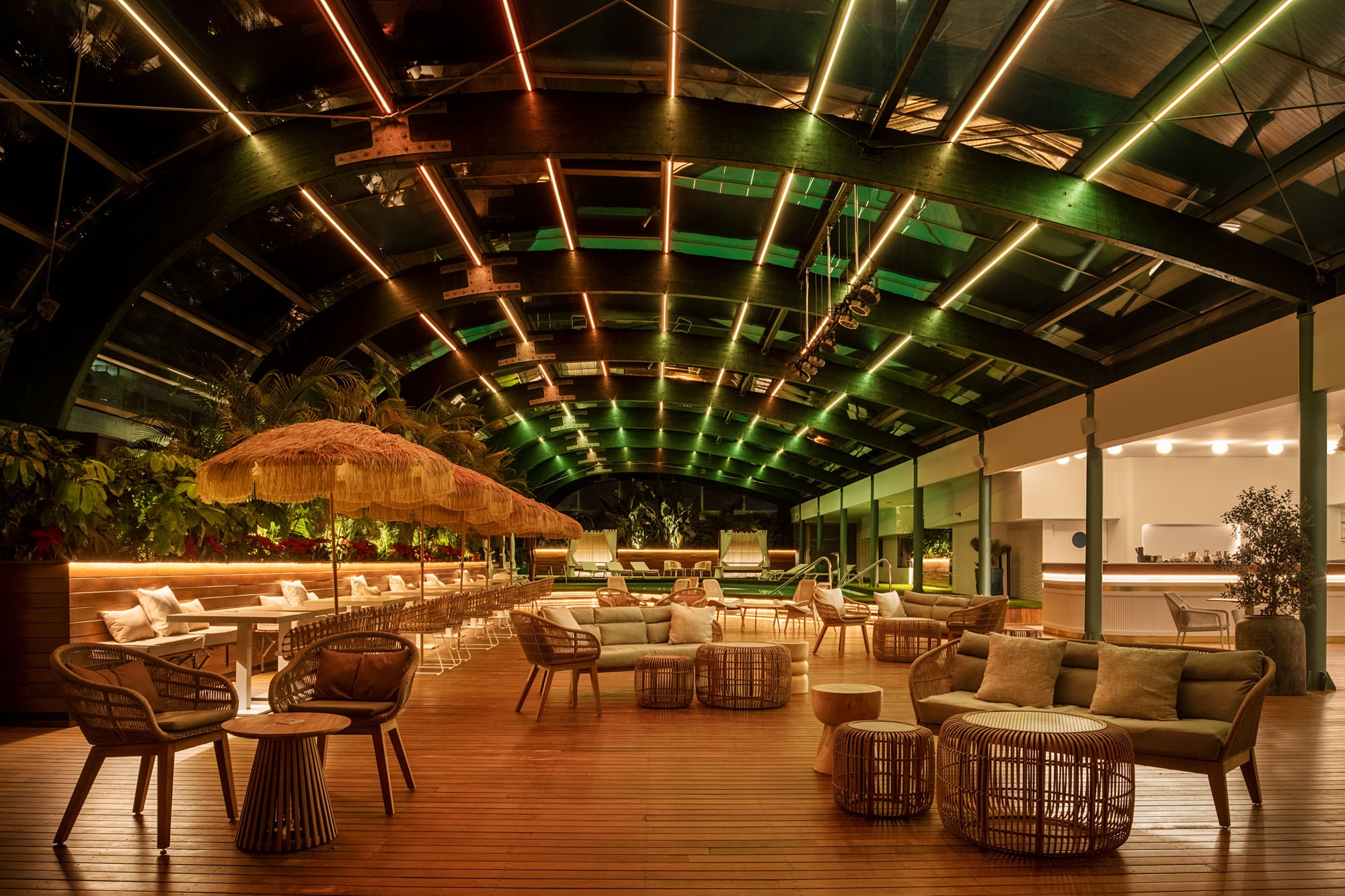 The Pool-Bar was carried out under two lighting strategies that coexist with each other. One: to capture the beautiful sunset and bring it into the space through dynamic Tunable White lighting that changes colour temperature to the rhythm of the sunset. And two: once the sun has gone down the glass dome is transformed into a display of RGB colours, with a final scene of a deep blue sky full of shooting stars that run and flash along the dome.