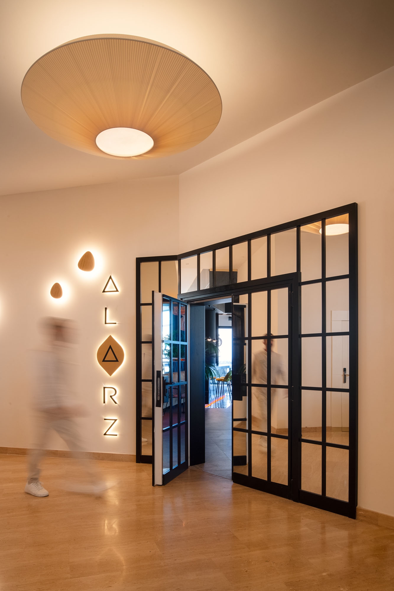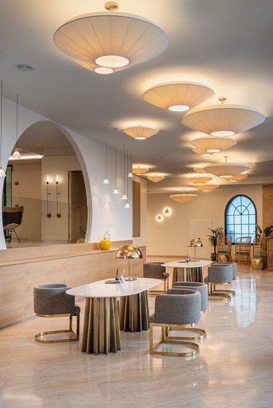 In the lobby, a large pendant luminaire articulates and manages the space.In the reception, a warm tone is the protagonist.