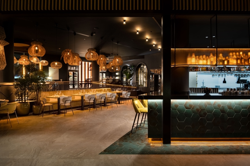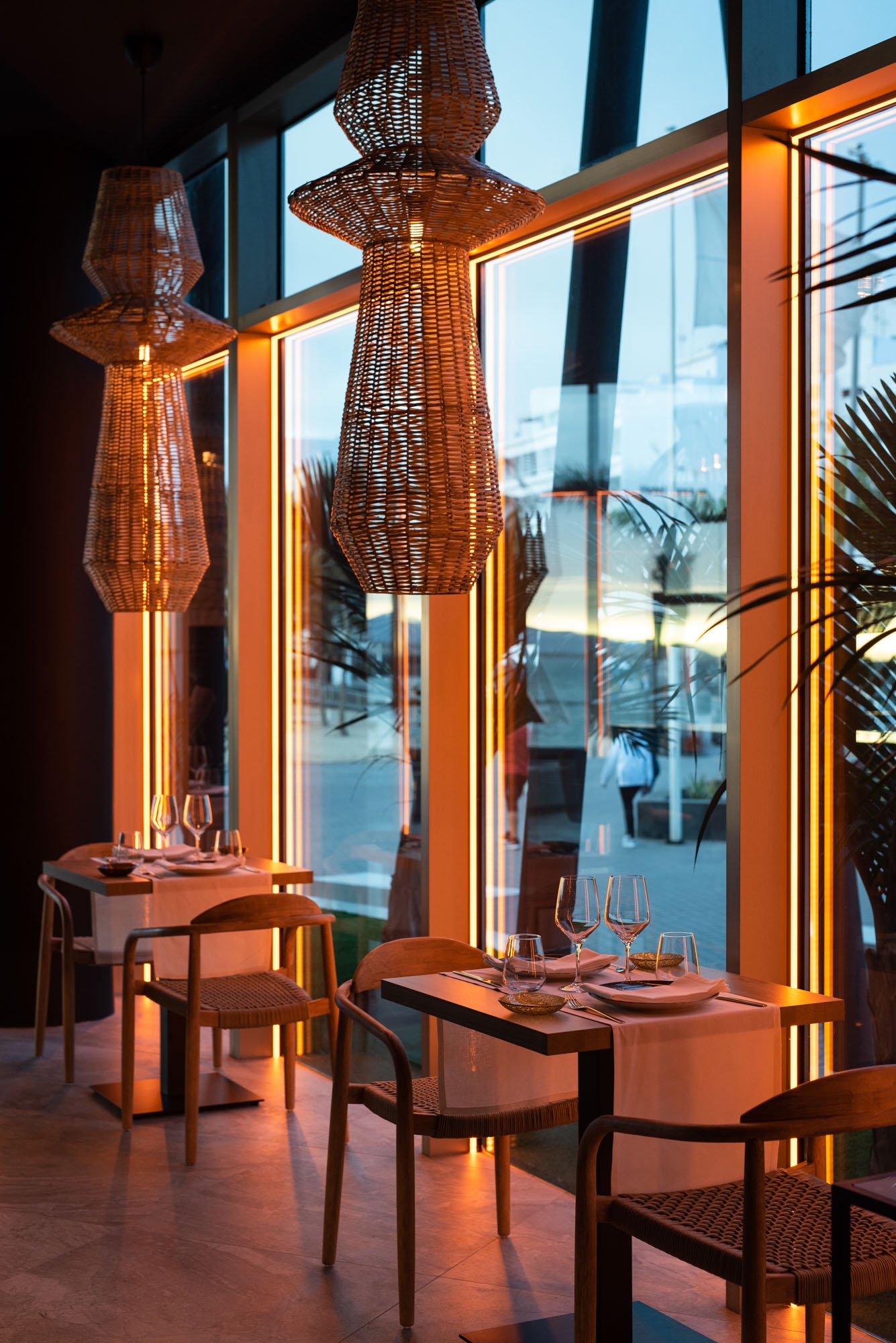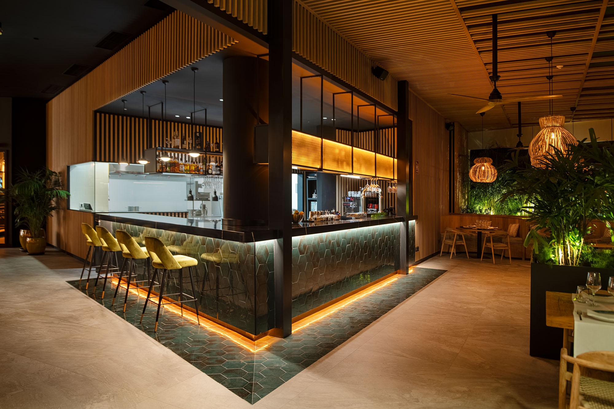 The entrance to the restaurant from the hotel lobby is concealed behind a panelled metal door that reflects the surrounding space to emphasise the surprise effect of discovering its interior.The lighting strategy is based on the use of indirect linear lights as the project’s narrative discourse. An environment of intimate corners with predominantly 1800K colour temperatures. In this way, light and nature merge into a single concept that amplifies our emotions to achieve the most enjoyable gastronomic pleasure.