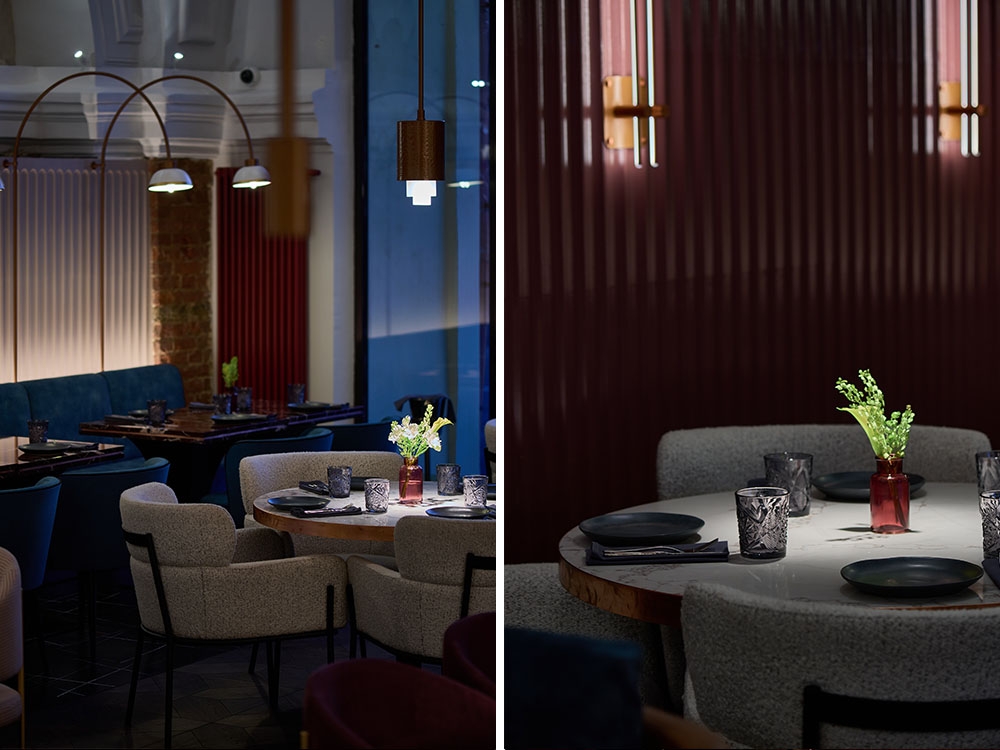 Pendants equipped with professional narrow beam lamps create the appropriate lighting for the spectacular serving and guests’ comfort. Hidden light sources inside furniture support the visual purity. The control system helps to create the right atmosphere.